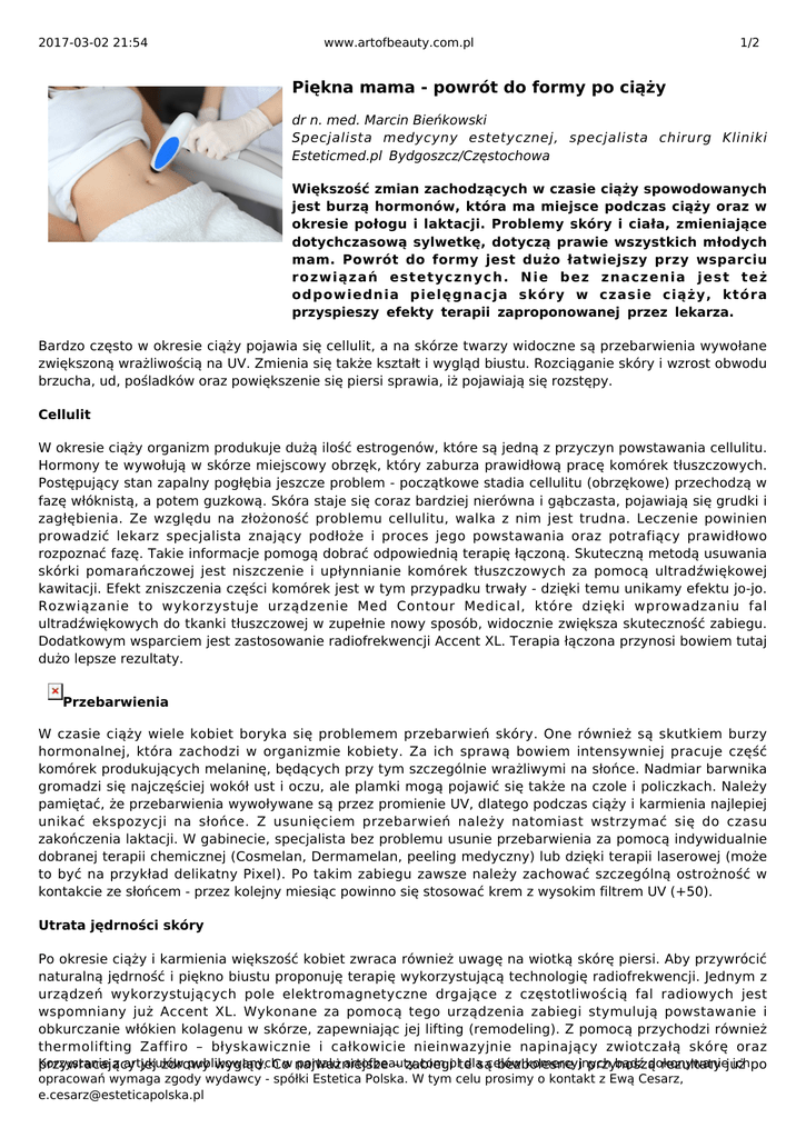 2017-03-02 21:54 www.artofbeauty.com.pl 1/2 Piękna mama - powrót do formy po ciąży dr n. med. Marcin Bieńkowski Specjalista medycyny estetycznej, specjalista chirurg Kliniki Esteticmed.pl Bydgoszcz/Częstochowa Większość zmian zachodzących w czasie ciąży spowodowanych jest burzą hormonów, która ma miejsce podczas ciąży oraz w okresie połogu i laktacji. Problemy skóry i ciała, zmieniające dotychczasową sylwetkę, dotyczą prawie wszystkich młodych mam. Powrót do formy jest dużo łatwiejszy przy wsparciu rozwiązań estetycznych. Nie bez znaczenia jest też odpowiednia pielęgnacja skóry w czasie ciąży, która przyspieszy efekty terapii zaproponowanej przez lekarza. Bardzo często w okresie ciąży pojawia się cellulit, a na skórze twarzy widoczne są przebarwienia wywołane zwiększoną wrażliwością na UV. Zmienia się także kształt i wygląd biustu. Rozciąganie skóry i wzrost obwodu brzucha, ud, pośladków oraz powiększenie się piersi sprawia, iż pojawiają się rozstępy. Cellulit W okresie ciąży organizm produkuje dużą ilość estrogenów, które są jedną z przyczyn powstawania cellulitu. Hormony te wywołują w skórze miejscowy obrzęk, który zaburza prawidłową pracę komórek tłuszczowych. Postępujący stan zapalny pogłębia jeszcze problem - początkowe stadia cellulitu (obrzękowe) przechodzą w fazę włóknistą, a potem guzkową. Skóra staje się coraz bardziej nierówna i gąbczasta, pojawiają się grudki i zagłębienia. Ze względu na złożoność problemu cellulitu, walka z nim jest trudna. Leczenie powinien prowadzić lekarz specjalista znający podłoże i proces jego powstawania oraz potrafiący prawidłowo rozpoznać fazę. Takie informacje pomogą dobrać odpowiednią terapię łączoną. Skuteczną metodą usuwania skórki pomarańczowej jest niszczenie i upłynnianie komórek tłuszczowych za pomocą ultradźwiękowej kawitacji. Efekt zniszczenia części komórek jest w tym przypadku trwały - dzięki temu unikamy efektu jo-jo. Rozwiązanie to wykorzystuje urządzenie Med Contour Medical, które dzięki wprowadzaniu fal ultradźwiękowych do tkanki tłuszczowej w zupełnie nowy sposób, widocznie zwiększa skuteczność zabiegu. Dodatkowym wsparciem jest zastosowanie radiofrekwencji Accent XL. Terapia łączona przynosi bowiem tutaj dużo lepsze rezultaty. Przebarwienia W czasie ciąży wiele kobiet boryka się problemem przebarwień skóry. One również są skutkiem burzy hormonalnej, która zachodzi w organizmie kobiety. Za ich sprawą bowiem intensywniej pracuje część komórek produkujących melaninę, będących przy tym szczególnie wrażliwymi na słońce. Nadmiar barwnika gromadzi się najczęściej wokół ust i oczu, ale plamki mogą pojawić się także na czole i policzkach. Należy pamiętać, że przebarwienia wywoływane są przez promienie UV, dlatego podczas ciąży i karmienia najlepiej unikać ekspozycji na słońce. Z usunięciem przebarwień należy natomiast wstrzymać się do czasu zakończenia laktacji. W gabinecie, specjalista bez problemu usunie przebarwienia za pomocą indywidualnie dobranej terapii chemicznej (Cosmelan, Dermamelan, peeling medyczny) lub dzięki terapii laserowej (może to być na przykład delikatny Pixel). Po takim zabiegu zawsze należy zachować szczególną ostrożność w kontakcie ze słońcem - przez kolejny miesiąc powinno się stosować krem z wysokim filtrem UV (+50). Utrata jędrności skóry Po okresie ciąży i karmienia większość kobiet zwraca również uwagę na wiotką skórę piersi. Aby przywrócić naturalną jędrność i piękno biustu proponuję terapię wykorzystującą technologię radiofrekwencji. Jednym z urządzeń wykorzystujących pole elektromagnetyczne drgające z częstotliwością fal radiowych jest wspomniany już Accent XL. Wykonane za pomocą tego urządzenia zabiegi stymulują powstawanie i obkurczanie włókien kolagenu w skórze, zapewniając jej lifting (remodeling). Z pomocą przychodzi również thermolifting Zaffiro – błyskawicznie i całkowicie nieinwazyjnie napinający zwiotczałą skórę oraz Korzystanie z artykułów publikowanych w najważniejsze portalu artofbeauty.com.pl dlasącelów komercyjnych bądź dokonywanie ichpo przywracający jej zdrowy wygląd. Co – zabiegi te bezbolesne i przynoszą rezultaty już opracowań wymaga zgody wydawcy - spółki Estetica Polska. W tym celu prosimy o kontakt z Ewą Cesarz, [email protected] 2017-03-02 21:54 www.artofbeauty.com.pl 2/2 wykonaniu jednej procedury. Rozstępy To najczęstszy problem estetyczny na jaki zwracają uwagę młode mamy. Mało estetyczne prążki powstają na skutek silnego rozciągnięcia skóry w krótkim czasie. W efekcie dochodzi do pęknięć struktury białkowego rusztowania skóry właściwej i powstania nieestetycznych blizn, które nazywamy rozstępami. Chcąc przeciwdziałać ich powstawaniu należy przez cały okres ciąży szczególnie dbać o nawilżenie skóry - trwale widoczne rozstępy nie są możliwe do usunięcia przy wykorzystaniu kosmetyków czy zabiegów kosmetycznych. Są one likwidowane jak blizny - za pomocą rozwiązań laseroterapii, którą łączy się z mezoterapią, roll-citem medycznym i terapią LED. Najlepsze efekty uzyskujemy stosując terapie łączone z udziałem kilku różnych laserów frakcyjnych (na przykład Mosaic eCO2 , Fraxel Re:store DUAL, Pixel Erb:Yag) i plazmy frakcyjnej. Leczenie rozstępów ma większe szanse powodzenia we wczesnych fazach ich rozwoju (tak zwane rozstępy czerwone). Warto także nadmienić, że dzięki złożonej terapii laserowej, lekarz może także usunąć bliznę po cesarskim cięciu. Terapię, która ma na celu usunąć bliznę i rozstępy warto rozpocząć tuż po zakończeniu okresu laktacji. Wcześnie podjęte leczenie przyniesie bowiem największe i najszybsze efekty. Pamiętajmy, że zadaniem medycyny estetycznej jest pomoc w odzyskaniu zdrowego wyglądu skóry i sylwe