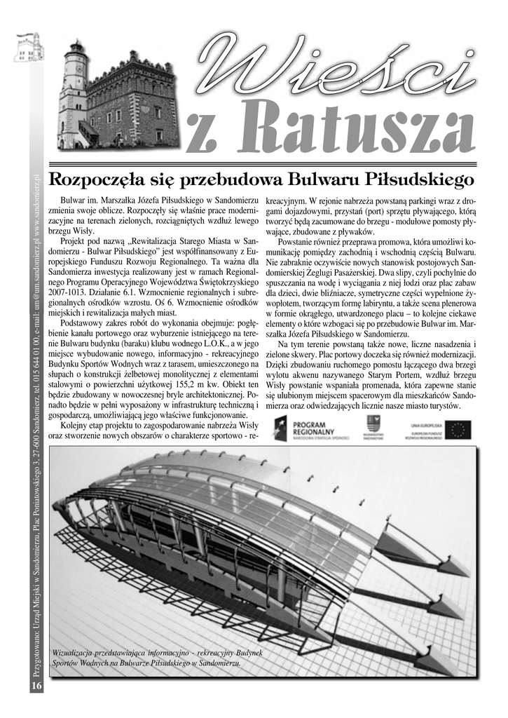 Przygotowano: Urząd Miejski w Sandomierzu, Plac Poniatowskiego 3, 27-600 Sandomierz, tel. 015 644 01 00, e-mail: [email protected] www.sandomierz.pl 16 Rozpoczęła się przebudowa Bulwaru Piłsudskiego Bulwar im. Marszałka Józefa Piłsudskiego w Sandomierzu zmienia swoje oblicze. Rozpoczęły się właśnie prace modernizacyjne na terenach zielonych, rozciągniętych wzdłuż lewego brzegu Wisły. Projekt pod nazwą „Rewitalizacja Starego Miasta w Sandomierzu - Bulwar Piłsudskiego” jest współfinansowany z Europejskiego Funduszu Rozwoju Regionalnego. Ta ważna dla Sandomierza inwestycja realizowany jest w ramach Regionalnego Programu Operacyjnego Województwa Świętokrzyskiego 2007-1013. Działanie 6.1. Wzmocnienie regionalnych i subregionalnych ośrodków wzrostu. Oś 6. Wzmocnienie ośrodków miejskich i rewitalizacja małych miast. Podstawowy zakres robót do wykonania obejmuje: pogłębienie kanału portowego oraz wyburzenie istniejącego na terenie Bulwaru budynku (baraku) klubu wodnego L.O.K., a w jego miejsce wybudowanie nowego, informacyjno - rekreacyjnego Budynku Sportów Wodnych wraz z tarasem, umieszczonego na słupach o konstrukcji żelbetowej monolitycznej z elementami stalowymi o powierzchni użytkowej 155,2 m kw. Obiekt ten będzie zbudowany w nowoczesnej bryle architektonicznej. Ponadto będzie w pełni wyposażony w infrastrukturę techniczną i gospodarczą, umożliwiającą jego właściwe funkcjonowanie. Kolejny etap projektu to zagospodarowanie nabrzeża Wisły oraz stworzenie nowych obszarów o charakterze sportowo - re- Wizualizacja przedstawiająca informacyjno - rekreacyjny Budynek Sportów Wodnych na Bulwarze Piłsudskiego w Sandomierzu. kreacyjnym. W rejonie nabrzeża powstaną parkingi wraz z drogami dojazdowymi, przystań (port) sprzętu pływającego, którą tworzyć będą zacumowane do brzegu - modułowe pomosty pływające, zbudowane z pływaków. Powstanie również przeprawa promowa, która umożliwi komunikację pomiędzy zachodnią i wschodnią częścią Bulwaru. Nie zabraknie oczywiście nowych stanowisk postojowych Sandomierskiej Żeglugi Pasażerskiej. Dwa slipy, czyli pochylnie do spuszczania na wodę i wyciągania z niej łodzi oraz plac zabaw dla dzieci, dwie bliźniacze, symetryczne części wypełnione żywopłotem, tworzącym formę labiryntu, a także scena plenerowa w formie okrągłego, utwardzonego placu – to kolejne ciekawe elementy o które wzbogaci się po przebudowie Bulwar im. Marszałka Józefa Piłsudskiego w Sandomierzu. Na tym terenie powstaną także nowe, liczne nasadzenia i zielone skwery. Plac portowy doczeka się również modernizacji. Dzięki zbudowaniu ruchomego pomostu łączącego dwa brzegi wylotu akwenu nazywanego Starym Portem, wzdłuż brzegu Wisły powstanie wspaniała promenada, która zapewne stanie się ulubionym miejscem spacerowym dla mieszkańców Sandomierza oraz odwiedzających licznie nasze miasto turystów. Z okazji Dnia Edukacji Narodowej w Sali Rycerskiej sandomierskiego Zamku w dniu 13 października 2009 roku odbyła się uroczystość wręczenia awansów zawodowych oraz nagród wyróżniającym się nauczycielom. Podczas spotkania Burmistrz Sandomierza Jerzy Borowski nie szczędził pedagogom pochwał za dotychczasową pracę w wychowaniu dzieci i młodzieży. W swoim krótkim wystąpieniu gospodarz Sandomierza życzył świętującym nauczycielom dalszych sukcesów. Potem odbyła się ceremonia wręczenia nagród najlepszym dyrektorom i wyróżniającym się nauczycielom z sandomierskich przedszkoli oraz szkół podstawowych i gimnazjalnych. Nagrody Burmistrza Sandomierza, rozdzielone przez specjalna komisję otrzymali: Waldemar Gosek - dyrektor Szkoły Podstawowej nr 1, Agata Hajduk - dyrektor Przedszkola nr 3, Magdalena Stępień - dyrektor Przedszkola nr 6, Grażyna Mirek - Gimnazjum nr 1, Ewa Jaworowska - Wojna - Gimnazjum nr 2, Joanna Kotowska - Szkoła Podstawowa nr 1, Beata Wojas - Szkoła Podstawowa nr 2, Anna Wrona - Szkoła Podstawowa nr 3, Lidia Gołębiowska - Szkoła Podstawowa nr 4, Tomasz Zieliński - Szkoła Podstawowa nr 4, Renata Pacholczak - Przedszkole nr 5 oraz Grażyna Ostrowska - Przedszkole nr 6. Kolejnym akcentem Dnia Edukacji Narodowej w sandomierskim Zamku było wręczenie awansów zawodowych dla nauczycieli mianowanych. Po złożeniu ślubowania z rąk Burmistrza Sandomierza Jerzego Borowskiego akty mianowania otrzymali: Anna Rybicka - Gimnazjum nr 1, Ewa Jaworowska - Wojna - Gimnazjum nr 2, Jerzy Żyła - Szkoła Podstawowa nr 1, Patrycja Zięba - Szkoła Podstawowa Nr 2 oraz Jacek Gajewski - Szkoła Podstawowa nr 4. Na zakończenie uroczystości w Sali Rycerskiej sandomierskiego Zamku odbył się wspaniały program artystyczny w wykonaniu młodzieży z Gimnazjum nr 2 oraz Zespołu Pieśni i Tańca „Ziemia Sandomierska”. Z okazji Dnia Edukacji Narodowej wszystkim nauczycielom i pracownikom oświaty składamy najlepsze życzenia! Nagrodzeni i wyróżnieni nauczyciele z sandomierskich szkół i przedszkoli podczas uroczystości w Zamku. Przygotowano: Urząd Miejski w Sandomierzu, Plac Poniatowskiego 3, 27-600 Sandomierz, tel. 015 644 01 00, e-mail: [email protected] www.sandomierz.pl Dzień Edukacji Narodowej - uroczystości w sandomierskim Zamku 17 Burmistrz Sandomierza zaprasza starszych mieszkańców Sandomierza Przygotowano: Urząd Miejski w Sandomierzu, Plac Poniatowskiego 3, 27-600 Sandomierz, tel. 015 644 01 00, e-mail: [email protected] www.sandomierz.pl Bezpłatne szczepienia przeciw grypie 18 Burmistrz Miasta Sandomierza zaprasza wszystkie osoby, które ukończyły 65 rok życia, a także zameldowane są na pobyt stały na terenie miasta, do skorzystania z bezpłatnych szczepień przeciwko grypie. Akcja bezpłatnych szczepień dla tej grupy wiekowej rozpocznie się 5 listopada, a zakończy 30 listopada 2009 r. W tym okresie szczepienia będą wykonywane codziennie od poniedziałku do piątku w godz. 9.00 - 17.00, po uprzedniej rejestracji telefo