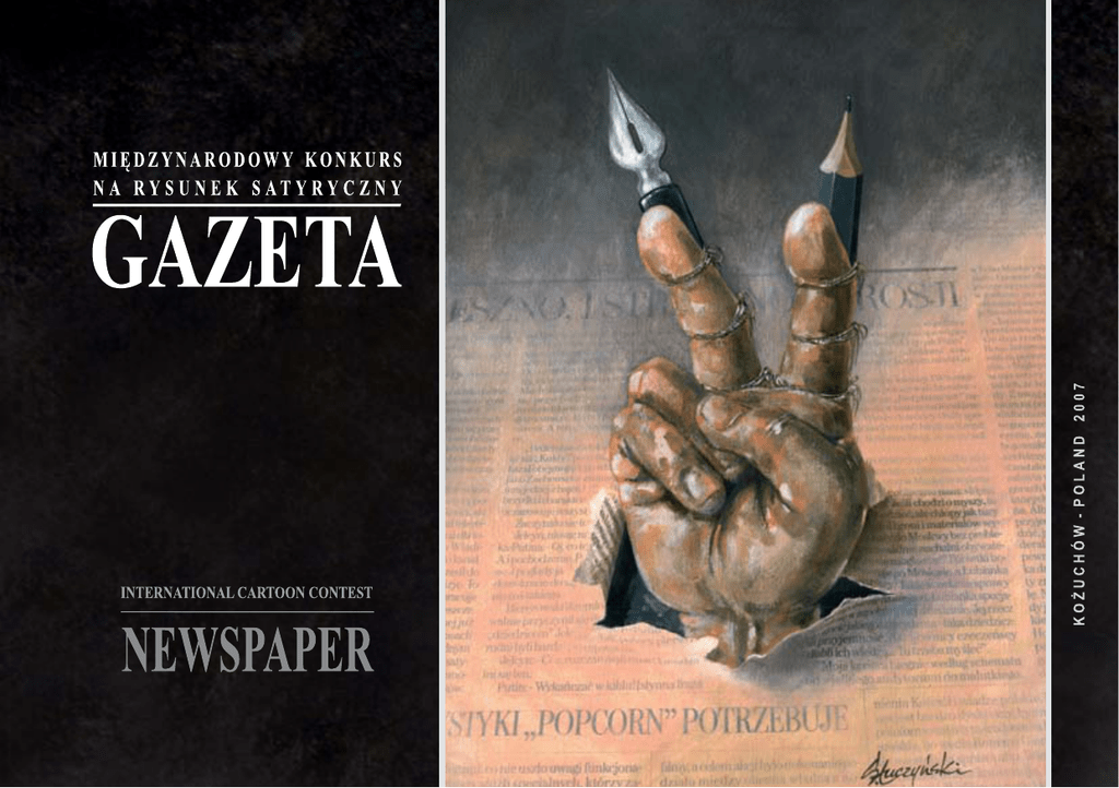 Ko¿uchów - Poland 2007 Patronat artystyczny: Ok³adka / Cover: S³awomir £uczyñski - rysunek satyryczny przys³any na Otwarty Miêdzynarodowy Konkurs Na Rysunek Satyryczny temat: "GAZETA" / a cartoon delivered to the International Cartoon Contest; subject 'NEWSPAPER' Dyrektor konkursu / Director of the contest: RYSZARD B£A¯YÑSKI Redakcja katalogu / Editor of the catalogue: MA£GORZATA ANTOSIK Redakcja graficzna / Graphic editing: KAMIL PIETRUCZYNIK Komisarz wystawy / Promotor of the exhibition: MIROS£AW HAJNOS Copyright by Ko¿uchowski Oœrodek Kultury i Sportu "ZAMEK" Sk³ad i przygotowanie do druku / Composition and preparation for printing: WIES£AW HARASYMOWICZ - absolut - studio reklamowe / advertising studio, ul. Dolina Zielona 9A, 65-154 Zielona Góra Druk / Printing: APRINT, ul. Mazepy 9, 65-001 Zielona Góra 2 IX OTWARTY MIÊDZYNARODOWY KONKURS NA RYSUNEK SATYRYCZNY temat: "GAZETA" pod Patronatem Marsza³ka Województwa Lubuskiego IX INTERNATIONAL CARTOON CONTEST Subject: "NEWSPAPER" under the patronage of the President of Lubuskie Voivodship G³ówny organizator / The main organizer Ko¿uchowski Oœrodek Kultury i Sportu "ZAMEK" w Ko¿uchowie Wspó³organizator / Coorganizer Gazeta Lubuska i Wydawnictwo "LUBPRESS" w Zielonej Górze 3 Wspó³organizatorzy i fundatorzy nagród Coorganizers and sponsors Stowarzyszenie Polskich Artystów Karykatury w Warszawie Muzeum Karykatury w Warszawie Urz¹d Marsza³kowski w Zielonej Górze Gazeta Lubuska i Wydawnictwo "LUBPRESS" w Zielonej Górze GEDIA POLAND Sp. z o.o. w Nowej Soli Poszukiwania Naftowe "DIAMENT" Sp. z o.o. w Zielonej Górze Polskie Górnictwo Naftowe i Gazownictwo SA Oddzia³ w Zielonej Górze ROCKWOOL POLSKA Sp. z o.o. w Cigacicach Zielonogórski Oœrodek Kultury P.P.H.U. CARO w Zielonej Górze Galeria "Krzywe Zwierciad³o" 4 Jury Przewodnicz¹cy / The President of the Jury Alessandro Gatto (ITA) - rysownik / cartoonist Cz³onkowie / Jurors: Henryk Cebula (POL) Wojciech Chmurzyñski (POL) Jacek Fedorowicz (POL) Miros³aw Hajnos (POL) Dariusz Pietrzak (POL) Fedor Vico (SVK) Zygmunt Zaradkiewicz (POL) - rysownik / cartoonist - dyrektor Muzeum Karykatury w Warszawie, historyk sztuki / director and Chief Curator of Museum of Caricature and Cartoon Art., historian of art - satyryk, aktor, rysownik / satirist, actor, cartoonist - rysownik / cartoonist - rysownik / cartoonist - rysownik / cartoonist - rysownik / cartoonist Sekretarz / Secretary: Ma³gorzata Antosik (POL) - Ko¿uchowski Oœrodek Kultury i Sportu "ZAMEK" 5 Zamiast wstêpu Szanowni Pañstwo! Uda³o siê. Po raz 9-ty finiszujemy z nasz¹ imprez¹. Mam przyjemnoœæ oznajmiæ, ¿e kolejna edycja OTWARTEGO MIÊDZYNARODOWEGO KONKURSU NA RYSUNEK SATYRYCZNY zosta³a rozstrzygniêta. Na tegoroczny temat "GAZETA" przys³ano rekordow¹ iloœæ 815 prac. Kolejne rekordy to iloœæ uczestników oraz krajów (z których prace przys³ano). Tym razem 371 satyryków reprezentowa³o 50 krajów. Organizatorów ucieszy³ fakt, ¿e wreszcie w konkursie wziê³a udzia³ bardzo liczna grupa rysowników z Polski (103). Siln¹ liczebnie grupê stanowili w tym roku artyœci z Rosji, Serbii, Turcji, Ukrainy, czy tradycyjnie z Iranu, Bu³garii oraz Rumunii. Po raz pierwszy w naszym Konkursie pokazali siê satyrycy z Algierii, Birmy, Finlandii, Holandii i Luksemburga. Znakomite jury, pod przewodnictwem wybitnego satyryka z W³och - Alessandro GATTO, mia³o co robiæ. GRAND PRIX i Szablê Kasztelañsk¹ w tegorocznej walce "na gazety" zdoby³ rysownik z Polski - Pawe³ KUCZYÑSKI. Pozosta³e nagrody (oprócz Polaków), otrzymali satyrycy z takich krajów jak Anglia, Azerbejd¿an, Belgia, Bu³garia, Czechy, Indie, Iran, Mo³dawia, Rosja, Rumunia, Serbia, Turcja oraz Ukraina. 6 W obecnej edycji, której patronowa³ Marsza³ek Województwa Lubuskiego, bardzo dobrze - jak s¹dzê, wywi¹zali siê ze swego zadania satyrycy z ca³ego œwiata, przedstawiaj¹c jedno z najwiêkszych mediów, jakim jest GAZETA. Poziom prac w tegorocznym wspó³zawodnictwie, pozwala mieæ nadziejê, ¿e sponsorzy tacy jak: LUBPRESS i Gazeta Lubuska, GEDIA, DIAMENT, PGNiG, ROCKWOOL, CARO oraz inni, dalej bêd¹ z t¹ imprez¹. Pok³osie tegorocznej edycji tradycyjnie bêdzie mo¿na obejrzeæ na wystawie pokonkursowej w Galerii "Krzywe Zwierciad³o" na Ko¿uchowskim Zamku, a póŸniej w Zielonej Górze i wspó³pracuj¹cych z organizatorami, galeriach z ca³ego kraju i mam nadziejê, tak¿e najlepszych galeriach europejskich i œwiatowych. Wycinek z tegorocznych "bojów", zobaczycie Pañstwo na moich stronach, do których zwiedzania serdecznie zapraszam. Jak zwykle z szacunkiem KATALOG Instead of an introduction Dear Sir and Madam We succeeded again. It is the 9th time that we celebrate the final of our Contest. I am pleased to announce that this year's edition of THE INTERNATIONAL CARTOON CONTEST has been settled. Its subject 'NEWSPAPER' has attracted an impressive number of 371 satirists from 50 countries who provided us with 815 works. I guess that in this year's edition, patronized by the President of lubuskie voivodship, satirists from all over the world performed really well presenting one of the most powerful medium- the newspapper. The high quality of this year's works let us hope that the following sponsors: LUBPRESS and Gazeta Lubuska, GEDIA, DIAMENT, PGNiG, ROCKWOOL, CARO shall stay with us. The participation of a large group of Polish cartoonist (103 contestants) was warmly welcomed by the organizers. Works from this year's edition will be traditionally shown at the post competition exhibition in the 'False Mirror' Gallery in Ko¿uchów's Castle and then in Zielona Góra and finally in national galleries cooperating with the organizers of the Contest. We do hope that the works shall also find their home in recognised European and World galleries. Artists from Russia, Serbia, Turkey, Ukraine and traditionally the representants from Iran, Bulgaria and Romania formed a powerful group in this year's edition.
