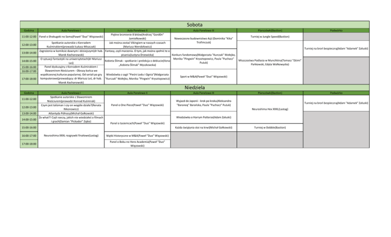 Sobota Godzina 11:00-12:00 12:00-13:00 13:00-14:00 14:00-15:00 15:00-16:00 16:00-17:00 17:00-18:00 Aula Panelowa I Aula Panelowa II Aula Panelowa III Piękne brzmienie 8 bitów(Andrzej "Gord0n" Panel o Shokugeki no Soma(Paweł "Duo" Więzowski) Nowoczesne budownictwo Azji (Dominika "Kika" Jamiołkowski) Trofimczuk) Spotkanie autorskie z Konradem Jak można zostać Vikingiem w naszych czasach Kuśmirakiem(prowadzi Łukasz Miszczak) (Mariusz Wendołowicz) Zagrożenia w komiksie dawnym i dzisiejszym(dr hab. Fantasy, czyli marzenia. O tym, jak można spełnić te o Marek Kochanowski) pisaniu(Justyna Drzewicka) Konkurs fandomowy(Małgorzata "Kurczak" Wołejko, Monika "Pingwin" Krysztopowicz, Paula "Puchacz" O sytuacji fantastyki na uniwersytetach(dr Mariusz Kobieta Ślimak - spotkanie i prelekcja o debiucie(Ilona Pużuk) Leś) „Kobieta Ślimak” Myszkowska) Panel dyskusyjny z Konradem Kuśmirakiem i Sławomirem Nieściurem - Obrazy końca we współczesnej kulturze popularnej. Od seriali po gry Wiedzówka z sagii "Pieśni Lodu i Ognia"(Małgorzata Sport w M&A(Paweł "Duo" Więzowski) komputerowe(prowadzący: dr Mariusz Leś, dr hab. "Kurczak" Wołejko, Monika "Pingwin" Krysztopowicz) Marek Kochanowski) Planszówki(Bastion) Podwórko Turniej w Jungle Speed(Bastion) Turniej na broń bezpieczną(Adam "Adamek" Załuski) Miszczostwa Podlasia w Munchkina(Tomasz "Dżimi" Pańkowski, Edyta Wołkowycka) Niedziela Godzina 11:00-12:00 12:00-13:00 13:00-14:00 14:00-15:00 Aula Panelowa I Spotkanie autorskie z Sławomirem Nieściurem(prowadzi Konrad Kuśmirak) Czym jest talizman i czy on wogóle działa?(Renata Nikonowicz) Atlantyda Północy(Michał Gołkowski) Że what?! Czyli rzeczy, jakich nie wiedziałeś o filmach i grach(Damian "Pickador" Zajko) Aula Panelowa II Aula Panelowa III Panel o One Piece(Paweł "Duo" Więzowski) Wyjazd do Japonii - krok po kroku(Aleksandra "Baraneq" Barańska, Paula "Puchacz" Pużuk) Wiedzówka o Harrym Potterze(Adam Załuski) Panel o tasiemcach(Paweł "Duo" Więzowski) 17:00-18:00 Każda świątynia stoi na krwi(Michał Gołkowski) Neuroshima XXXL rozgrywki finałowe(Lastag) Wątki Historyczne w M&A(Paweł "Duo" Więzowski) Panel o Boku no Hero Academia(Paweł "Duo" Więzowski) Podwórko Turniej na broń bezpieczną(Adam "Adamek" Załuski) Neuroshima Hex XXXL(Lastag) 15:00-16:00 16:00-17:00 Planszówki(Bastion) Turniej w Dobble(Bastion)