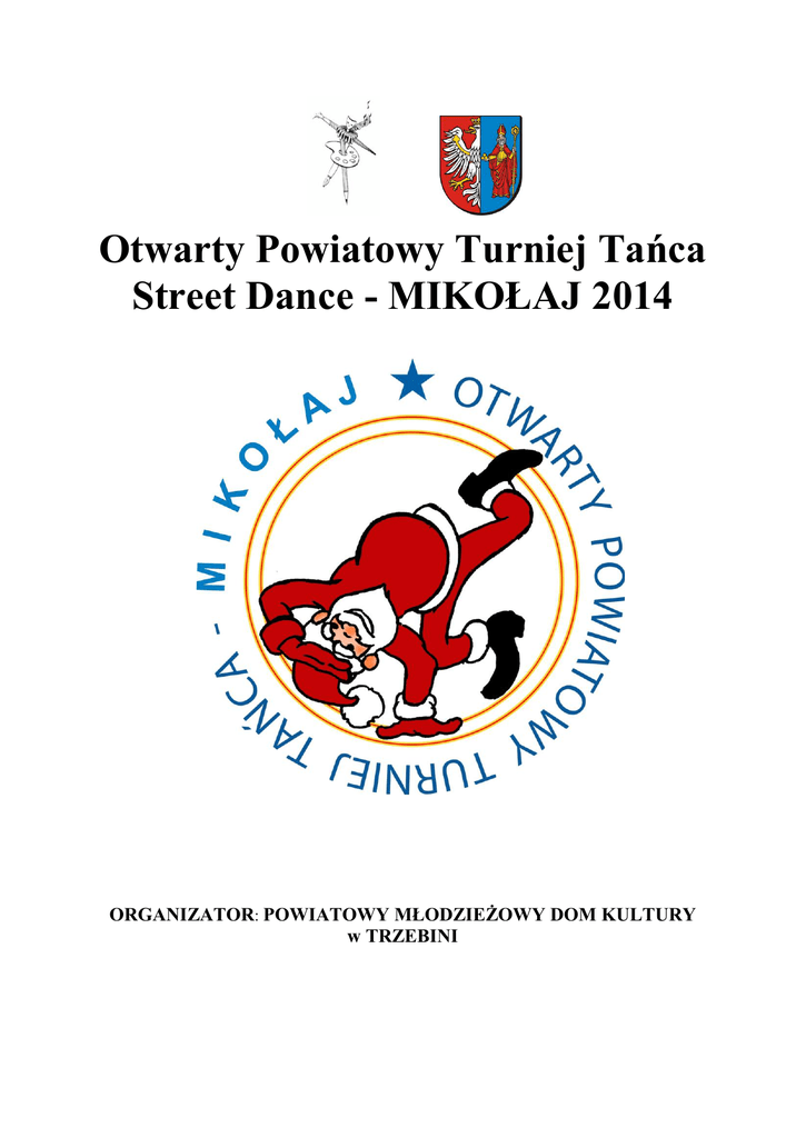 Otwarty Powiatowy Turniej Tańca Street Dance - MIKOŁAJ 2014 ORGANIZATOR: POWIATOWY MŁODZIEŻOWY DOM KULTURY w TRZEBINI REGULAMIN 1. Termin i miejsce 6 GRUDNIA 2014 r. sala choreograficzna PMDK, ul. Kościuszki 72, 32-540 Trzebinia, godz. 10.00 2. Cele Turnieju - popularyzacja sztuki tanecznej - konfrontacja dokonań artystycznych młodych tancerzy - integracja w tańcu -wymiana doświadczeń -wyłonienie najlepszych tancerzy turnieju -wymiana energii tanecznej 3. Uczestnicy: Do udziału w turnieju zapraszamy młodzież szkół podstawowych, gimnazjów, szkół ponadgimnazjalnych, studentów, uczestników zajęć w placówkach kulturalnych i oświatowych w kategorii soliści, duety, mini formacje (3-7osób) 4. Kategorie wiekowe: I kategoria – uczniowie szkół podstawowych II kategoria – uczniowie gimnazjów III kategoria – uczniowie szkół ponadgimnazjalnych IV kategoria OPEN (od 19 lat wzwyż) 5. Kategorie taneczne: -Street Dance -Break Dance 6. Warunki uczestnictwa: Warunkiem uczestnictwa jest przesłanie pocztą elektroniczną karty zgłoszenia w/g załączonego wzoru w nieprzekraczalnym terminie do 25 listopada 2014. Każdy email otrzyma potwierdzenie. Brak potwierdzenia oznacza nieotrzymanie wiadomości. [email protected] [email protected] -AKREDYTACJA – 5zł od uczestnika, płatne w dniu imprezy 7. Postanowienia ogólne: - soliści, duety i mini-formacje prezentują jeden układ taneczny o czasie do 2min. - w festiwalu uczestnicy prezentują dowolne techniki tańca, - muzyka do prezentacji winna być dostarczona na nośniku CD(audio) przed prezentacją. Nośnik opisany. 8. Wymogi techniczne: - wymiary sceny 6m x 6m, -prezentacja bez oświetlenia scenicznego -zakaz używania ognia i elementów pirotechnicznych -zakaz polewania parkietu wodą 9. Sędziowie oceniać będą: - choreografia - dobór muzyki i interpretacja - technika wykonania - estetyka i dobór kostiumów - ogólny wyraz artystyczny - image - sędziowanie w trakcie eliminacji i finału będzie tajne - werdykt jury jest niepodważalny i ostateczny - we wszystkich kwestiach spornych decydujący głos ma sędzia główny i organizatorzy 10. Uwagi organizatora: - uczestnicy powinni posiadać ważne legitymacje szkolne lub inny dokument potwierdzający tożsamość - uczestnicy przyjeżdżają i ubezpieczają się na koszt własny - opieka nad niepełnoletnimi uczestnikami obowiązuje zgodnie z przepisami oświaty - organizator nie odpowiada za rzeczy pozostawione w trakcie imprezy - organizator zastrzega sobie prawo do łączenia kategorii - osoby występujące wyrażają zgodę na filmowanie i fotografowanie oraz wykorzystanie tych materiałów przez organizatora -nagrody nieodebrane w dniu finału przepadają na rzecz organizatora - sprawy nieujęte regulaminem rozstrzyga organizator RAMOWY PROGRAM TURNIEJU zostanie umieszczony przez organizatora w dniu 01.12.2014 na stronie www.pmdk-trzebinia.pl Szczegółowych informacji udziela: Jacek Palka – tel. 694269771 Małgorzata Liszka – tel. 604156782 KARTA ZGŁOSZENIA OTWARTY TURNIEJ TAŃCA STREET-DANCE MIKOŁAJ 2014 1. Solista, duet, mini-formacja. ………..…………………………………………… 2. Jednostka delegująca……………………………………………………………… 3. adres korespondencyjny …………………………………………………………. 4. imię i nazwisko instruktorów…………………………………………………….. 5. telefon kontaktowy, adres mailowy……………………………………………… 6. kategoria artystyczna…………………………………………………………….. 7. kategoria wiekowa……………………………………………………………….. 8. ilość osób w zespole…………………………………………………………….... Podpis instruktora Pieczątka instytucji delegującej