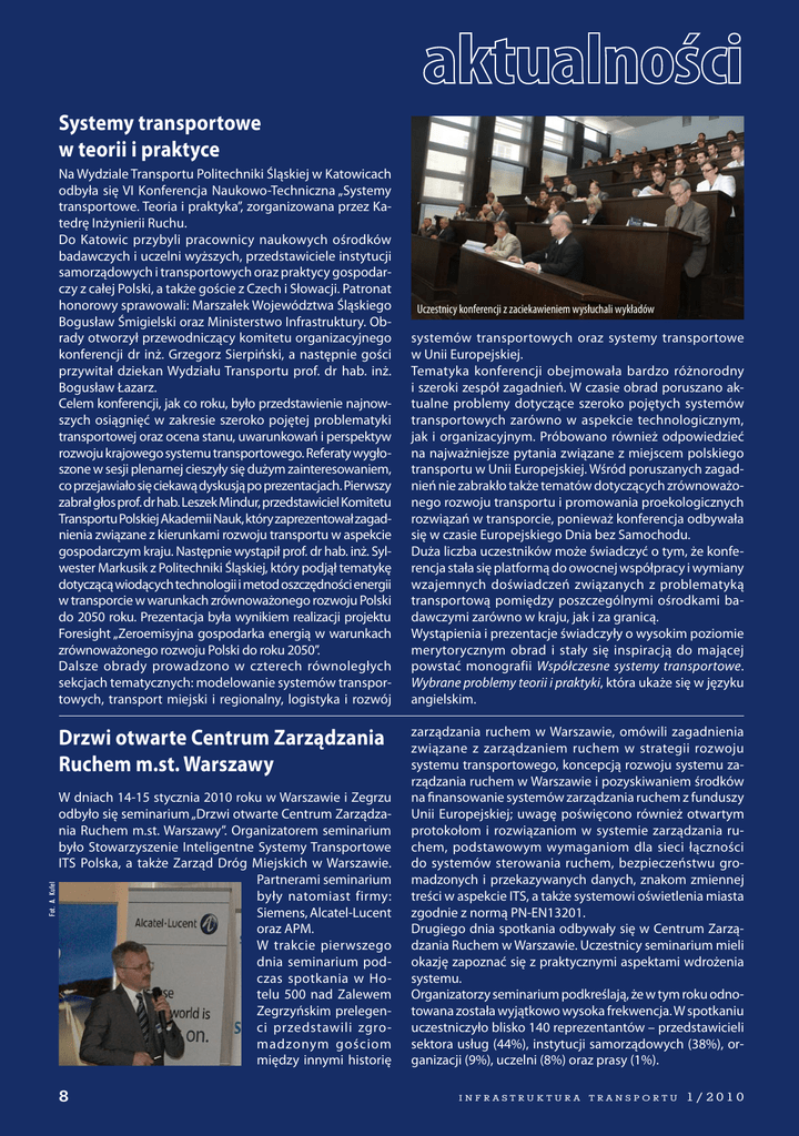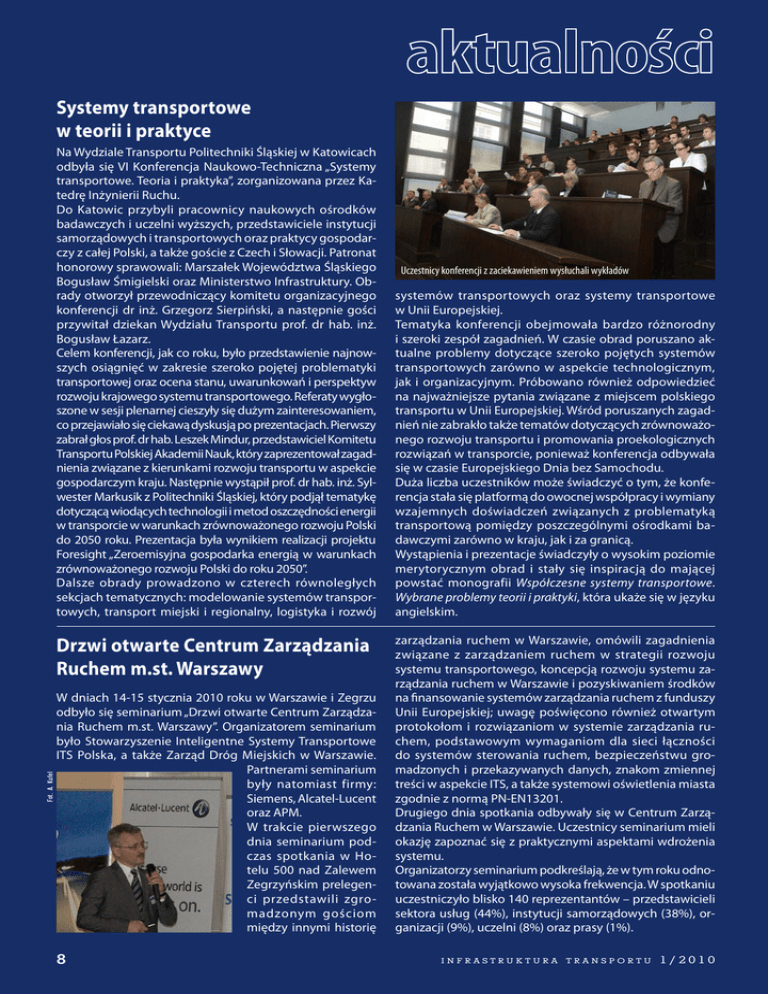 Systemy transportowe w teorii i praktyce Na Wydziale Transportu Politechniki Śląskiej w Katowicach odbyła się VI Konferencja Naukowo-Techniczna „Systemy transportowe. Teoria i praktyka”, zorganizowana przez Katedrę Inżynierii Ruchu. Do Katowic przybyli pracownicy naukowych ośrodków badawczych i uczelni wyższych, przedstawiciele instytucji samorządowych i transportowych oraz praktycy gospodarczy z całej Polski, a także goście z Czech i Słowacji. Patronat honorowy sprawowali: Marszałek Województwa Śląskiego Bogusław Śmigielski oraz Ministerstwo Infrastruktury. Obrady otworzył przewodniczący komitetu organizacyjnego konferencji dr inż. Grzegorz Sierpiński, a następnie gości przywitał dziekan Wydziału Transportu prof. dr hab. inż. Bogusław Łazarz. Celem konferencji, jak co roku, było przedstawienie najnowszych osiągnięć w zakresie szeroko pojętej problematyki transportowej oraz ocena stanu, uwarunkowań i perspektyw rozwoju krajowego systemu transportowego. Referaty wygłoszone w sesji plenarnej cieszyły się dużym zainteresowaniem, co przejawiało się ciekawą dyskusją po prezentacjach. Pierwszy zabrał głos prof. dr hab. Leszek Mindur, przedstawiciel Komitetu Transportu Polskiej Akademii Nauk, który zaprezentował zagadnienia związane z kierunkami rozwoju transportu w aspekcie gospodarczym kraju. Następnie wystąpił prof. dr hab. inż. Sylwester Markusik z Politechniki Śląskiej, który podjął tematykę dotyczącą wiodących technologii i metod oszczędności energii w transporcie w warunkach zrównoważonego rozwoju Polski do 2050 roku. Prezentacja była wynikiem realizacji projektu Foresight „Zeroemisyjna gospodarka energią w warunkach zrównoważonego rozwoju Polski do roku 2050”. Dalsze obrady prowadzono w czterech równoległych sekcjach tematycznych: modelowanie systemów transportowych, transport miejski i regionalny, logistyka i rozwój Fot. A. Kufel Drzwi otwarte Centrum Zarządzania Ruchem m.st. Warszawy W dniach 14-15 stycznia 2010 roku w Warszawie i Zegrzu odbyło się seminarium „Drzwi otwarte Centrum Zarządzania Ruchem m.st. Warszawy”. Organizatorem seminarium było Stowarzyszenie Inteligentne Systemy Transportowe ITS Polska, a także Zarząd Dróg Miejskich w Warszawie. Partnerami seminarium były natomiast firmy: Siemens, Alcatel-Lucent oraz APM. W trakcie pierwszego dnia seminarium podczas spotkania w Hotelu 500 nad Zalewem Zegrzyńskim prelegenci przedstawili zgromadzonym gościom między innymi historię 8 Uczestnicy konferencji z zaciekawieniem wysłuchali wykładów systemów transportowych oraz systemy transportowe w Unii Europejskiej. Tematyka konferencji obejmowała bardzo różnorodny i szeroki zespół zagadnień. W czasie obrad poruszano aktualne problemy dotyczące szeroko pojętych systemów transportowych zarówno w aspekcie technologicznym, jak i organizacyjnym. Próbowano również odpowiedzieć na najważniejsze pytania związane z miejscem polskiego transportu w Unii Europejskiej. Wśród poruszanych zagadnień nie zabrakło także tematów dotyczących zrównoważonego rozwoju transportu i promowania proekologicznych rozwiązań w transporcie, ponieważ konferencja odbywała się w czasie Europejskiego Dnia bez Samochodu. Duża liczba uczestników może świadczyć o tym, że konferencja stała się platformą do owocnej współpracy i wymiany wzajemnych doświadczeń związanych z problematyką transportową pomiędzy poszczególnymi ośrodkami badawczymi zarówno w kraju, jak i za granicą. Wystąpienia i prezentacje świadczyły o wysokim poziomie merytorycznym obrad i stały się inspiracją do mającej powstać monografii Współczesne systemy transportowe. Wybrane problemy teorii i praktyki, która ukaże się w języku angielskim. zarządzania ruchem w Warszawie, omówili zagadnienia związane z zarządzaniem ruchem w strategii rozwoju systemu transportowego, koncepcją rozwoju systemu zarządzania ruchem w Warszawie i pozyskiwaniem środków na finansowanie systemów zarządzania ruchem z funduszy Unii Europejskiej; uwagę poświęcono również otwartym protokołom i rozwiązaniom w systemie zarządzania ruchem, podstawowym wymaganiom dla sieci łączności do systemów sterowania ruchem, bezpieczeństwu gromadzonych i przekazywanych danych, znakom zmiennej treści w aspekcie ITS, a także systemowi oświetlenia miasta zgodnie z normą PN-EN13201. Drugiego dnia spotkania odbywały się w Centrum Zarządzania Ruchem w Warszawie. Uczestnicy seminarium mieli okazję zapoznać się z praktycznymi aspektami wdrożenia systemu. Organizatorzy seminarium podkreślają, że w tym roku odnotowana została wyjątkowo wysoka frekwencja. W spotkaniu uczestniczyło blisko 140 reprezentantów – przedstawicieli sektora usług (44%), instytucji samorządowych (38%), organizacji (9%), uczelni (8%) oraz prasy (1%). infrastruktura transportu 1/2010 W dniach od 30 listopada do 3 grudnia 2009 roku w Zakopanem odbyła się XIII Międzynarodowa Konferencja Naukowa TRANSCOMP 2009 „Komputerowe systemy wspomagania nauki, przemysłu i transportu”. Konferencja została zorganizowana przez Wydział Transportu i Elektrotechniki Politechniki Radomskiej oraz Komitet Transportu Polskiej Akademii Nauk. Wydarzeniu patronował JM Rektor Politechniki Radomskiej prof. dr hab. inż. Mirosław Luft. W skład Komitetu Naukowego weszli między innymi: prof. Jan Adamczyk z AGH, prof. Krzysztof Chwesiuk z AM w Szczecinie oraz Prof. Aleś Janota (University of Zilina, Słowacja). Pierwszego dnia konferencji obradom plenarnym przewodniczyła prof. dr hab. inż. Elżbieta Szychta. Przedstawiony został wówczas m.in. referat Jerzego Lewitowicza „Komputerowe wspomaganie eksploatacji i eksploatyki środków transportu na przykładzie statków powietrznych”. Sesji „Elektrotechnika, elektronika i automatyka” przewodniczyli: prof. dr hab. inż. Mirosław Luft, prof. dr hab. inż. Zygmunt Maciejewski oraz prof. dr hab. inż