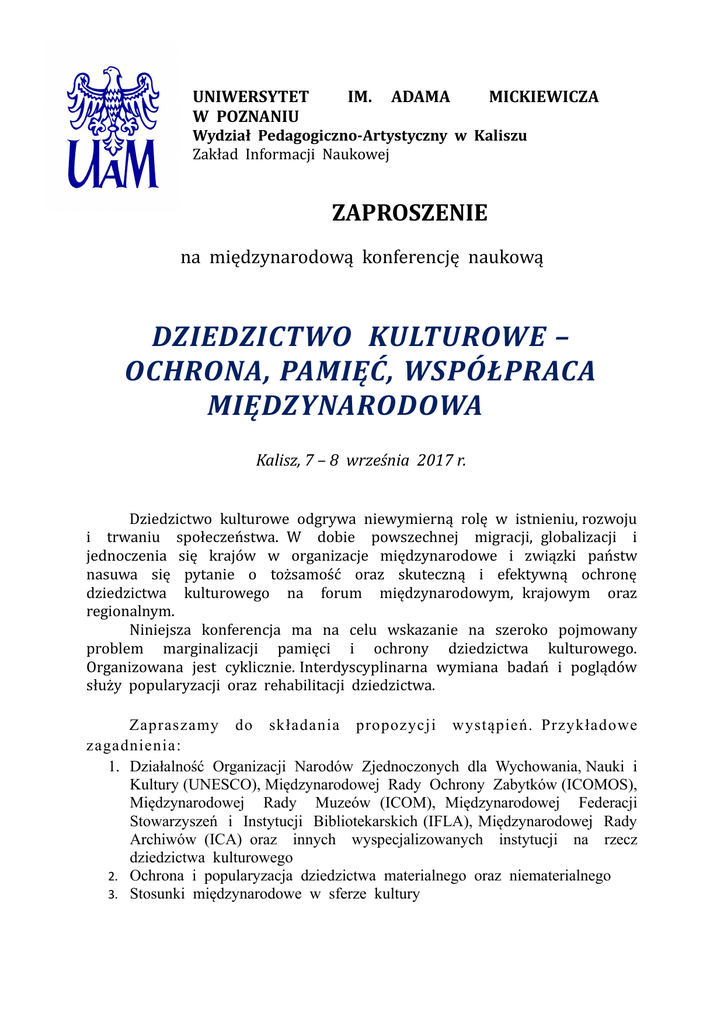 UNIWERSYTET W POZNANIU IM. ADAMA MICKIEWICZA Wydział Pedagogiczno-Artystyczny w Kaliszu Zakład Informacji Naukowej ZAPROSZENIE na międzynarodową konferencję naukową DZIEDZICTWO KULTUROWE – OCHRONA, PAMIĘĆ, WSPÓŁPRACA MIĘDZYNARODOWA Kalisz, 7 – 8 września 2017 r. Dziedzictwo kulturowe odgrywa niewymierną rolę w istnieniu, rozwoju i trwaniu społeczeństwa. W dobie powszechnej migracji, globalizacji i jednoczenia się krajów w organizacje międzynarodowe i związki państw nasuwa się pytanie o tożsamość oraz skuteczną i efektywną ochronę dziedzictwa kulturowego na forum międzynarodowym, krajowym oraz regionalnym. Niniejsza konferencja ma na celu wskazanie na szeroko pojmowany problem marginalizacji pamięci i ochrony dziedzictwa kulturowego. Organizowana jest cyklicznie. Interdyscyplinarna wymiana badań i poglądów służy popularyzacji oraz rehabilitacji dziedzictwa. Zapraszamy do składania propozycji wystąpień. Przykładowe zagadnienia: 1. Działalność Organizacji Narodów Zjednoczonych dla Wychowania, Nauki i Kultury (UNESCO), Międzynarodowej Rady Ochrony Zabytków (ICOMOS), Międzynarodowej Rady Muzeów (ICOM), Międzynarodowej Federacji Stowarzyszeń i Instytucji Bibliotekarskich (IFLA), Międzynarodowej Rady Archiwów (ICA) oraz innych wyspecjalizowanych instytucji na rzecz dziedzictwa kulturowego 2. Ochrona i popularyzacja dziedzictwa materialnego oraz niematerialnego 3. Stosunki międzynarodowe w sferze kultury 4. Ochrona 5. 6. 7. 8. 9. 10. 11. 12. 13. 14. dziedzictwa kulturowego na obszarach transgranicznych i subregionalnych Zabytki i kultura mniejszości narodowych i etnicznych Życie w diasporach a ochrona dziedzictwa kulturowego Translatologia i komparatystyka kulturowa, artystyczna, literacka w kontekście dziedzictwa, historii i tożsamości Utracone dziedzictwo. Rewindykacje dóbr kultury Historia miejsca. Krajobraz kulturowy. Geografia artystyczna Ochrona dóbr kultury w obliczu globalizacji, migracji oraz konfliktów zbrojnych Konserwacja, restauracja oraz adaptacja obiektów zabytkowych Nieznane artefakty dziedzictwa kulturowego Dziedzictwo kulturowe a dziedzictwo naturalne Prawo a ochrona dziedzictwa kulturowego i przyrodniczego Informacje organizacyjne: Miejsce obrad: Wydział Pedagogiczno-Artystyczny Mickiewicza, ul. Nowy Świat 28-30, 62-800 Kalisz Uniwersytetu im. Adama Istnieje możliwość zarezerwowania noclegu po przystępnej dodatkowej opłacie w Domu Studenta WPA UAM, który mieści się w tym samym kompleksie budynków, w którym odbędzie się konferencja. Zakwalifikowanie do czynnego udziału w konferencji następuje na podstawie wypełnionej karty zgłoszenia, którą należy przesłać do końca maja 2017 r. na adres email: [email protected] Przewidujemy wystąpienia prelegentów 15 min Opłata konferencyjna wynosi 390 złotych (obejmuje uczestnictwo w konferencji, materiały konferencyjne, wydanie publikacji, bufet kawowy, obiady, kolację). Numer konta UAM prześlemy w liście potwierdzającym przyjęcie zgłoszenia do udziału w konferencji. Język obrad konferencyjnych oraz przygotowania artykułu do druku: polski, angielski, niemiecki lub inny język kongresowy, którym posługuje się uczestnik konferencji. Artykuły zostaną opublikowane w publikacji książkowej punktowej według zasad parametrycznych (nie wykluczamy również wersji elektronicznej). Artykuły do druku należy przesłać do dnia 31 października 2017 r. na adres: [email protected] *** Karta zgłoszenia międzynarodowa konferencja naukowa n a t e m a t: „Dziedzictwo kulturowe – ochrona, pamięć, współpraca międzynarodowa” WPA UAM, Kalisz, 7-8 września 2017 r. Imię i nazwisko: ………………………………………………………………………………………... Nazwa instytucji, adres: ……………………………………………………………………………… Stopień/tytuł naukowy: ……………………………………………………………………………….. Adres korespondencyjny: .......................................................................................................... Telefon, e-mail: ……………………………………………............... Tytuł wystąpienia: …………………………………………………………………………………… …………………………………………………………………………………………………………… Abstrakt: ………………………………………………………………………………………………… …………………………………………………………………………………………………………… …………………………………………………………………………………………………………… …………………………………………………………………………………………………………… …………………………………………………………………………………………………………… …………………………………………………………………………………………………………… Czy będzie Pan/i korzystać ze sprzętu elektronicznego podczas wystąpienia? Jeśli tak, proszę sprecyzować: ………………………………………………………………………………… Czy skorzysta Pan/i z zaproszenia na kolację w pierwszym dniu konferencji? …………………………………… Czy skorzysta Pan/i z rezerwacji noclegu w Domu Studenta UAM? Jeśli tak, proszę podać termin ………………….. Informacja dotycząca podmiotu, na którą ma być wystawiona faktura za udział w konferencji: Nazwa instytucji/Imię i Nazwisko:…………………………………………………............... .…………………………………………………............... Adres: ………………………………