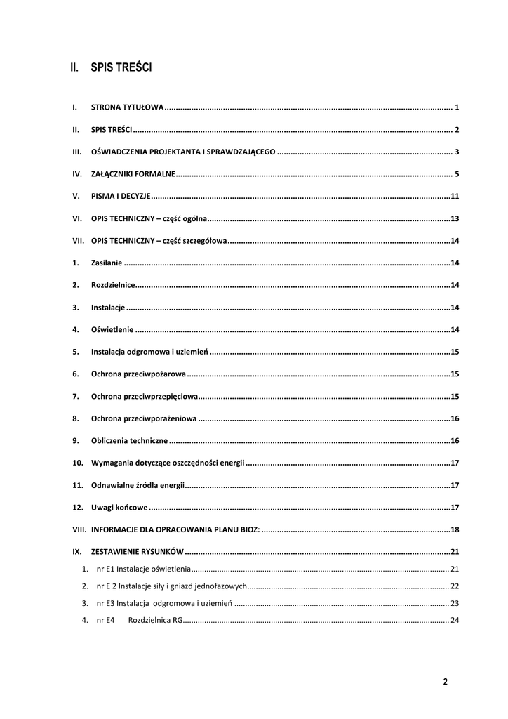 II. SPIS TREŚCI I. STRONA TYTUŁOWA ................................................................................................................................ 1 II. SPIS TREŚCI .............................................................................................................................................. 2 III. OŚWIADCZENIA PROJEKTANTA I SPRAWDZAJĄCEGO .............................................................................. 3 IV. ZAŁĄCZNIKI FORMALNE ........................................................................................................................... 5 V. PISMA I DECYZJE .....................................................................................................................................11 VI. OPIS TECHNICZNY – część ogólna............................................................................................................13 VII. OPIS TECHNICZNY – część szczegółowa ...................................................................................................14 1. Zasilanie .................................................................................................................................................14 2. Rozdzielnice............................................................................................................................................14 3. Instalacje ................................................................................................................................................14 4. Oświetlenie ............................................................................................................................................14 5. Instalacja odgromowa i uziemień ...........................................................................................................15 6. Ochrona przeciwpożarowa .....................................................................................................................15 7. Ochrona przeciwprzepięciowa................................................................................................................15 8. Ochrona przeciwporażeniowa ................................................................................................................16 9. Obliczenia techniczne .............................................................................................................................16 10. Wymagania dotyczące oszczędności energii ...........................................................................................17 11. Odnawialne źródła energii ......................................................................................................................17 12. Uwagi końcowe ......................................................................................................................................17 VIII. INFORMACJE DLA OPRACOWANIA PLANU BIOZ: ....................................................................................18 IX. ZESTAWIENIE RYSUNKÓW ......................................................................................................................21 1. nr E1 Instalacje oświetlenia ........................................................................................................................ 21 2. nr E 2 Instalacje siły i gniazd jednofazowych.............................................................................................. 22 3. nr E3 Instalacja odgromowa i uziemień .................................................................................................... 23 4. nr E4 Rozdzielnica RG............................................................................................................................ 24 2 III. OŚWIADCZENIA PROJEKTANTA I SPRAWDZAJĄCEGO BranŜa elektryczna 1) Projektant: Robert JamroŜy.................................................................................................................. 4 2.) Sprawdzający: Stanisław Sowiński ..................................................................................................... 4 3 OŚWIADCZENIE Projektanta oraz sprawdzającego o sporządzeniu projektu budowlanego zgodnie z obowiązującymi przepisami oraz zasadami wiedzy technicznej. Projektant: Ja niŜej podpisany: ROBERT JAMROśY ( imię i nazwisko projektanta ) Zamieszkały: ul. Śląska 86c , 63-900 Rawicz Sprawdzający: Ja niŜej podpisany: STANISŁAW SOWIŃSKI ( imię i nazwisko sprawdzającego ) Zamieszkały: ul. Reymonta 5 , 56-200 Góra po zapoznaniu się z przepisami ustawy z dnia 7 lipca 1994 roku – Prawo budowlane (Dz. U. z 2000r. Nr 106, poz. 1126, z późn. Zm) zgodnie z art. 20ust. 4 tej ustawy oświadczam, Ŝe projekt budowlany zamienny opracowany dla: GMINA KOBYLIN Rynek Marsz. Piłsudskiego 1 63-700 Kobylin dotyczący: PRZEBUDOWA I ROZBUDOWA BUDYNKU ŚWIETLICY WIEJSKIEJ 63-700 Kobylin, Łagiewniki, dz. nr 126/1 (nazwa i rodzaj oraz adres całego zamierzenia budowlanego, rodzaj/-e obiektu/-ów bądź robot budowlanych, oznaczenie działki ewidencyjnej wg ewidencji gruntów i budynków poprzez określenie obrębu ewidencyjnego oraz numeru działki ewidencyjnej) sporządziłem(am) zgodnie z obowiązującymi przepisami oraz zasadami wiedzy technicznej. Świadomy odpowiedzialności karnej za podanie w niniejszym oświadczeniu nieprawdy, zgodnie z art. 233 Kodeksu Karnego, potwierdzam własnoręcznym podpisem prawdziwość danych zamieszczonych powyŜej. …………………………… (podpis projektanta) ..………..…………………… (podpis sprawdzającego) 4 IV. ZAŁĄCZNIKI FORMALNE 1) Zaświadczenie projektanta o przynaleŜności do okręgowej Izby InŜynierów Budownictwa nr ewid. WKP/IE/1394/03 waŜne do dnia 31.12.2009 r. ............................................................................... 6 2.) Uprawnienia projektanta nr ewid. WKP/0146/POOE/08 .................................................................