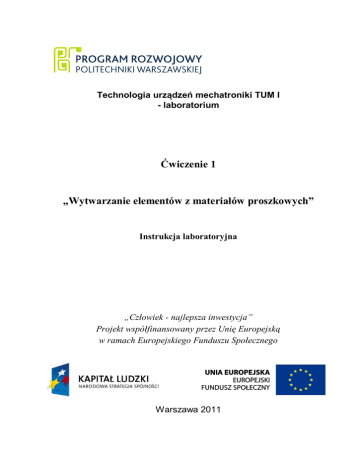 Technologia urządzeń mechatroniki TUM I - laboratorium Ćwiczenie 1 „Wytwarzanie elementów z materiałów proszkowych” Instrukcja laboratoryjna „Człowiek - najlepsza inwestycja” Projekt współfinansowany przez Unię Europejską w ramach Europejskiego Funduszu Społecznego Warszawa 2011 Ćwiczenie 1 „Wytwarzanie elementów z materiałów proszkowych” 2 1. WSTĘP 1.1. Cel ćwiczenia Zapoznanie studentów z podstawowymi badaniami właściwości fizycznych i technolo- gicznych proszków metalowych i ceramicznych przeznaczonych do różnych zastosowań technicznych w mechatronice, budowie maszyn i urządzeń itp. oraz poznanie typowego oprzyrządowania do wytwarzania kształtek podstawową metodą, a wiec metodą prasowania matrycowego proszków. 1.2. Zakres wymaganych wiadomości Prawidłowe przygotowanie do przeprowadzenia ćwiczenia wymaga zaznajomienia się z obowiązującą instrukcją oraz z odpowiednim fragmentem wykładu. Niezbędne jest również uzupełnienie wiadomości w oparciu o podaną literaturę. Zakres wymaganych wiadomości jest następujący: - metody wytwarzania proszków metalowych i proszków ceramicznych, - zależności kształtów cząstek od sposobów ich wytwarzania w powiązaniu z zastosowaniami do wytwarzania wyrobów o różnym przeznaczeniu, - podstawowe oprzyrządowanie do określania właściwości proszków, - metody formowania kształtek z proszków, - oprzyrządowanie do wytwarzania kształtek z proszków metodą prasowania matrycowego. 2. WPROWADZENIE (Opis technologii, jej istota, zjawiska fizyczne, parametry i warunki technologiczne procesu, zastosowania). 2.1. Informacje ogólne Dynamiczny rozwój techniki od początku XX wieku wiązał się, między innymi, z opra- cowaniami nowych materiałów. Jedną z nowoczesnych dziedzin była metalurgia proszków. Z jednej strony technika ta pozwala na znaczne obniżenie kosztów wytwarzania elementów konstrukcyjnych, szczególnie w produkcji wielkoseryjnej i masowej; jest to tzw. konkurencyjne Technologia urządzeń mechatroniki TUM I Ćwiczenie 1 „Wytwarzanie elementów z materiałów proszkowych” 3 zastosowanie metalurgii proszków. Z drugiej strony za pomocą techniki proszkowej można wytwarzać nowe materiały, niemożliwe do wytwarzania innymi technikami; jest to tzw. bezkonkurencyjne zastosowanie metalurgii proszków. Dlatego też, dzięki metalurgii proszków, technika wzbogaciła się o szereg nowych materiałów. Wyliczyć tu można przykładowo materiały porowate z przeznaczeniem na filtry czy łożyska samosmarowe, styki elektryczne, pręty paliwowe reaktorów atomowych, druty z metali trudnotopliwych (wolfram, molibden), elementy półprzewodnikowe, a z materiałów ceramicznych ferryty czy węgliki spiekane oraz całą grupę różnych kompozytów wieloskładnikowych. Proszki można wytwarzać prawie ze wszystkich metali i ich stopów. Techniki wytwarzania proszków są różne i dlatego otrzymuje się cząstki o odmiennych kształtach. Proszki otrzymane z tego samego metalu, ale różnymi sposobami będą miały kształty charakterystyczne dla danego sposobu wytwarzania. Tak więc kształt cząstek proszku nie jest zależny od materiału, z którego został otrzymany ale od metody jego wytwarzania. Proszki poddaje się następującym badaniom: a) badania właściwości chemicznych polegające na: - określeniu składu chemicznego, tj. zawartości składnika podstawowego w przypadku mieszanki oraz zawartości różnych domieszek i zanieczyszczeń, - określeniu ilości zaabsorbowanych gazów. b) właściwości fizycznych takich jak: - kształt ziaren, - skład ziarnowy proszku, - twardość (szczególnie mikrotwardość) ziaren, - powierzchnia właściwa proszku, - struktura ziaren. c) właściwości technologicznych takich jak: - gęstość nasypowa proszku i gęstość z usadem, - sypkość proszku, Technologia urządzeń mechatroniki TUM I Ćwiczenie 1 „Wytwarzanie elementów z materiałów proszkowych” 4 - zgęszczalność proszku, - formowalność proszku. Przygotowana do badań próbka proszku musi być reprezentatywna, tzn., że własności proszku z pobranej próbki muszą być zbliżone do własności całej partii proszku. 2.2. Literatura źródłowa (wykorzystana w opracowaniu) 1. odpowiedni fragment wykładu, 2. Rutkowski W.: Projektowanie właściwości wyrobów spiekanych z proszków i włókien PWN, Warszawa, 1977, 2. Polskie Normy, jak np. PN-EN ISO 3252:2002. 3. STANOWISKO LABORATORYJNE (Struktura i obsługa stanowiska laboratoryjnego (ewentualnie stanowisk lub urzą- dzeń). Do przeprowadzenia badań stosowane są różne specjalistyczne przyrządy. Program ćwiczenia składa się z następujących zadań szczegółowych: 1) Analiza kształtu ziaren Analizę kształtu ziaren przeprowadza się metodą wizualizacyjną z wykorzystaniem mikroskopu metalograficznego zaopatrzonego w duży ekran. Zgodnie z Polską Normą PN-EN ISO 3252:2002 przyjmuje się następujące nazewnictwo dla cząstek proszku (rys. 1): wielościenny płatkowy Technologia urządzeń mechatroniki TUM I nieregularny Ćwiczenie 1 „Wytwarzanie elementów z materiałów proszkowych” dendrytyczny globularny włóknisty kulisty iglasty granulowy 5 Rys. 1. Nazewnictwo proszków otrzymanych różnymi metodami 2). Badanie składu ziarnowego proszku. Oznaczenie składu ziarnowego proszku powyżej 40 μm przeprowadza się metodą wydzielania poszczególnych frakcji proszku na sitach o coraz mniejszych oczkach. W ćwiczeniu badanie to prowadzone jest na przesiewaczu LPzE-2 (rys. 2). Metoda ta nie jest nieprzydatna do wydzielania proszków o drobniejszych cząstkach. Dokładna analiza składu ziarnowego frakcji positowej (frakcji o cząstkach mniejszych niż 40 μm jest możliwa do określenia innymi metodami. Tradycyjna metoda takiej analizy opiera się na prawie Stokesa, za pomocą której skład ziarnowy określa się na podstawie szybkości opadania cząstek w cieczy. Nowoczesne metody okreś