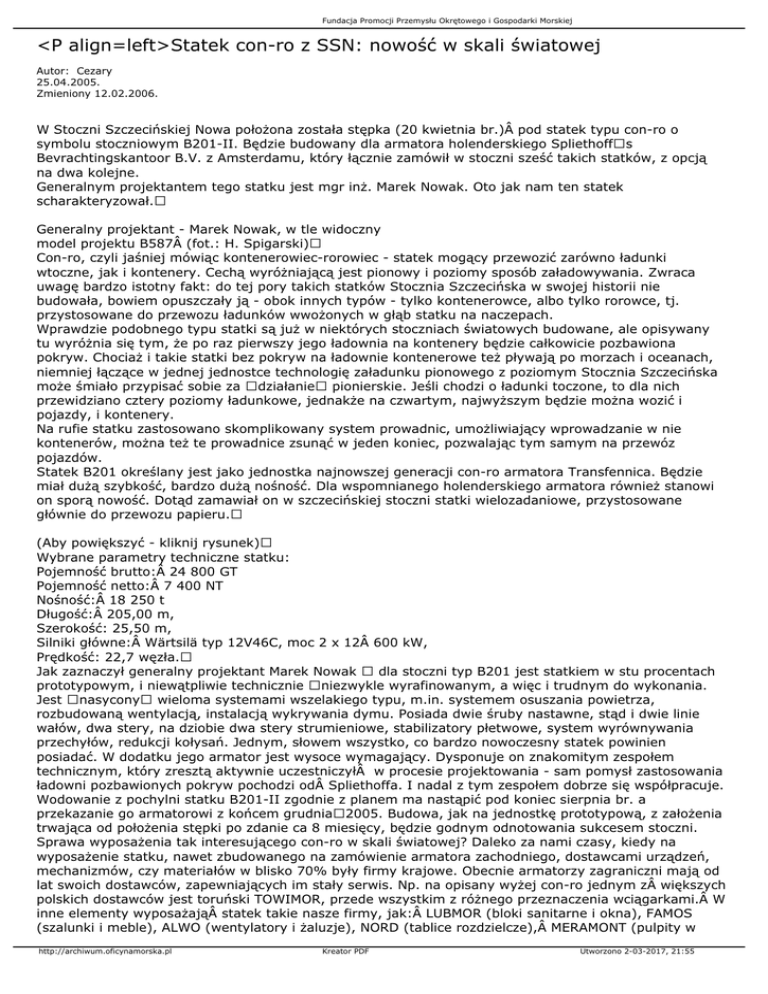 Fundacja Promocji Przemysłu Okrętowego i Gospodarki Morskiej <P align=left>Statek con-ro z SSN: nowość w skali światowej Autor: Cezary 25.04.2005. Zmieniony 12.02.2006. W Stoczni Szczecińskiej Nowa położona została stępka (20 kwietnia br.) pod statek typu con-ro o symbolu stoczniowym B201-II. Będzie budowany dla armatora holenderskiego Spliethoffs Bevrachtingskantoor B.V. z Amsterdamu, który łącznie zamówił w stoczni sześć takich statków, z opcją na dwa kolejne. Generalnym projektantem tego statku jest mgr inż. Marek Nowak. Oto jak nam ten statek scharakteryzował. Generalny projektant - Marek Nowak, w tle widoczny model projektu B587 (fot.: H. Spigarski) Con-ro, czyli jaśniej mówiąc kontenerowiec-rorowiec - statek mogący przewozić zarówno ładunki wtoczne, jak i kontenery. Cechą wyróżniającą jest pionowy i poziomy sposób załadowywania. Zwraca uwagę bardzo istotny fakt: do tej pory takich statków Stocznia Szczecińska w swojej historii nie budowała, bowiem opuszczały ją - obok innych typów - tylko kontenerowce, albo tylko rorowce, tj. przystosowane do przewozu ładunków wwożonych w głąb statku na naczepach. Wprawdzie podobnego typu statki są już w niektórych stoczniach światowych budowane, ale opisywany tu wyróżnia się tym, że po raz pierwszy jego ładownia na kontenery będzie całkowicie pozbawiona pokryw. Chociaż i takie statki bez pokryw na ładownie kontenerowe też pływają po morzach i oceanach, niemniej łączące w jednej jednostce technologię załadunku pionowego z poziomym Stocznia Szczecińska może śmiało przypisać sobie za działanie pionierskie. Jeśli chodzi o ładunki toczone, to dla nich przewidziano cztery poziomy ładunkowe, jednakże na czwartym, najwyższym będzie można wozić i pojazdy, i kontenery. Na rufie statku zastosowano skomplikowany system prowadnic, umożliwiający wprowadzanie w nie kontenerów, można też te prowadnice zsunąć w jeden koniec, pozwalając tym samym na przewóz pojazdów. Statek B201 określany jest jako jednostka najnowszej generacji con-ro armatora Transfennica. Będzie miał dużą szybkość, bardzo dużą nośność. Dla wspomnianego holenderskiego armatora również stanowi on sporą nowość. Dotąd zamawiał on w szczecińskiej stoczni statki wielozadaniowe, przystosowane głównie do przewozu papieru. (Aby powiększyć - kliknij rysunek) Wybrane parametry techniczne statku: Pojemność brutto: 24 800 GT Pojemność netto: 7 400 NT Nośność: 18 250 t Długość: 205,00 m, Szerokość: 25,50 m, Silniki główne: Wärtsilä typ 12V46C, moc 2 x 12 600 kW, Prędkość: 22,7 węzła. Jak zaznaczył generalny projektant Marek Nowak dla stoczni typ B201 jest statkiem w stu procentach prototypowym, i niewątpliwie technicznie niezwykle wyrafinowanym, a więc i trudnym do wykonania. Jest nasycony wieloma systemami wszelakiego typu, m.in. systemem osuszania powietrza, rozbudowaną wentylacją, instalacją wykrywania dymu. Posiada dwie śruby nastawne, stąd i dwie linie wałów, dwa stery, na dziobie dwa stery strumieniowe, stabilizatory płetwowe, system wyrównywania przechyłów, redukcji kołysań. Jednym, słowem wszystko, co bardzo nowoczesny statek powinien posiadać. W dodatku jego armator jest wysoce wymagający. Dysponuje on znakomitym zespołem technicznym, który zresztą aktywnie uczestniczyłÂ w procesie projektowania - sam pomysł zastosowania ładowni pozbawionych pokryw pochodzi od Spliethoffa. I nadal z tym zespołem dobrze się współpracuje. Wodowanie z pochylni statku B201-II zgodnie z planem ma nastąpić pod koniec sierpnia br. a przekazanie go armatorowi z końcem grudnia2005. Budowa, jak na jednostkę prototypową, z założenia trwająca od położenia stępki po zdanie ca 8 miesięcy, będzie godnym odnotowania sukcesem stoczni. Sprawa wyposażenia tak interesującego con-ro w skali światowej? Daleko za nami czasy, kiedy na wyposażenie statku, nawet zbudowanego na zamówienie armatora zachodniego, dostawcami urządzeń, mechanizmów, czy materiałów w blisko 70% były firmy krajowe. Obecnie armatorzy zagraniczni mają od lat swoich dostawców, zapewniających im stały serwis. Np. na opisany wyżej con-ro jednym z większych polskich dostawców jest toruński TOWIMOR, przede wszystkim z różnego przeznaczenia wciągarkami. W inne elementy wyposażająÂ statek takie nasze firmy, jak: LUBMOR (bloki sanitarne i okna), FAMOS (szalunki i meble), ALWO (wentylatory i żaluzje), NORD (tablice rozdzielcze), MERAMONT (pulpity w http://archiwum.oficynamorska.pl Kreator PDF Utworzono 2-03-2017, 21:55 Fundacja Promocji Przemysłu Okrętowego i Gospodarki Morskiej sterowni i CMK). Wydaje się - dopowiedział nam M. Nowak - że niektóre nasze firmy współpracujące ze stoczniami, jakby jeszcze nie uświadomiły sobie, że działają na wolnym rynku, w sferze ostrej konkurencji... Generalny projektant Marek Nowak: od 35 lat pracuje w Stoczni Szczecińskiej, niemal zaraz po ukończeniu wydziału budowy okrętów na Politechnice Gdańskiej. W 1978 roku został głównym projektantem. Statek con-ro jest dla niego 120., jaki wypłynie ze Szczecina. Ma natomiast na swoim koncie 9 pełnych projektów statków, m.in. takich typów, jak: kontenerowce B183, B186, B170: PP001 oraz B181 i B587 - statki wielozadaniowe. Kolejny B587 w budowie Zaprojektowane przezeń statki budowano również w Kanadzie (B186) i obecnie w Wietnamie (B183 i PP001, w planach też B170). Poza projektowaniem działa w różnych organizacjach: jest członkiem unijnego komitetu ds. badawczo-rozwojowych przemysłu okrętowego w Europie (COREDES), członkiem komitetu doradczego Lloyda, członkiem komitetu technicznego Det Norske Veritas. Za sto swoich statków w 1997 roku otrzymał specjalny dyplom SIMP-u. No cóż - gratulujemy panie inżynierze!... Henryk Spigarski Zdjęcia: cespi http://archiwum.oficynamorska.pl Kreator PDF Utworzono 2-03-2017, 21:55