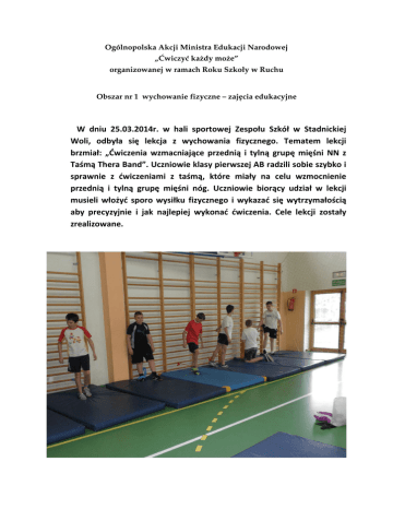 Ogólnopolska Akcji Ministra Edukacji Narodowej „Ćwiczyć każdy może” organizowanej w ramach Roku Szkoły w Ruchu Obszar nr 1 wychowanie fizyczne – zajęcia edukacyjne W dniu 25.03.2014r. w hali sportowej Zespołu Szkół w Stadnickiej Woli, odbyła się lekcja z wychowania fizycznego. Tematem lekcji brzmiał: „Ćwiczenia wzmacniające przednią i tylną grupę mięśni NN z Taśmą Thera Band”. Uczniowie klasy pierwszej AB radzili sobie szybko i sprawnie z ćwiczeniami z taśmą, które miały na celu wzmocnienie przednią i tylną grupę mięśni nóg. Uczniowie biorący udział w lekcji musieli włożyć sporo wysiłku fizycznego i wykazać się wytrzymałością aby precyzyjnie i jak najlepiej wykonać ćwiczenia. Cele lekcji zostały zrealizowane. KONSPEKT LEKCJI. PROWADZĄCY: TOMASZ NAPIERAŁA TEMAT: ĆWICZENIA WZMACNIAJĄCE PRZEDNIĄ I TYLNĄ GRUPĘ MIĘŚNI NN Z TAŚMĄ THERA-BAND. KLASA/PŁEĆ: I A, B - CHŁOPCY ILOŚĆ UCZNIÓW: 14 MIEJSCE ĆWICZEŃ: SALA GIMNASTYCZNA. CZAS: 45’ PRZYBORY: TAŚMA THERA-BAND ( CZERWONA I SZARA) , MATERACE. CELE GŁOWNE LEKCJI: 1. UMIEJĘTNOŚCI: UCZEŃ ZNA CHWYTY ORAZ PRZEZNACZENIE TAŚMY THERA-BAND®. 2. MOTORYKA: WYTRZYMAŁOŚĆ, SIŁA PRZEDNIEJ I TYLNEJ GRUPY MIĘŚNI NN. 3. WIADOMOŚCI: PRZYPOMNIENIE JAK WZMOCNIĆ PRZEDNIĄ I TYLNĄ GRUPĘ MIĘŚNI NÓG, NAJCZĘŚCIEJ WYSTĘPUJĄCE BŁĘDY W ĆWICZENIACH WZMACNIAJĄCYCH. 4. AKCENTY WYCHOWAWCZE: WPROWADZENIE NAWYKU UTRZYMANIA PRAWIDŁOWEJ POSTAWY CIAŁA, SAMODYSCYPLINY, UMIEJĘTNOŚĆ WYKONYWANIA RUCHU W PEŁNYM ZAKRESIE ORAZ RÓWNOMIERNE TEMPO WYKONYWANIA KOLEJNYCH POWTÓRZEŃ. TOK LEKCJI 1. ZORGANIZOWANIE GRUPY I SPRAWDZENIE GOTOWOŚCI DO ZAJĘĆ 2. MOTYWACJA DO ZAJĘĆ ZADANIA SZCZEGÓŁOWE 1.Zbiórka. 2.Przywitanie sportowe. 3.Sprawdzenie obecności. czas 2’ 1.Podanie tematu zajęć głównych lekcji. 2.Objaśnienia i pokaz nauczyciela. 2’ UWAGI ORGANIZACYJNO-METODYCZNE Zastępowi podają osoby nie ćwiczące oraz zbierają zbędne przedmioty np. zegarki, biżuterię itp. 3. ROZGRZEWKA 4. KSZTAŁTOWANIE UMIEJĘTNOŚCI I DOSKONALENIE SPRAWNOŚCI ORAZ ROZWIJANIE ZDOLNOŚCI TWÓRCZYCH 1. Bieg wokół sali. 2. Krążenie RR w przód. 3. Krążenie RR w tył. 4. Unoszenie kolan w przód do kąta prostego (skip A). 5. Uginanie kolan w tył uderzając piętami o pośladki (skip C). 6. Bieg krokiem odstawnodostawnym nisko na nogach wokół sali. 7. P.w. w rozkroku, krążenie bioder w prawą i lewą stronę. 8. P.w. w lekkim rozkroku, RR na biodrach, stopy odchylone na zewnątrz, uginanie kolan schodząc w dół, powrót do p.w. 9. P.w. przysiad podparty, naprzemienne wymachy NN do tyłu. 10. P.w. leżenie przodem, głowa oparta na RR, naprzemienne unoszenie NN do góry. 11. P.w. leżenie tyłem, RR wzdłuż T, NN ugięte w kolanach, unoszenie i opuszczanie pośladków i miednicy. 1. P.w. stojąc , NP odwiedziona. Ruch: przywodzenie NP do NL podporowej. 8’ Uczniowie stają w „rozsypce”, wykonują ćwiczenia w miejscu. Po 5 razy na każdą stronę 10 razy. 10 razy. 6 razy na każdą nogę. 6 razy. Taśma Thera-Band związana w pętlę, zaczepiona o szczebel drabinki oraz na wysokości stawu skokowego NP. 2. P.w. klęk podparty na przedramionach. Ruch: wyprost NL, powrót do p.w. 3. P.w. leżenie na prawym boku. Głowa oparta na wyprostowanej RP. Ruch: wznos i opust górnej nogi. 4. P.w. leżenie przodem. Ruch: zgięcie i wyprost NP w kolanie. Uczniowie biegną jeden za drugim w wolnym tempie. Środek taśmy TheraBand umieszczamy szeroko na stopie, końcówki taśmy trzymamy w RR. Plecy proste. 25’ Taśma Thera-Band związana w pętlę oraz napięta na stopach. Każde ćwiczenie wykonujemy w 3 setach po 8 razy na każdą nogę. Przerwa między setami: 30 sekund. Taśmę Thera-Band związaną w pętlę umieszczamy pod stopą NP i Uczeń indywidualnie dobiera kolor taśmy (opór) do własnych możliwości. 5. P.w. leżenie tyłem na przedramionach. Ruch: przyciąganie NL ugiętej w kolanie do klatki piersiowej, powrót do p.w. 5. USPOKOJENIE ORGANIZMU 6. CZYNNOŚCI ORGANIZACYJNE I WYCHOWAWCZODYDAKTYCZNE 7. NASTAWIENIE DO SAMODZIELNEJ PRACY 1. P.w. stojąc, NP ugięta w kolanie, przyciąganie pięty do pośladka, powrót do p.w. 2. P.w. postawa wykrocznozakroczna, NP w zgięciu podeszwowym stopy, NL ugięta w kolanie, powrót do p.w. 3. P.w. siad klęczny, RR uniesione w górę. Ruch: skłon T w przód („ukłon Japoński”) 4. P.w. siad rozkroczny, skłon T do NP, powrót do p.w., skłon T do NL, powrót do p.w. 5.P.w. siad płaski, NN ugięte w kolanach, stopy złączone podeszwami, łokcie przyciśnięte do ud po stronie wewnętrznej, dłońmi chwytamy za stopy. Ruch: napieranie przedramionami na wewnętrzną stronę ud. 6. P.w. leżenie tyłem, NN ugięte w kolanach, RR ułożone na kolanach. Ruch: przyciąganie NN do klatki piersiowej, powrót do p.w. 7. Siad skrzyżny. 1.Podsumowanie zajęć 2.Zabranie sprzętu 5’ 1.Zbiórka 2.Zachęcenie do udziału w zajęciach dodatkowych 3.Pożegnanie sportowe 2’ zaczepiamy o NL. Następnie zmiana. Nie odrywamy bioder od podłoża. Taśmę Thera-Band związaną w pętlę zaczepiamy o podeszwę stopy NP i grzbiet stopy NL, następnie przy zmianie na NP zaczepiamy taśmę o podeszwę stopy NL i grzbiet stopy NP. Wytrzymujemy pozycję, a następnie przyciągamy piętę NL. Plecy proste, RR ułożone na nodze zakrocznej, wytrzymanie pozycji, następnie zmiana nogi. Plecy proste, skłon wykonujemy z pogłębieniem. Uczniowie wykonują spokojny wdech i wydech (3 razy). 1’ Dwuszereg