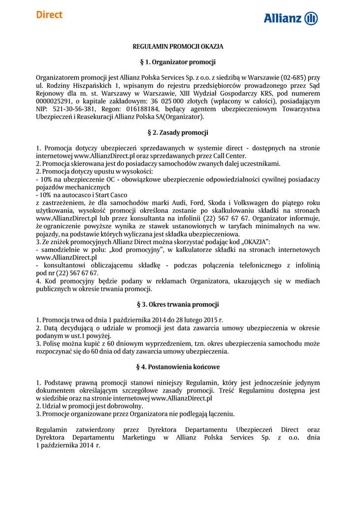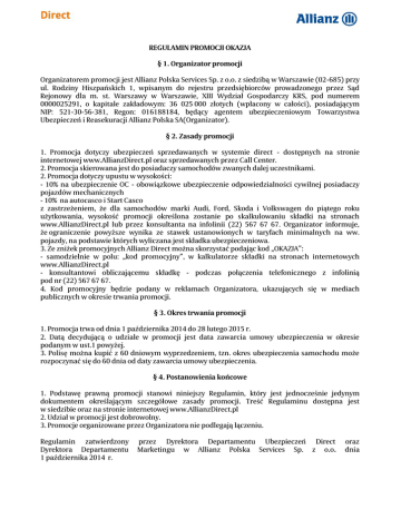 REGULAMIN PROMOCJI OKAZJA § 1. Organizator promocji Organizatorem promocji jest Allianz Polska Services Sp. z o.o. z siedzibą w Warszawie (02-685) przy ul. Rodziny Hiszpańskich 1, wpisanym do rejestru przedsiębiorców prowadzonego przez Sąd Rejonowy dla m. st. Warszawy w Warszawie, XIII Wydział Gospodarczy KRS, pod numerem 0000025291, o kapitale zakładowym: 36 025 000 złotych (wpłacony w całości), posiadającym NIP: 521-30-56-381, Regon: 016188184, będący agentem ubezpieczeniowym Towarzystwa Ubezpieczeń i Reasekuracji Allianz Polska SA(Organizator). § 2. Zasady promocji 1. Promocja dotyczy ubezpieczeń sprzedawanych w systemie direct - dostępnych na stronie internetowej www.AllianzDirect.pl oraz sprzedawanych przez Call Center. 2. Promocja skierowana jest do posiadaczy samochodów zwanych dalej uczestnikami. 2. Promocja dotyczy upustu w wysokości: - 10% na ubezpieczenie OC - obowiązkowe ubezpieczenie odpowiedzialności cywilnej posiadaczy pojazdów mechanicznych - 10% na autocasco i Start Casco z zastrzeżeniem, że dla samochodów marki Audi, Ford, Skoda i Volkswagen do piątego roku użytkowania, wysokość promocji określona zostanie po skalkulowaniu składki na stronach www.AllianzDirect.pl lub przez konsultanta na infolinii (22) 567 67 67. Organizator informuje, że ograniczenie powyższe wynika ze stawek ustanowionych w taryfach minimalnych na ww. pojazdy, na podstawie których wyliczana jest składka ubezpieczeniowa. 3. Ze zniżek promocyjnych Allianz Direct można skorzystać podając kod „OKAZJA”: - samodzielnie w polu: „kod promocyjny”, w kalkulatorze składki na stronach internetowych www.AllianzDirect.pl - konsultantowi obliczającemu składkę - podczas połączenia telefonicznego z infolinią pod nr (22) 567 67 67. 4. Kod promocyjny będzie podany w reklamach Organizatora, ukazujących się w mediach publicznych w okresie trwania promocji. § 3. Okres trwania promocji 1. Promocja trwa od dnia 1 października 2014 do 28 lutego 2015 r. 2. Datą decydującą o udziale w promocji jest data zawarcia umowy ubezpieczenia w okresie podanym w ust.1 powyżej. 3. Polisę można kupić z 60 dniowym wyprzedzeniem, tzn. okres ubezpieczenia samochodu może rozpoczynać się do 60 dnia od daty zawarcia umowy ubezpieczenia. § 4. Postanowienia końcowe 1. Podstawę prawną promocji stanowi niniejszy Regulamin, który jest jednocześnie jedynym dokumentem określającym szczegółowe zasady promocji. Treść Regulaminu dostępna jest w siedzibie oraz na stronie internetowej www.AllianzDirect.pl 2. Udział w promocji jest dobrowolny. 3. Promocje organizowane przez Organizatora nie podlegają łączeniu. Regulamin zatwierdzony Dyrektora Departamentu 1 października 2014 r. przez Dyrektora Departamentu Ubezpieczeń Direct Marketingu w Allianz Polska Services Sp. z o.o. oraz dnia