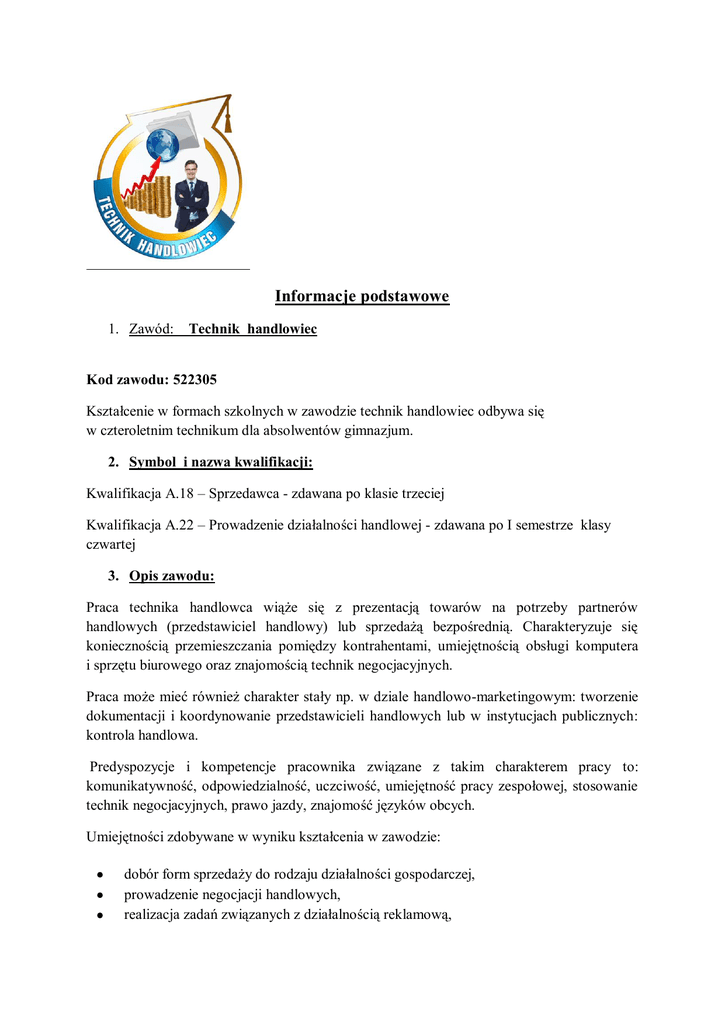 Informacje podstawowe 1. Zawód: Technik handlowiec Kod zawodu: 522305 Kształcenie w formach szkolnych w zawodzie technik handlowiec odbywa się w czteroletnim technikum dla absolwentów gimnazjum. 2. Symbol i nazwa kwalifikacji: Kwalifikacja A.18 – Sprzedawca - zdawana po klasie trzeciej Kwalifikacja A.22 – Prowadzenie działalności handlowej - zdawana po I semestrze klasy czwartej 3. Opis zawodu: Praca technika handlowca wiąże się z prezentacją towarów na potrzeby partnerów handlowych (przedstawiciel handlowy) lub sprzedażą bezpośrednią. Charakteryzuje się koniecznością przemieszczania pomiędzy kontrahentami, umiejętnością obsługi komputera i sprzętu biurowego oraz znajomością technik negocjacyjnych. Praca może mieć również charakter stały np. w dziale handlowo-marketingowym: tworzenie dokumentacji i koordynowanie przedstawicieli handlowych lub w instytucjach publicznych: kontrola handlowa. Predyspozycje i kompetencje pracownika związane z takim charakterem pracy to: komunikatywność, odpowiedzialność, uczciwość, umiejętność pracy zespołowej, stosowanie technik negocjacyjnych, prawo jazdy, znajomość języków obcych. Umiejętności zdobywane w wyniku kształcenia w zawodzie: dobór form sprzedaży do rodzaju działalności gospodarczej, prowadzenie negocjacji handlowych, realizacja zadań związanych z działalnością reklamową, znajomość procedur wyboru dostawców oraz zamawiania towaru, przygotowanie ofert handlowych i zapytań ofertowych, sporządzanie dokumentów dotyczących rozliczeń finansowych obsługa programów komputerowych stosowanych w zaopatrzeniu i sprzedaży. Innowacje realizowane w ramach programu nauczania technik handlowca w szkole: handel zagraniczny, przedstawiciel handlowy. Handlowcy są osobami cenionymi na rynku pracy. Analiza ofert pracy wykazała, że wzrasta zapotrzebowanie na specjalistów w zakresie obsługi sprzedaży i marketingu. 4. Praktyki zawodowe Szkoła organizuje praktyki zawodowe w podmiocie zapewniającym rzeczywiste warunki pracy właściwe dla nauczanego zawodu w wymiarze 4 tygodni (160 godzin) w następujących placówkach: - Bank Spółdzielczy w Jarosławiu - Urząd Skarbowy w Jarosławiu - Urząd Miasta Jarosławia - Przedsiębiorstwo Produkcyjno-Handlowo-Usługowe BIT Jarosław - Urząd Miasta i Gminy Pruchnik - Urząd Gminy Chłopice - Urząd Miasta i Gminy Sieniawa 5. Przedmioty nauczane na poziomie rozszerzonym: matematyka, geografia 6. Nauczane języki obce: język angielski, język niemiecki 7. Przedmioty brane pod uwagę przy rekrutacji: język polski, język obcy, matematyka, geografia Informacje dodatkowe 1) Instytucje, z którymi szkoła współpracuje: Biuro Rachunkowe ANNA prowadzone przez panią Annę Skrzyńską w Jarosławiu przy ulicy Kilińskiego 16 a.- podstawy prowadzenia biura rachunkowego Banku PEKAO S.A. -spotkania edukacyjne na temat funkcjonowania bankowości elektronicznej i innych usług bankowych Powiatowy Urząd Pracy w Jarosławiu- badanie predyspozycji zawodowych oraz szkolenia nt. "Własna firma krok po kroku" - metodologia tworzenia biznesplanu" Podkarpacka Agencja Energetyczna Sp. z o.o udział w kampaniach szkoleniowych w zakresie odnawialnych źródłach energii. MOSiR w Jarosławiu- realizacja zajęć z wychowania fizycznego, zajęcia praktyczne na pływalni i lodowisku. PSSE w Jarosławiu- udział w akcjach edukacyjnych 1) Uczelnie prowadzące zajęcia edukacyjne dla uczniów szkoły: Państwowa Wyższa Szkoła Techniczno- Ekonomiczna w Jarosławiu- młodzież odbywa praktyczne zajęcia z wychowania fizycznego. 2) Realizowane projekty unijne: a) Podkarpacie stawia na zawodowców b) Bezpieczna+ c) Od przedszkola do dorosłości 3) Współpraca z zagranicą: a) Ośrodek Edukacyjno- Ekologiczny SpohnsHaus w Gersheim (Niemcy) – organizacja wyjazdów edukacyjno- krajoznawczych oraz udział uczniów szkoły w projektach międzynarodowych. b) Polsko-Niemiecka Współpraca Młodzieży w Warszawie- wsparcie finansowe w zakresie realizacji projektów międzynarodowych. 4) Udział w życiu kulturalnym, religijnym, wolontariackim: a) Miejski Ośrodek Kultury w Jarosławiu- udział w cyklicznych imprezach zgodnie z kalendarzem imprez. b) Reprezentacyjny Chór Mieszany Jarosław- uczestnictwo młodzieży naszej szkoły uczestniczy w próbach i występach z chórem. c) Schronisko im. Świętego Brata Albert w Jarosławiu. 5) Turystyka, wycieczki: Wycieczki górskie: Bieszczady. Wycieczki krajoznawcze: Wybrzeże, Praga, Dolny Śląsk, Kraków, Warszawa Spływy kajakowe.