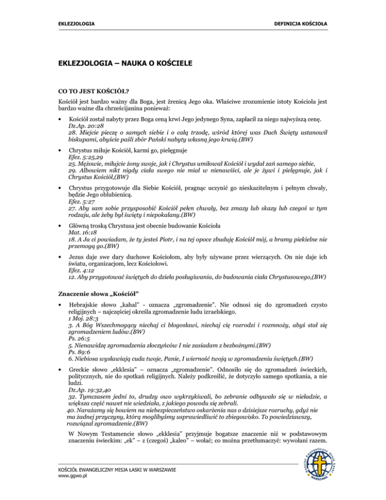 EKLEZJOLOGIA DEFINICJA KOŚCIOŁA EKLEZJOLOGIA – NAUKA O KOŚCIELE CO TO JEST KOŚCIÓŁ? Kościół jest bardzo ważny dla Boga, jest źrenicą Jego oka. Właściwe zrozumienie istoty Kościoła jest bardzo ważne dla chrześcijanina ponieważ: • Kościół został nabyty przez Boga ceną krwi Jego jedynego Syna, zapłacił za niego najwyższą cenę. Dz.Ap. 20:28 28. Miejcie pieczę o samych siebie i o całą trzodę, wśród której was Duch Święty ustanowił biskupami, abyście paśli zbór Pański nabyty własną jego krwią.(BW) • Chrystus miłuje Kościół, karmi go, pielęgnuje Efez. 5:25,29 25. Mężowie, miłujcie żony swoje, jak i Chrystus umiłował Kościół i wydał zań samego siebie, 29. Albowiem nikt nigdy ciała swego nie miał w nienawiści, ale je żywi i pielęgnuje, jak i Chrystus Kościół,(BW) • Chrystus przygotowuje dla Siebie Kościół, pragnąc uczynić go nieskazitelnym i pełnym chwały, będzie Jego oblubienicą. Efez. 5:27 27. Aby sam sobie przysposobić Kościół pełen chwały, bez zmazy lub skazy lub czegoś w tym rodzaju, ale żeby był święty i niepokalany.(BW) • Główną troską Chrystusa jest obecnie budowanie Kościoła Mat. 16:18 18. A Ja ci powiadam, że ty jesteś Piotr, i na tej opoce zbuduję Kościół mój, a bramy piekielne nie przemogą go.(BW) • Jezus daje swe dary duchowe Kościołom, aby były używane przez wierzących. On nie daje ich światu, organizacjom, lecz Kościołowi. Efez. 4:12 12. Aby przygotować świętych do dzieła posługiwania, do budowania ciała Chrystusowego,(BW) Znaczenie słowa „Kościół” • Hebrajskie słowo „kahal” - oznacza „zgromadzenie”. Nie odnosi się do zgromadzeń czysto religijnych – najczęściej określa zgromadzenie ludu izraelskiego. 1 Moj. 28:3 3. A Bóg Wszechmogący niechaj ci błogosławi, niechaj cię rozrodzi i rozmnoży, abyś stał się zgromadzeniem ludów.(BW) Ps. 26:5 5. Nienawidzę zgromadzenia złoczyńców I nie zasiadam z bezbożnymi.(BW) Ps. 89:6 6. Niebiosa wysławiają cuda twoje, Panie, I wierność twoją w zgromadzeniu świętych.(BW) • Greckie słowo „ekklesia” – oznacza „zgromadzenie”. Odnosiło się do zgromadzeń świeckich, politycznych, nie do spotkań religijnych. Należy podkreślić, że dotyczyło samego spotkania, a nie ludzi. Dz.Ap. 19:32,40 32. Tymczasem jedni to, drudzy owo wykrzykiwali, bo zebranie odbywało się w nieładzie, a większa część nawet nie wiedziała, z jakiego powodu się zebrali. 40. Narażamy się bowiem na niebezpieczeństwo oskarżenia nas o dzisiejsze rozruchy, gdyż nie ma żadnej przyczyny, którą moglibyśmy usprawiedliwić to zbiegowisko. To powiedziawszy, rozwiązał zgromadzenie.(BW) W Nowym Testamencie słowo „ekklesia” przyjmuje bogatsze znaczenie niż w podstawowym znaczeniu świeckim: „ek” – z (czegoś) „kaleo” – wołać; co można przetłumaczyć: wywołani razem. KOŚCIÓŁ EWANGELICZNY MISJA ŁASKI W WARSZAWIE www.ggwo.pl EKLEZJOLOGIA DEFINICJA KOŚCIOŁA Kościół to zgromadzenie wywołanych razem. To znaczy, że nie pojedynczych samotnych żagli i nie budowle ręką ludzką zbudowanych. 1 Kor. 12:13 13. Bo też w jednym Duchu wszyscy zostaliśmy ochrzczeni w jedno ciało - czy to Żydzi, czy Grecy, czy to niewolnicy, czy wolni, i wszyscy zostaliśmy napojeni jednym Duchem.(BW) Efez. 1:22-23 22. I wszystko poddał pod nogi jego, a jego samego ustanowił ponad wszystkim Głową Kościoła, 23. Który jest ciałem jego, pełnią tego, który sam wszystko we wszystkim wypełnia.(BW) Słowo Kościół ma dwa znaczenia, one przedstawiają nam dwa aspekty kościoła: • Kościół powszechny – duchowa wspólnota wszystkich wierzących w Chrystusa bez względu na wyznanie, narodowość, rasę czy kulturę. Jest to Ciało Chrystusa, czyli wszyscy nowonarodzeni wierzących żyjący w przeszłości, teraźniejszości i przyszłości. Podstawą przynależności do tej grupy jest chrzest Duchem Świętym wszczepiający człowieka w Chrystusa. 1 Kor. 12:13 13. Bo też w jednym Duchu wszyscy zostaliśmy ochrzczeni w jedno ciało - czy to Żydzi, czy Grecy, czy to niewolnicy, czy wolni, i wszyscy zostaliśmy napojeni jednym Duchem.(BW) Efez. 1:22-23 22. I wszystko poddał pod nogi jego, a jego samego ustanowił ponad wszystkim Głową Kościoła, 23. Który jest ciałem jego, pełnią tego, który sam wszystko we wszystkim wypełnia.(BW) 1 Tym. 3:15 15. Gdyby jednak przyjście moje się odwlokło, to masz wiedzieć, jak należy postępować w domu Bożym, który jest Kościołem Boga żywego, filarem i podwaliną prawdy.(BW) • Kościół lokalny – duchowy organizm składający się z pojedynczych wierzących żyjących w określonym położeniu geograficznym; zgromadzenie chrześcijan, którego celem jest głoszenie ewangelii i służba Bogu i ludziom. Poniższa tabelka pozwoli nam rozróżnić te 2 aspekty Kościoła KOŚCIÓŁ LOKALNY Widzialny Chrześcijaństwo jako całość • KOŚCIÓŁ POWSZECHNY Niewidzialny Ciało Chrystusa Członkostwo: zbawieni i zgubieni Członkostwo: jedynie zbawieni Jedynie żyjący (na ziemii) Zarówno umarli jak i żyjący w Chrystusie Wiele lokalnych kościołów Jedynie jeden powszechny Kościół Różne denominacje Ani jednej denominacji Część Kościoła Chrystusa Całe ciało Chrystusa Różne rodzaje zarządzania Chrystus jedyną Głową Kościoła W początkowej fazie rozwoju chrześcijaństwa „kościoły” były w domach i składały się z ludzi, którzy wyznawali swą wiarę w Jezusa Chrystusa. Rzym. 16:5 5. Także zbór, który jest w ich domu. Pozdrówcie Epeneta, umiłowanego mojego, który jest pierwszym wierzącym w Chrystusa w Azji.(BW) 1 Kor. 16:19 19. Pozdrawiają was zbory azjatyckie. Pozdrawia was w Panu serdecznie Akwila i Pryscylla ze zborem, który jest w ich domu.(BW) KOŚCIÓŁ EWANGELICZNY MISJA ŁASKI W WARSZAWIE www.ggwo.pl EKLEZJOLOGIA DEFINICJA KOŚCIOŁA Fil. 1:2 2. I do Appii, siostry, i do Archipp