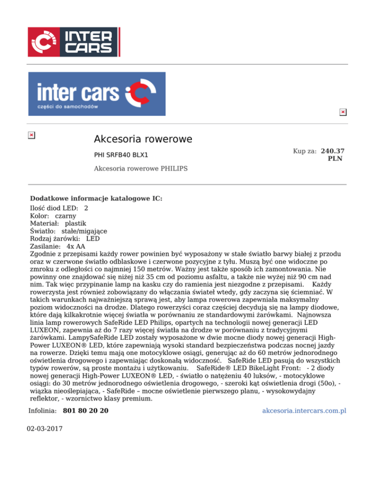 Akcesoria rowerowe PHI SRFB40 BLX1 Kup za: 240.37 PLN Akcesoria rowerowe PHILIPS Dodatkowe informacje katalogowe IC: Ilość diod LED: 2 Kolor: czarny Materiał: plastik Światło: stałe/migające Rodzaj żarówki: LED Zasilanie: 4x AA Zgodnie z przepisami każdy rower powinien być wyposażony w stałe światło barwy białej z przodu oraz w czerwone światło odblaskowe i czerwone pozycyjne z tyłu. Muszą być one widoczne po zmroku z odległości co najmniej 150 metrów. Ważny jest także sposób ich zamontowania. Nie powinny one znajdować się niżej niż 35 cm od poziomu asfaltu, a także nie wyżej niż 90 cm nad nim. Tak więc przypinanie lamp na kasku czy do ramienia jest niezgodne z przepisami. Każdy rowerzysta jest również zobowiązany do włączania świateł wtedy, gdy zaczyna się ściemniać. W takich warunkach najważniejszą sprawą jest, aby lampa rowerowa zapewniała maksymalny poziom widoczności na drodze. Dlatego rowerzyści coraz częściej decydują się na lampy diodowe, które dają kilkakrotnie więcej światła w porównaniu ze standardowymi żarówkami. Najnowsza linia lamp rowerowych SafeRide LED Philips, opartych na technologii nowej generacji LED LUXEON, zapewnia aż do 7 razy więcej światła na drodze w porównaniu z tradycyjnymi żarówkami. LampySafeRide LED zostały wyposażone w dwie mocne diody nowej generacji HighPower LUXEON® LED, które zapewniają wysoki standard bezpieczeństwa podczas nocnej jazdy na rowerze. Dzięki temu mają one motocyklowe osiągi, generując aż do 60 metrów jednorodnego oświetlenia drogowego i zapewniając doskonałą widoczność. SafeRide LED pasują do wszystkich typów rowerów, są proste montażu i użytkowaniu. SafeRide® LED BikeLight Front: - 2 diody nowej generacji High-Power LUXEON® LED, - światło o natężeniu 40 luksów, - motocyklowe osiągi: do 30 metrów jednorodnego oświetlenia drogowego, - szeroki kąt oświetlenia drogi (50o), wiązka nieoślepiająca, - SafeRide – mocne oświetlenie pierwszego planu, - wysokowydajny reflektor, - wzornictwo klasy premium. Infolinia: 801 80 20 20 02-03-2017 akcesoria.intercars.com.pl