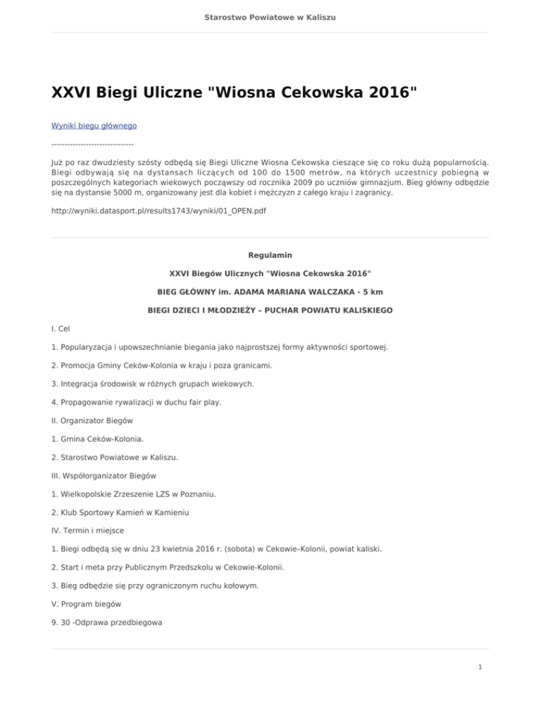 Starostwo Powiatowe w Kaliszu XXVI Biegi Uliczne "Wiosna Cekowska 2016" Wyniki biegu głównego ------------------------------Już po raz dwudziesty szósty odbędą się Biegi Uliczne Wiosna Cekowska cieszące się co roku dużą popularnością. Biegi odbywają się na dystansach liczących od 100 do 1500 metrów, na których uczestnicy pobiegną w poszczególnych kategoriach wiekowych począwszy od rocznika 2009 po uczniów gimnazjum. Bieg główny odbędzie się na dystansie 5000 m, organizowany jest dla kobiet i mężczyzn z całego kraju i zagranicy. http://wyniki.datasport.pl/results1743/wyniki/01_OPEN.pdf Regulamin XXVI Biegów Ulicznych "Wiosna Cekowska 2016" BIEG GŁÓWNY im. ADAMA MARIANA WALCZAKA - 5 km BIEGI DZIECI I MŁODZIEŻY – PUCHAR POWIATU KALISKIEGO I. Cel 1. Popularyzacja i upowszechnianie biegania jako najprostszej formy aktywności sportowej. 2. Promocja Gminy Ceków-Kolonia w kraju i poza granicami. 3. Integracja środowisk w różnych grupach wiekowych. 4. Propagowanie rywalizacji w duchu fair play. II. Organizator Biegów 1. Gmina Ceków-Kolonia. 2. Starostwo Powiatowe w Kaliszu. III. Współorganizator Biegów 1. Wielkopolskie Zrzeszenie LZS w Poznaniu. 2. Klub Sportowy Kamień w Kamieniu IV. Termin i miejsce 1. Biegi odbędą się w dniu 23 kwietnia 2016 r. (sobota) w Cekowie–Kolonii, powiat kaliski. 2. Start i meta przy Publicznym Przedszkolu w Cekowie-Kolonii. 3. Bieg odbędzie się przy ograniczonym ruchu kołowym. V. Program biegów 9. 30 -Odprawa przedbiegowa 1 Starostwo Powiatowe w Kaliszu 10.00 - Oficjalne otwarcie biegów ( powitanie, odegranie Hymnu Państwowego, odczytanie apelu olimpijskiego) 10.20 - Rozpoczęcie konkurencji biegowych dzieci i młodzieży 12.25 -START BIEGU GŁÓWNEGO 13.10 - Podanie wyników oraz ceremonia dekoracji biegu dla dzieci i młodzieży 13.30 - Ceremonia dekoracji biegu głównego 13.40 - Oficjalne zakończenie biegów 14.30 - Podsumowanie biegów VI. Adres biura - organizatora Gminne Centrum Promocji Kultury Sportu i Rekreacji w Cekowie-Kolonii Ceków-Kolonia 51, 62-834 Ceków tel. (62) 76 31 016, tel. , (62) 76 31 002, (+48) 602 833 324, fax. 62 76 31 151 e-mail: [email protected] , www.cekow.pl BIEG GŁÓWNY im. ADAMA MARIANA WALCZAKA - 5 km I. Warunki uczestnictwa 1. W biegu mogą wziąć udział osoby, które ukończyły 17 rok życia. 2. Prawo startu mają kobiety i mężczyźni z całego kraju i z zagranicy. 3. Osoby niepełnoletnie zobowiązane są do dostarczenia zgody rodziców (opiekunów). 4. Zawodnicy zobowiązani są do przedstawienia zaświadczenia lekarskiego o zdolności do udziału w biegach lub do podpisania oświadczenia udziału w biegach na własną odpowiedzialność. II. Zgłoszenia 1. Zgłoszenia należy dokonywać do dnia 21 kwietnia 2016 r. , za pośrednictwem formularza dostępnego na stronie internetowej http://www.online.datasport.pl/zapisy/. Obowiązuje limit 200 zawodników W treści podajemy imię, nazwisko, datę urodzenia, miejscowość lub nazwę klubu. 2. W dniu zawodów zgłoszenia zawodników będą przyjmowane do godz. 11.00 w biurze biegów ( tylko w sytuacji, gdy nie zostanie przekroczony wyznaczony limit startujących ). 3. Każdy zawodnik rejestrując się wyraża zgodę na przetwarzanie danych osobowych dla celów weryfikacji i umieszczenia w komunikacie końcowym. Zgoda dotyczy również wykorzystania danych teleadresowych do ewentualnej korespondencji z zawodnikiem w sprawach dotyczących biegu oraz wykorzstania jego wizerunku widniejącego na otografiach. III. Wpisowe 1 . Opłata startowa ( wpisowe ) 2 Starostwo Powiatowe w Kaliszu - w wysokości 25 zł do 21 kwietnia 2016r. - w wysokości 30 zł w dniu biegu 2. Wnoszenie opłaty startowej w systemie Datasport bezpośrednio po rejestracji. - W treści: Imię i nazwisko zawodnika, miejscowość, z dopiskiem opłata za bieg 3. Opłata za udział nie ulega zwrotowi. 4. W ramach opłaty zawodnik otrzyma : pamiątkowy medal, numer startowy, posiłek, ciepłe i zimne napoje. 5. Numery startowe wydawane będą po okazaniu dowodu tożsamości oraz dowodu wpłaty w dniu biegu. IV. Klasyfikacja 1. Klasyfikacja generalna 2. Klasyfikacja wiekowa kobiet i mężczyzn K I - (1999-1997) M I - (1999-1997) K II - (1996 -1987) M II - (1996-1987) K III- (1986 – 1977) M III- ( 1986 - 1977) K IV- (1976 - 1967) M IV- (1976 -1967) K V - (1966 – 1957) M V - (1966 - 1957) K VI - (1956 - 1947) M VI- (1956- 1947) K VII- (1946 i starsze roczniki) M VII- (1946 i starsze roczniki) V. Nagrody. 1. W klasyfikacji generalnej Kobiety i mężczyźni I miejsce - 500 zł , puchar, nagroda rzeczowa II miejsce - 400 zł, puchar, nagroda rzeczowa III miejsce - 300 zł, puchar, nagroda rzeczowa IV miejsce - nagroda rzeczowa V miejsce - nagroda rzeczowa VI miejsce - nagroda rzeczowa 2. W kategoriach wiekowych I do III miejsca - dyplomy, nagrody rzeczowe 3. Każdy z uczestników biegu, po przekroczeniu linii mety otrzyma pamiątkowy medal. VI. Pomiar czasu Uczestnicy, którzy ukończą bieg zostaną zweryfikowani przy pomocy elektronicznego pomiaru czasu wykonanego 3 Starostwo Powiatowe w Kaliszu przez zewnętrzną firmę Datasport. VII. Postanowienia końcowe. 1. Opiekę medyczną zapewnia organizator. 2. Biegi odbędą się bez względu na warunki atmosferyczne i zostaną przeprowadzone zgodnie z przepisami. 3. Zawodnicy nie posiadający na mecie zgłoszenia startowego nie będą klasyfikowani. 4. Uczestnicy przyjeżdżają na koszt własny. 5. Organizatorzy nie zapewniają noclegów. Informacje w sprawie noclegów na stronie http://www.cekow.pl (zakładka baza noclegowa). 6. Wszelkie sprawy sporne i nie ujęte w niniejszym Regulaminie rozstrzyga komisja odwoławcza i organizator. 7. Organizator zastrzega sobie prawo do wprowadzenia zmian w Regulaminie. Wiążąca i ostateczna interpretacja regulaminu należy do organizatora. BIEGI DZIECI I MŁODZIEŻY – PUCHAR POWIATU KALISKIEGO I. Klasyfikacja 1. Klasyfikacja drużynowa szkół podstawowych i gimnazjów -