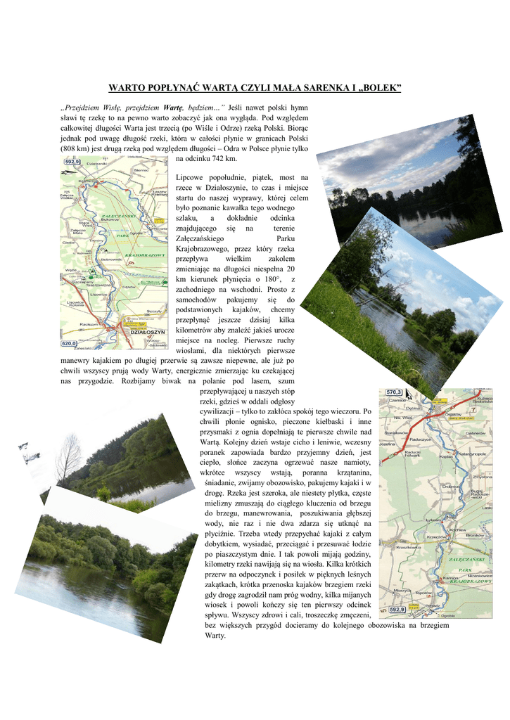 WARTO POPŁYNĄĆ WARTĄ CZYLI MAŁA SARENKA I „BOLEK” „Przejdziem Wisłę, przejdziem Wartę, będziem…” Jeśli nawet polski hymn sławi tę rzekę to na pewno warto zobaczyć jak ona wygląda. Pod względem całkowitej długości Warta jest trzecią (po Wiśle i Odrze) rzeką Polski. Biorąc jednak pod uwagę długość rzeki, która w całości płynie w granicach Polski (808 km) jest drugą rzeką pod względem długości – Odra w Polsce płynie tylko na odcinku 742 km. Lipcowe popołudnie, piątek, most na rzece w Działoszynie, to czas i miejsce startu do naszej wyprawy, której celem było poznanie kawałka tego wodnego szlaku, a dokładnie odcinka znajdującego się na terenie Załęczańskiego Parku Krajobrazowego, przez który rzeka przepływa wielkim zakolem zmieniając na długości niespełna 20 km kierunek płynięcia o 180°, z zachodniego na wschodni. Prosto z samochodów pakujemy się do podstawionych kajaków, chcemy przepłynąć jeszcze dzisiaj kilka kilometrów aby znaleźć jakieś urocze miejsce na nocleg. Pierwsze ruchy wiosłami, dla niektórych pierwsze manewry kajakiem po długiej przerwie są zawsze niepewne, ale już po chwili wszyscy prują wody Warty, energicznie zmierzając ku czekającej nas przygodzie. Rozbijamy biwak na polanie pod lasem, szum przepływającej u naszych stóp rzeki, gdzieś w oddali odgłosy cywilizacji – tylko to zakłóca spokój tego wieczoru. Po chwili płonie ognisko, pieczone kiełbaski i inne przysmaki z ognia dopełniają te pierwsze chwile nad Wartą. Kolejny dzień wstaje cicho i leniwie, wczesny poranek zapowiada bardzo przyjemny dzień, jest ciepło, słońce zaczyna ogrzewać nasze namioty, wkrótce wszyscy wstają, poranna krzątanina, śniadanie, zwijamy obozowisko, pakujemy kajaki i w drogę. Rzeka jest szeroka, ale niestety płytka, częste mielizny zmuszają do ciągłego kluczenia od brzegu do brzegu, manewrowania, poszukiwania głębszej wody, nie raz i nie dwa zdarza się utknąć na płyciźnie. Trzeba wtedy przepychać kajaki z całym dobytkiem, wysiadać, przeciągać i przesuwać łodzie po piaszczystym dnie. I tak powoli mijają godziny, kilometry rzeki nawijają się na wiosła. Kilka krótkich przerw na odpoczynek i posiłek w pięknych leśnych zakątkach, krótka przenoska kajaków brzegiem rzeki gdy drogę zagrodził nam próg wodny, kilka mijanych wiosek i powoli kończy się ten pierwszy odcinek spływu. Wszyscy zdrowi i cali, troszeczkę zmęczeni, bez większych przygód docieramy do kolejnego obozowiska na brzegiem Warty. Duża łąka pozwala bez problemu rozbić kilka namiotów, a pobliski las dostarcza drewna na ognisko. Dzisiaj w Turtrekowej kuchni, kolejne już w tym roku, danie z kociołka – Leczo Trapera!!! Na szczęście nic nikomu nie zaszkodziło i najedzeni mogliśmy oddać się błogiemu leniuchowaniu przy blasku ogniska. Ale żeby nie było zbyt dobrze, niespokojne duchy spływu Magda i Kasia namówiły wszystkich do udziału w zabawie o nazwie Kalambury, gdzie tematem przewodnim były bajki. Przebojem wieczoru okazał się pokaz Małej Syrenki pomylonej z Sarenką oraz bajki Bolek i Lolek, gdzie pokrętne ścieżki skojarzeń doprowadziły do porównania Bolka z Wałęsą!!! I tak wśród wesołych kalamburów wieczór dobiegał końca, a do snu kołysały nas tym razem odgłosy wiejskiej dyskoteki. Niedzielny ranek był jeszcze cieplejszy i bardziej słoneczny od poprzedniego. Na śniadanie jedną z potraw okazała się, będąca już naszą tradycją spływową, pożywna owsianka na słodko z owocami przeróżnej maści. Ale czas ruszać dalej, przed nami ostatni odcinek krętej rzeki. Po drodze czeka nas sporo kajakowych atrakcji w postaci licznych kamieni w nurcie, orzeźwiających bystrzy i zniszczonych progów. Wszystkie przeszkody pokonujemy jednak bardzo sprawnie i nieuchronnie zbliżamy się do końca wyprawy. Meta spływu to miejscowość Osjaków – 50 km rzeki, trochę wspomnień i nowych doświadczeń za nami. Teraz już tylko przed nami droga powrotna do domu. Pakujemy siebie i cały nasz dobytek do busa z wypożyczalni kajaków, który odwozi nas do Działoszyna, gdzie czekają pozostawione tam samochody. „Przejdziem Wisłę, przejdziem Wartę, będziem Kajakarzami”!!!