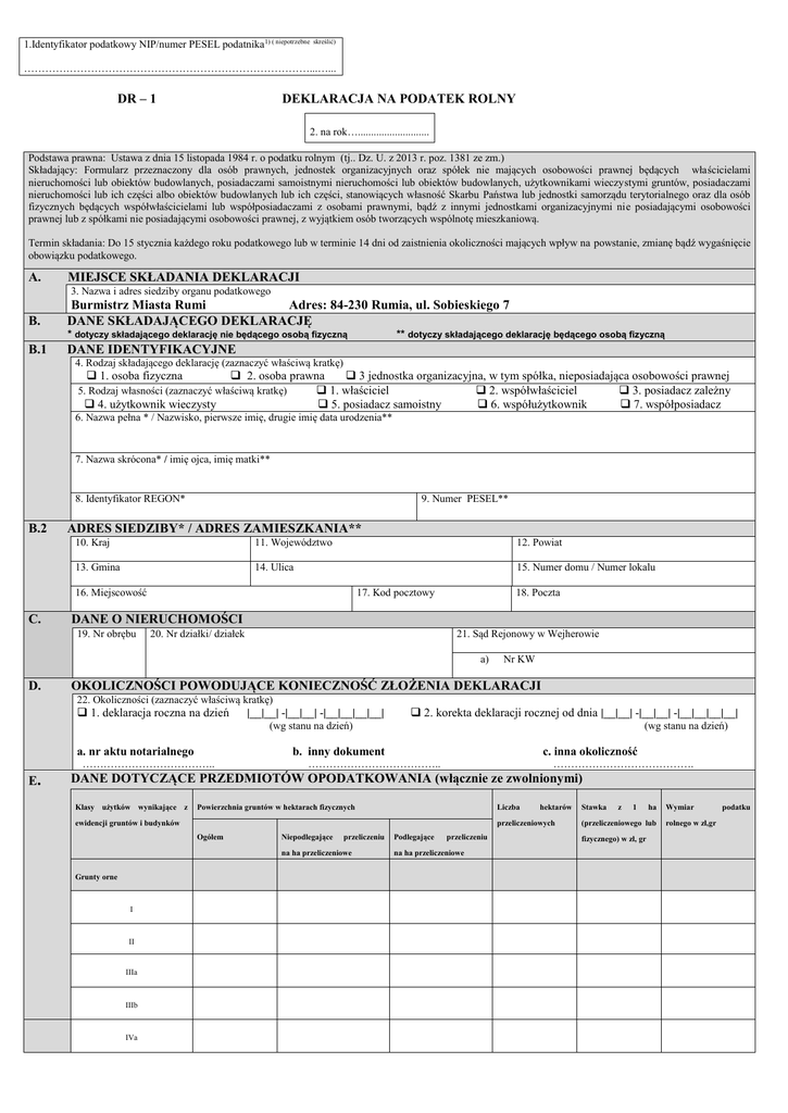 1.Identyfikator podatkowy NIP/numer PESEL podatnika1) ( niepotrzebne skreślić) ………………………………………………………………………...…... DR – 1 DEKLARACJA NA PODATEK ROLNY 2. na rok…........................... Podstawa prawna: Ustawa z dnia 15 listopada 1984 r. o podatku rolnym (tj.. Dz. U. z 2013 r. poz. 1381 ze zm.) Składający: Formularz przeznaczony dla osób prawnych, jednostek organizacyjnych oraz spółek nie mających osobowości prawnej będących właścicielami nieruchomości lub obiektów budowlanych, posiadaczami samoistnymi nieruchomości lub obiektów budowlanych, użytkownikami wieczystymi gruntów, posiadaczami nieruchomości lub ich części albo obiektów budowlanych lub ich części, stanowiących własność Skarbu Państwa lub jednostki samorządu terytorialnego oraz dla osób fizycznych będących współwłaścicielami lub współposiadaczami z osobami prawnymi, bądź z innymi jednostkami organizacyjnymi nie posiadającymi osobowości prawnej lub z spółkami nie posiadającymi osobowości prawnej, z wyjątkiem osób tworzących wspólnotę mieszkaniową. Termin składania: Do 15 stycznia każdego roku podatkowego lub w terminie 14 dni od zaistnienia okoliczności mających wpływ na powstanie, zmianę bądź wygaśnięcie obowiązku podatkowego. A. MIEJSCE SKŁADANIA DEKLARACJI 3. Nazwa i adres siedziby organu podatkowego B. Burmistrz Miasta Rumi Adres: 84-230 Rumia, ul. Sobieskiego 7 DANE SKŁADAJĄCEGO DEKLARACJĘ B.1 DANE IDENTYFIKACYJNE * dotyczy składającego deklarację nie będącego osobą fizyczną ** dotyczy składającego deklarację będącego osobą fizyczną 4. Rodzaj składającego deklarację (zaznaczyć właściwą kratkę) 1. osoba fizyczna 2. osoba prawna 3 jednostka organizacyjna, w tym spółka, nieposiadająca osobowości prawnej 1. właściciel 2. współwłaściciel 3. posiadacz zależny 5. posiadacz samoistny 6. współużytkownik 7. współposiadacz 5. Rodzaj własności (zaznaczyć właściwą kratkę) 4. użytkownik wieczysty 6. Nazwa pełna * / Nazwisko, pierwsze imię, drugie imię data urodzenia** 7. Nazwa skrócona* / imię ojca, imię matki** 8. Identyfikator REGON* B.2 9. Numer PESEL** ADRES SIEDZIBY* / ADRES ZAMIESZKANIA** 10. Kraj 11. Województwo 12. Powiat 13. Gmina 14. Ulica 15. Numer domu / Numer lokalu 16. Miejscowość C. 17. Kod pocztowy 18. Poczta DANE O NIERUCHOMOŚCI 19. Nr obrębu 20. Nr działki/ działek 21. Sąd Rejonowy w Wejherowie a) D. OKOLICZNOŚCI POWODUJĄCE KONIECZNOŚĆ ZŁOŻENIA DEKLARACJI 22. Okoliczności (zaznaczyć właściwą kratkę) 1. deklaracja roczna na dzień |__|__| |__|__| -|__|__|__|__| (wg stanu na dzień) a. nr aktu notarialnego 2. korekta deklaracji rocznej od dnia |__|__| |__|__| -|__|__|__|__| (wg stanu na dzień) c. inna okoliczność b. inny dokument ……………………………….. E. Nr KW ……………………………….. …………………………………. DANE DOTYCZĄCE PRZEDMIOTÓW OPODATKOWANIA (włącznie ze zwolnionymi) Klasy użytków wynikające z Powierzchnia gruntów w hektarach fizycznych Liczba ewidencji gruntów i budynków Przelicznik Ogółem Niepodlegające przeliczeniu na ha przeliczeniowe 1) Powierzchnia w ha przeliczeniowych Grunty orne I II IIIa IIIb IVa hektarów przeliczeniowych Podlegające przeliczeniu na ha przeliczeniowe Stawka z 1 ha (przeliczeniowego lub fizycznego) w zł, gr Wymiar rolnego w zł,gr podatku IVb V VI VIz Sady I II IIIa IIIb IVa IVb V VI VIz Użytki zielone (łąki trwałe, pastwiska trwałe Łąki trwałe I II III IV V VI VIz Pastwiska trwałe I II III IV V VI VIz Grunty: a) Pod stawami zarybione łososiem, trocią, głowacicą, palią i pstrągiem b) Pod stawami zarybione innymi gatunkami ryb niż w poz. a; grunty pod stawami niezarybionymi c) rolne zabudowane d) zadrzewione i zakrzewione na użytkach rolnych e) pod rowami Razem (bez zwolnień) F. INFORMACJA O PRZEDMIOTACH ZWOLNIONYCH (podać rodzaj, klasę i powierzchnię gruntów zwolnionych oraz przepis prawa – z jakiego tytułu występuje zwolnienie) 23. G. INFORMACJA O UŻYTKACH RZECZYPOSPOLITEJ POLSKIEJ ROLNYCH POŁOŻONYCH NA TERENIE INNYCH GMIN (MIAST) (podać nazwę gminy, powiat, województwo oraz rodzaj, klasę i powierzchnię użytków rolnych) 24. H. I. ULGI W PODATKU ROLNYM OD GRUNTÓW a) b) 25. 26. c) 27. Razem 28. ŁĄCZNA KWOTA PODATKU Kwota podatku (zaokrąglić do pełnych złotych) J. 29. OŚWIADCZENIE I PODPIS PODATNIKA / OSOBY REPREZENTUJĄCEJ PODATNIKA Oświadczam, że podane przeze mnie dane są zgodne z prawdą. K. 30.Imię i Nazwisko 31. Numer telefonu / Adres poczty elektronicznej 32.Data wypełnienia (dzień - miesiąc - rok) 33. Data i podpis (pieczęć) składającego / osoby reprezentującej składającego ADNOTACJE ORGANU PODATKOWEGO 34.Uwagi organu podatkowego 35. Data 36. Podpis przyjmującego formularz POUCZENIA: W przypadku niewpłacenia w określonych ustawowo terminach kwoty należnego podatku lub wpłacenia jej w niepełnej wysokości, niniejsza deklaracja stanowi podstawę do wystawienia tytułu wykonawczego, zgodnie z przepisami ustawy z dn. 17 czerwca 1966r. o postępowaniu egzekucyjnym w administracji (tj.Dz.U. z 2014r.,poz.1619, z późn.zm.). 1 W poz. 1 deklaracji na podatek rolny DR-1 numer PESEL wpisują podatnicy będący osobami fizycznymi objętymi rejestrem PESEL nieprowadzący działalności gospodarczej lub niebędący zarejestrowanymi podatnikami podatku od towarów i usług. Identyfikator podatkowy NIP wpisują pozostali podatnicy.