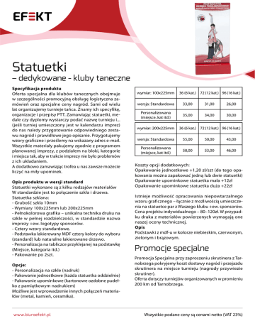 Statuetki – dedykowane - kluby taneczne Specyfikacja produktu Oferta specjalna dla klubów tanecznych obejmuje w szczególności promocyjną obsługę logistyczna zamówień oraz specjalne ceny nagród. Sami od wielu lat organizujemy turnieje tańca. Znamy ich specyfikę, organizacje i przepisy PTT. Zamawiając statuetki, medale czy dyplomy wystarczy podać nazwę turnieju i... (jeśli turniej umieszczony jest w kalendarzu imprez) do nas należy przygotowanie odpowiedniego zestawu nagród i prawidłowe jego opisanie. Przygotujemy wzory graficzne i prześlemy na wskazany adres e-mail. Wszystkie materiały pakujemy zgodnie z programem planowanej imprezy, z podziałem na bloki, kategorie i miejsca tak, aby w trakcie imprezy nie było problemów z ich układaniem. A dodatkowo zamawiając trofea u nas zawsze możecie liczyć na miły upominek. Opis produktu w wersji standard Statuetki wykonane są z kilku rodzajów materiałów W standardzie jest to połączenie szkła i drzewa. Statuetka szklana: - Grubość szkła 10mm - Wymiary 100x225mm lub 200x225mm - Pełnokolorowa grafika – unikalna technika druku na szkle w pełnej rozdzielczości, w standardzie nazwa imprezy +ew. logotypy sponsorów. - Cztery wzory standardowe. - Podstawka lakierowany MDF cztery kolory do wyboru (standard) lub naturalne lakierowane drzewo. - Personalizacja na tabliczce przyklejanej na podstawkę (Miejsce, kategoria itd.) - Pakowanie po 2szt. Opcje: - Personalizacja na szkle (nadruk) - Pakowanie jednostkowe (każda statuetka oddzielnie) - Pakowanie upominkowe (kartonowe ozdobne pudełko z pamiątkowym nadrukiem) Możliwe jest wprowadzenie innych połączeń materiałów (metal, kamień, ceramika). www.biuroefekt.pl wymiar: 100x225mm 36 (6 kat.) 72 (12 kat.) 96 (16 kat.) wersja: Standardowa 33,00 31,00 26,00 Personalizowana (miejsce, kat itd.) 35,00 34,00 30,00 wymiar: 200x225mm 36 (6 kat.) 72 (12 kat.) 96 (16 kat.) wersja: Standardowa 55,00 50,00 43,00 Personalizowana (miejsce, kat itd.) 58,00 53,00 46,00 Koszty opcji dodatkowych: Opakowanie jednostkowe +1,20 zł/szt (do tego opakowania można zapakować jedną lub dwie statuetki) Opakowanie upominkowe statuetka mała +12zł Opakowanie upominkowe statuetka duża +22zł Istnieje możliwość opracowania niepowtarzalnego wzoru graficznego – łącznie z możliwością umieszczenia na statuetce par z Waszego klubu +ew. sponsorów. Cena projektu indywidualnego – 80–120zł. W przypadku druku z materiałów powierzonych wymagają one naszej oceny technicznej. Opis Podstawki z mdf-u w kolorze niebieskim, czerwonym, zielonym i brązowym. Promocje specjalne Promocja Specjalna przy zaproszeniu skrutinera z Tarnobrzega pokryjemy koszt dostawy nagród i przejazdu skrutinera na miejsce turnieju (nagrody przywiezie skrutiner). Oferta dotyczy turniejów organizowanych w promieniu 200 km od Tarnobrzega. Wszystkie podane ceny są cenami netto (VAT 23%) Podstawki pod statuetki MDF Podstawki z mdf-u w kolorze niebieskim, czerwonym, niebieskim i brązowym. Drewniane Opis Naturalne lakierowane drewno bukowe dostępne w dwóch rozmiarach 2x4,2cm i 20x4,2cm www.biuroefekt.pl Wszystkie podane ceny są cenami netto (VAT 23%)