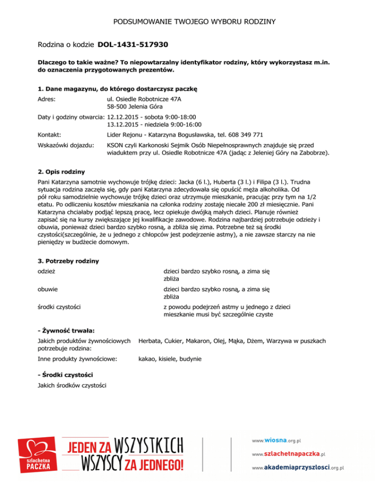 PODSUMOWANIE TWOJEGO WYBORU RODZINY Rodzina o kodzie DOL-1431-517930 Dlaczego to takie ważne? To niepowtarzalny identyfikator rodziny, który wykorzystasz m.in. do oznaczenia przygotowanych prezentów. 1. Dane magazynu, do którego dostarczysz paczkę Adres: ul. Osiedle Robotnicze 47A 58-500 Jelenia Góra Daty i godziny otwarcia: 12.12.2015 - sobota 9:00-18:00 13.12.2015 - niedziela 9:00-16:00 Kontakt: Lider Rejonu - Katarzyna Bogusławska, tel. 608 349 771 Wskazówki dojazdu: KSON czyli Karkonoski Sejmik Osób Niepełnosprawnych znajduje się przed wiaduktem przy ul. Osiedle Robotnicze 47A (jadąc z Jeleniej Góry na Zabobrze). 2. Opis rodziny Pani Katarzyna samotnie wychowuje trójkę dzieci: Jacka (6 l.), Huberta (3 l.) i Filipa (3 l.). Trudna sytuacja rodzina zaczęła się, gdy pani Katarzyna zdecydowała się opuścić męża alkoholika. Od pół roku samodzielnie wychowuje trójkę dzieci oraz utrzymuje mieszkanie, pracując przy tym na 1/2 etatu. Po odliczeniu kosztów mieszkania na członka rodziny zostaję niecałe 200 zł miesięcznie. Pani Katarzyna chciałaby podjąć lepszą pracę, lecz opiekuje dwójką małych dzieci. Planuje również zapisać się na kursy zwiększające jej kwalifikacje zawodowe. Rodzina najbardziej potrzebuje odzieży i obuwia, ponieważ dzieci bardzo szybko rosną, a zbliża się zima. Potrzebne też są środki czystości(szczególnie, że u jednego z chłopców jest podejrzenie astmy), a nie zawsze starczy na nie pieniędzy w budżecie domowym. 3. Potrzeby rodziny odzież dzieci bardzo szybko rosną, a zima się zbliża obuwie dzieci bardzo szybko rosną, a zima się zbliża środki czystości z powodu podejrzeń astmy u jednego z dzieci mieszkanie musi być szczególnie czyste - Żywność trwała: Jakich produktów żywnościowych potrzebuje rodzina: Herbata, Cukier, Makaron, Olej, Mąka, Dżem, Warzywa w puszkach Inne produkty żywnościowe: kakao, kisiele, budynie - Środki czystości Jakich środków czystości PODSUMOWANIE TWOJEGO WYBORU RODZINY Rodzina o kodzie DOL-1431-517930 potrzebuje rodzina: Proszek do prania, Płyn do mycia naczyń, Mydło/żel myjący, Pasta do zębów, Płyny czyszczące, Szampon, Szczoteczka do zębów - Odzież Hubert Rodzaj odzieży: zimowe Kategoria: kurtka, bluzki, spodnie Rozmiar: 92 Sylwetka: szczupły Uwagi: Filip Rodzaj odzieży: zimowe Kategoria: kurtka, bluzki, spodnie Rozmiar: 92 Sylwetka: szczupły Uwagi: Jacek Rodzaj odzieży: zimowe Kategoria: kurtka, bluzki, spodnie Rozmiar: 128 Sylwetka: szczupły Uwagi: Katarzyna Rodzaj odzieży: zimowe Kategoria: kurtka, bluzki, spodnie Rozmiar: M Sylwetka: szczupła Uwagi: - Obuwie Hubert PODSUMOWANIE TWOJEGO WYBORU RODZINY Rodzina o kodzie DOL-1431-517930 Rodzaj obuwia: zimowe Kategoria: trapery Rozmiar: 24 Uwagi: Filip Rodzaj obuwia: zimowe Kategoria: trapery Rozmiar: 26 Uwagi: Jacek Rodzaj obuwia: zimowe Kategoria: trapery Rozmiar: 30 Uwagi: Katarzyna Rodzaj obuwia: zimowe Kategoria: kozaki Rozmiar: 39 Uwagi: - Pomoce szkolne Jakich pomocy szkolnych potrzebuje rodzina? Zeszyty, Farbki, Papier kolorowy, Plecak, Bloki, Klej, Nożyczki, Przybory do pisania, Kredki, Plastelina, Piórnik - Specjalne upominki Hubert - koparka (zabawkowa) Filip - auto sportowe Jacek -buty halowe, ew. strój piłkarski Katarzyna - zabiegi kosmetyczne 4. Osoby opiekujące sie rodziną - Wolontariusz opiekun rodziny PODSUMOWANIE TWOJEGO WYBORU RODZINY Rodzina o kodzie DOL-1431-517930 E-mail: [email protected] Telefon: 721043368, 721043368 Preferowana forma kontaktu: Od poniedziałku do piątku do godzin popołudniowych jestem na uczelni. Weekendy mam wolne. - Lider Rejonu Imię i nazwisko: Katarzyna Bogusławska 5. Jak jeszcze możemy Ci pomóc? Przekazujemy praktyczne wskazówki w przygotowaniu paczki. * Paczki możesz dostarczyć wyłącznie do tego magazynu, z którego wybrana została rodzina. * Pamiętaj, że po wybraniu przez Ciebie rodziny nikt inny nie będzie już dla niej przygotowywał paczki. * Nie musisz zaspokoić wszystkich potrzeb rodziny, zwróć jednak uwagę, że wszystkie wymienione rzeczy są dla rodziny bardzo ważne. * Rzeczy, które podarujesz rodzinie powinny być dla niej prezentem. Nie muszą być one nowe, a jeśli są używane – niech będą zadbane. Paczka przygotowywana jest z myślą o drugim człowieku – jest jak prezent. Przygotuj paczkę tak, by podniosła poczucie własnej wartości u obdarowanych przez Ciebie osób. * Paczki powinny być podzielone na kilka, poręcznych, niezbyt ciężkich pudeł, prosimy nie dostarczać do magazynu produktów zapakowanych w reklamówki czy worki foliowe. Należy pamiętać, że w większości magazynów nie będzie sprzętu do transportu przygotowanych paczek - będą one noszone ręcznie siłami Drużyny SZLACHETNEJ PACZKI. * Każde pudło i inne pakunki powinny być opisane kodem rodziny oraz opatrzone numerem, pudła i pakunki należy numerować według klucza: np. 1 z 5, 2 z 5 itd. * W Paczce powinny znaleźć się suche i trwałe artykuły spożywcze. Prosimy, aby nie pakować do pudeł produktów, które łatwo ulegają uszkodzeniu, wylaniu, rozgnieceniu. * Aby prezent nabrał świątecznego charakteru można owinąć pudła świątecznym papierem! Warto też dodać kilka słów od siebie dla rodziny – chociażby na świątecznej kartce, czy w liście. 6. Aby cała Polska mogła na żywo śledzić wyniki SZLACHETNEJ PACZKI… … w trakcie finału w magazynach będziemy wybierali informacje o wartości paczki i liczbie osób zaangażowanych w jej przygotowanie. Jednak nie uda nam się to bez Waszego wsparcia. Możecie sprawić, że przekazywane w świat wyniki będą prawdziwe i będą cieszyły całą Polskę. Prosimy – w czasie wizyty w magazynie wypełnij kartę i wrzuć do pudełka. Badanie jest anonimowe, a jego wynik analizowany będzie jedynie w zbiorczym zestawieniu. PODSUMOWANIE TWOJEGO WYBORU RODZINY Rodzina o kodzie DOL-1431-517930 7. Jeśli chcesz, możesz docenić też rodzinę medalem za