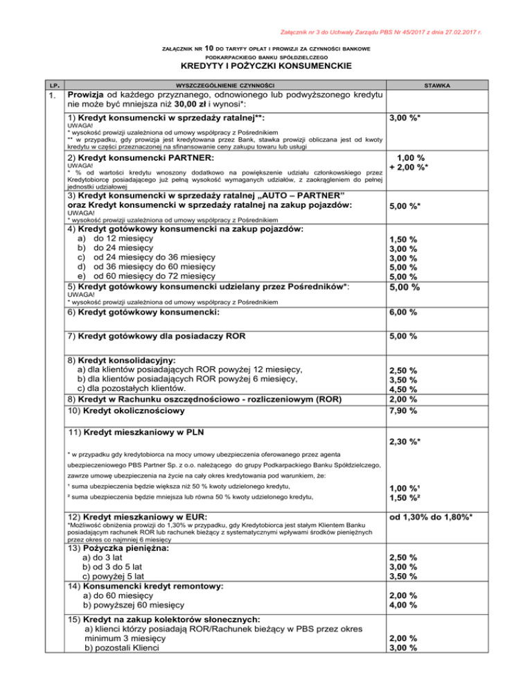 Załącznik nr 3 do Uchwały Zarządu PBS Nr 45/2017 z dnia 27.02.2017 r. ZAŁĄCZNIK NR 10 DO TARYFY OPŁAT I PROWIZJI ZA CZYNNOŚCI BANKOWE PODKARPACKIEGO BANKU SPÓŁDZIELCZEGO KREDYTY I POŻYCZKI KONSUMENCKIE LP. 1. WYSZCZEGÓLNIENIE CZYNNOŚCI STAWKA Prowizja od każdego przyznanego, odnowionego lub podwyższonego kredytu nie może być mniejsza niż 30,00 zł i wynosi*: 1) Kredyt konsumencki w sprzedaży ratalnej**: 3,00 %* UWAGA! * wysokość prowizji uzależniona od umowy współpracy z Pośrednikiem ** w przypadku, gdy prowizja jest kredytowana przez Bank, stawka prowizji obliczana jest od kwoty kredytu w części przeznaczonej na sfinansowanie ceny zakupu towaru lub usługi 2) Kredyt konsumencki PARTNER: UWAGA! * % od wartości kredytu wnoszony dodatkowo na powiększenie udziału członkowskiego przez Kredytobiorcę posiadającego już pełną wysokość wymaganych udziałów, z zaokrągleniem do pełnej jednostki udziałowej 3) Kredyt konsumencki w sprzedaży ratalnej „AUTO – PARTNER” oraz Kredyt konsumencki w sprzedaży ratalnej na zakup pojazdów: UWAGA! * wysokość prowizji uzależniona od umowy współpracy z Pośrednikiem 4) Kredyt gotówkowy konsumencki na zakup pojazdów: a) do 12 miesięcy b) do 24 miesięcy c) od 24 miesięcy do 36 miesięcy d) od 36 miesięcy do 60 miesięcy e) od 60 miesięcy do 72 miesięcy 5) Kredyt gotówkowy konsumencki udzielany przez Pośredników*: UWAGA! * wysokość prowizji uzależniona od umowy współpracy z Pośrednikiem 1,00 % + 2,00 %* 5,00 %* 1,50 % 3,00 % 3,00 % 5,00 % 5,00 % 5,00 % 6) Kredyt gotówkowy konsumencki: 6,00 % 7) Kredyt gotówkowy dla posiadaczy ROR 5,00 % 8) Kredyt konsolidacyjny: a) dla klientów posiadających ROR powyżej 12 miesięcy, b) dla klientów posiadających ROR powyżej 6 miesięcy, c) dla pozostałych klientów. 8) Kredyt w Rachunku oszczędnościowo - rozliczeniowym (ROR) 10) Kredyt okolicznościowy 2,50 % 3,50 % 4,50 % 2,00 % 7,90 % 11) Kredyt mieszkaniowy w PLN 2,30 %* * w przypadku gdy kredytobiorca na mocy umowy ubezpieczenia oferowanego przez agenta ubezpieczeniowego PBS Partner Sp. z o.o. należącego do grupy Podkarpackiego Banku Spółdzielczego, zawrze umowę ubezpieczenia na życie na cały okres kredytowania pod warunkiem, że: ¹ suma ubezpieczenia będzie większa niż 50 % kwoty udzielonego kredytu, ² suma ubezpieczenia będzie mniejsza lub równa 50 % kwoty udzielonego kredytu, 1,00 %¹ 1,50 %² 12) Kredyt mieszkaniowy w EUR: od 1,30% do 1,80%* *Możliwość obniżenia prowizji do 1,30% w przypadku, gdy Kredytobiorca jest stałym Klientem Banku posiadającym rachunek ROR lub rachunek bieżący z systematycznymi wpływami środków pieniężnych przez okres co najmniej 6 miesięcy 13) Pożyczka pieniężna: a) do 3 lat b) od 3 do 5 lat c) powyżej 5 lat 14) Konsumencki kredyt remontowy: a) do 60 miesięcy b) powyższej 60 miesięcy 15) Kredyt na zakup kolektorów słonecznych: a) klienci którzy posiadają ROR/Rachunek bieżący w PBS przez okres minimum 3 miesięcy b) pozostali Klienci 2,50 % 3,00 % 3,50 % 2,00 % 4,00 % 2,00 % 3,00 % Załącznik nr 3 do Uchwały Zarządu PBS Nr 45/2017 z dnia 27.02.2017 r. ZAŁĄCZNIK NR 10 DO TARYFY OPŁAT I PROWIZJI ZA CZYNNOŚCI BANKOWE PODKARPACKIEGO BANKU SPÓŁDZIELCZEGO KREDYTY I POŻYCZKI KONSUMENCKIE 2. 3. 4. 5. 6. 16) Kredyt na zakup i montaż mikroinstalacji odnawialnych źródeł energii a) dla Klientów posiadających na dzień zawarcia umowy rachunek ROR lub rachunek bieżący/pomocniczy w Banku 0,00 % b) dla Klientów nie posiadających na dzień zawarcia umowy rachunku ROR lub rachunku bieżącego/pomocniczego w Banku 3,00 % Debet w Rachunku oszczędnościowo – rozliczeniowym w tym w rachunku 2,00 % NIEBIESKIE KONTO: Opłata przygotowawcza za przyjęcie i rozpatrzenie wniosku bez opłat kredytowego*: * - Opłata jest pobierana w przypadku udzielenia kredytu Opłata przygotowawcza za przyjęcie i rozpatrzenie wniosku kredytowego 50,00 zł dotyczącego kredytu gotówkowego konsumenckiego oraz kredytu gotówkowego dla posiadaczy ROR, okolicznościowego * - Opłata jest pobierana w przypadku udzielenia kredytu Za zmianę warunków umowy kredytowej na wniosek klienta (niezależnie od 30,00 zł innych prowizji)*: Prolongowanie spłaty kredytu lub jego części (rat kapitałowych lub do 1,00 % odsetek) od kwoty prolongowanej*/**: ** opłaty nie pobiera się w przypadku pobrania opłaty o której mowa w pkt 5, a zmiana warunków umowy kredytowej związana jest z ustaleniem karencji w spłacie kredytu gotówkowego Za wystawienie promesy kredytowej od kwoty kredytu zawartej w treści promesy*: 8. Za wysłane upomnienie lub wezwanie do zapłaty zadłużenia, z tytułu kredytu, odsetek lub kosztów: 9. Za sporządzenie dokumentacji fotograficznej dla celów rozliczenia kredytu 10. Za wystawienie zaświadczenia w celu: 1) wykreślenia hipoteki 2) wykreślenia wpisu w dowodzie rejestracyjnym pojazdu 3) wykreślenia zastawu rejestrowego w Sądzie 4) określenia wysokości zadłużenia z tytułu posiadanych kredytów a) w formie wydruku potwierdzającego salda b) w formie wydanego zaświadczenia * dla umów zawieranych od dnia 16 maja 2016 r. 11. Polecenie przelewu na rachunek w innym banku z tytułu wypłaty kredytu 12. Za zmianę waluty kredytu mieszkaniowego na wniosek Kredytobiorcy: 1) pierwsze przewalutowanie 2) drugie i każde kolejne przewalutowanie 7. 0,20 % 10,00 zł 100,00 zł bez opłat bez opłat bez opłat 30,00 zł* 30,00 zł* 30,00 zł* 10,00 zł 30,00 zł 30,00 zł* 50,00 zł* bez opłat bez opłat 0,50% kwoty przewalutowywanej 13. Sporządzenie aneksu do umowy kredytu obejmującego wyłącznie zmianę bez opłat waluty kredytu 14. Sporządzenie aneksu do umowy kredytu obejmującego wyłącznie bez opłat skrócenie okresu kredytowania, lub zmianę wysokości rat kredytu, w związku z częściową spłatą (nadpłatą) kredytu od 10,00 zł 15. Za czynności i usługi nietypowe nie przewidziane w Taryfie: do 300,00 zł UWAGA! *staw