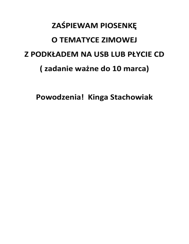 ZAŚPIEWAM PIOSENKĘ O TEMATYCE ZIMOWEJ Z PODKŁADEM NA USB LUB PŁYCIE CD ( zadanie ważne do 10 marca) Powodzenia! Kinga Stachowiak