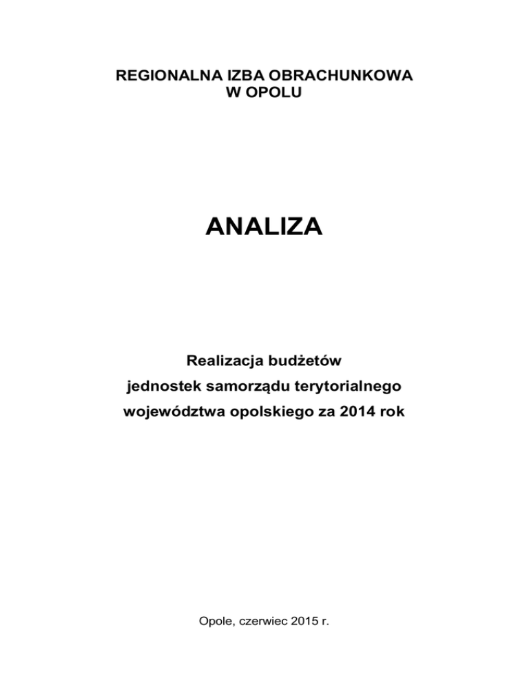 REGIONALNA IZBA OBRACHUNKOWA W OPOLU ANALIZA Realizacja budżetów jednostek samorządu terytorialnego województwa opolskiego za 2014 rok Opole, czerwiec 2015 r. Spis treści 1. ZMIANY PRZEPISÓW PRAWNYCH W 2014 ROKU ............................................................... 3 2. REALIZACJA BUDŻETÓW JEDNOSTEK SAMORZĄDU TERYTORIALNEGO WOJEWÓDZTWA OPOLSKIEGO W 2014 R. ......................................................................... 5 2.1. 2.2. 2.3. 2.4. 2.5. W YKONANIE DOCHODÓW I WYDATKÓW .................................................................................. 5 DYNAMIKA DOCHODÓW I WYDATKÓW ..................................................................................... 7 STRUKTURA DOCHODÓW I WYDATKÓW .................................................................................. 8 DOCHODY I WYDATKI ZE ŚRODKÓW EUROPEJSKICH I ZAGRANICZNYCH ..................................... 9 DOCHODY I WYDATKI W PRZELICZENIU NA JEDNEGO MIESZKAŃCA.......................................... 10 3. WYKONANIE BUDŻETÓW GMIN W 2014 R. ........................................................................ 11 3.1. 3.2. 3.3. 3.4. 3.5. 3.6. W YKONANIE DOCHODÓW I WYDATKÓW BUDŻETOWYCH ......................................................... 11 DYNAMIKA DOCHODÓW I WYDATKÓW BUDŻETOWYCH ........................................................... 13 STRUKTURA DOCHODÓW I WYDATKÓW BUDŻETOWYCH ......................................................... 15 DOCHODY I WYDATKI ZE ŚRODKÓW EUROPEJSKICH I ZAGRANICZNYCH ................................... 20 W YNIK BUDŻETU, FINANSOWANIE DEFICYTU, PRZYCHODY I ROZCHODY .................................. 21 ZOBOWIĄZANIA ZALICZANE DO DŁUGU PUBLICZNEGO ORAZ NALEŻNOŚCI BUDŻETOWE............. 23 4. WYKONANIE BUDŻETU MIASTA NA PRAWACH POWIATU W 2014 R. ............................ 24 4.1. 4.2. 4.3. 4.4. 4.5. 4.6. W YKONANIE DOCHODÓW I WYDATKÓW BUDŻETOWYCH ......................................................... 24 DYNAMIKA DOCHODÓW I WYDATKÓW BUDŻETOWYCH ........................................................... 24 STRUKTURA DOCHODÓW I WYDATKÓW BUDŻETOWYCH ......................................................... 25 DOCHODY I WYDATKI ZE ŚRODKÓW EUROPEJSKICH I ZAGRANICZNYCH ................................... 29 W YNIK BUDŻETU, FINANSOWANIE DEFICYTU, PRZYCHODY I ROZCHODY .................................. 30 ZOBOWIĄZANIA ZALICZANE DO DŁUGU PUBLICZNEGO ORAZ NALEŻNOŚCI BUDŻETOWE............. 31 5. WYKONANIE BUDŻETÓW POWIATÓW W 2014 R. ............................................................. 31 5.1. 5.2. 5.3. 5.4. 5.5. 5.6. W YKONANIE DOCHODÓW I WYDATKÓW BUDŻETOWYCH ......................................................... 31 DYNAMIKA DOCHODÓW I WYDATKÓW BUDŻETOWYCH ........................................................... 32 STRUKTURA DOCHODÓW I WYDATKÓW BUDŻETOWYCH ......................................................... 34 DOCHODY I WYDATKI ZE ŚRODKÓW EUROPEJSKICH I ZAGRANICZNYCH ................................... 38 W YNIK BUDŻETU, FINANSOWANIE DEFICYTU, PRZYCHODY I ROZCHODY .................................. 39 ZOBOWIĄZANIA ZALICZANE DO DŁUGU PUBLICZNEGO ORAZ NALEŻNOŚCI BUDŻETOWE............. 40 6. WYKONANIE BUDŻETU WOJEWÓDZTWA SAMORZĄDOWEGO W 2014 R. .................... 40 6.1. 6.2. 6.3. 6.4. 6.5. 6.6. W YKONANIE DOCHODÓW I WYDATKÓW BUDŻETOWYCH ......................................................... 40 DYNAMIKA DOCHODÓW I WYDATKÓW ................................................................................... 41 STRUKTURA DOCHODÓW I WYDATKÓW BUDŻETOWYCH ......................................................... 42 DOCHODY I WYDATKI ZE ŚRODKÓW EUROPEJSKICH I ZAGRANICZNYCH ................................... 46 W YNIKI BUDŻETÓW , FINANSOWANIE DEFICYTU, PRZYCHODY I ROZCHODY .............................. 46 ZOBOWIĄZANIA ZALICZANE DO DŁUGU PUBLICZNEGO ORAZ NALEŻNOŚCI BUDŻETOWE............. 47 7. SYNTEZA .............................................................................................................................. 48 8. ZAŁĄCZNIKI 1-22 2 1. ZMIANY PRZEPISÓW PRAWNYCH W 2014 ROKU W 2014 roku wprowadzono zmiany w przepisach prawa, mające wpływ na funkcjonowanie jednostek samorządu terytorialnego oraz prowadzenie przez nie gospodarki finansowej. W związku z wprowadzeniem definicji „odbiorcy wrażliwego energii elektrycznej” w ustawie Prawo energetyczne1 od dnia 1 stycznia 2014 r. osobom, które otrzymały dodatek mieszkaniowy przysługuje dodatek energetyczny wypłacany miesięcznie. Dodatek energetyczny przyznaje wójt, burmistrz lub prezydent miasta w drodze decyzji na wniosek odbiorcy wrażliwego energii elektrycznej. Wypłata dodatku energetycznego jest zadaniem z zakresu administracji rządowej realizowanym przez gminy. Minister Środowiska2 określił wysokość dodatku energetycznego dla gospodarstwa domowego według kryterium ilości osób w rodzinie. W ustawie o funduszu sołeckim3 określono na nowo zasady tworzenia funduszu na podstawie uchwały rady gminy, możliwości zmiany przedsięwzięć w trakcie roku budżetowego, ich wspólnej realizacji przez sołectwa oraz zasady zwrotu części wydatków wykonanych w ramach funduszu. Znowelizowana ustawa o wypłacie zasiłków dla opiekunów4 przywróciła prawo do zasiłków dla opiekunów tym osobom, które utraciły prawo do świadczenia pielęgnacyjnego z dniem 1 lipca 2013 r. Wypłata zaległych zasiłków dla opiekunów jest zadaniem zleconym z zakresu administracji rządowej realizowanym przez gminy. Zmiany w ustawie o wspieraniu rodziny i systemie pieczy zastępczej5 miały na celu poprawę funkcjonowania rozwiązań systemowych oraz przyczynienie się do lepszego jakościowego wsparcia rodzin i poprawy opieki nad dziećmi umieszczonymi w pieczy zastępczej. Wprowadzono między innymi zmiany finansowania pobytu dzieci w zakładach opiekuńczo–wychowawczych i opiekuńc