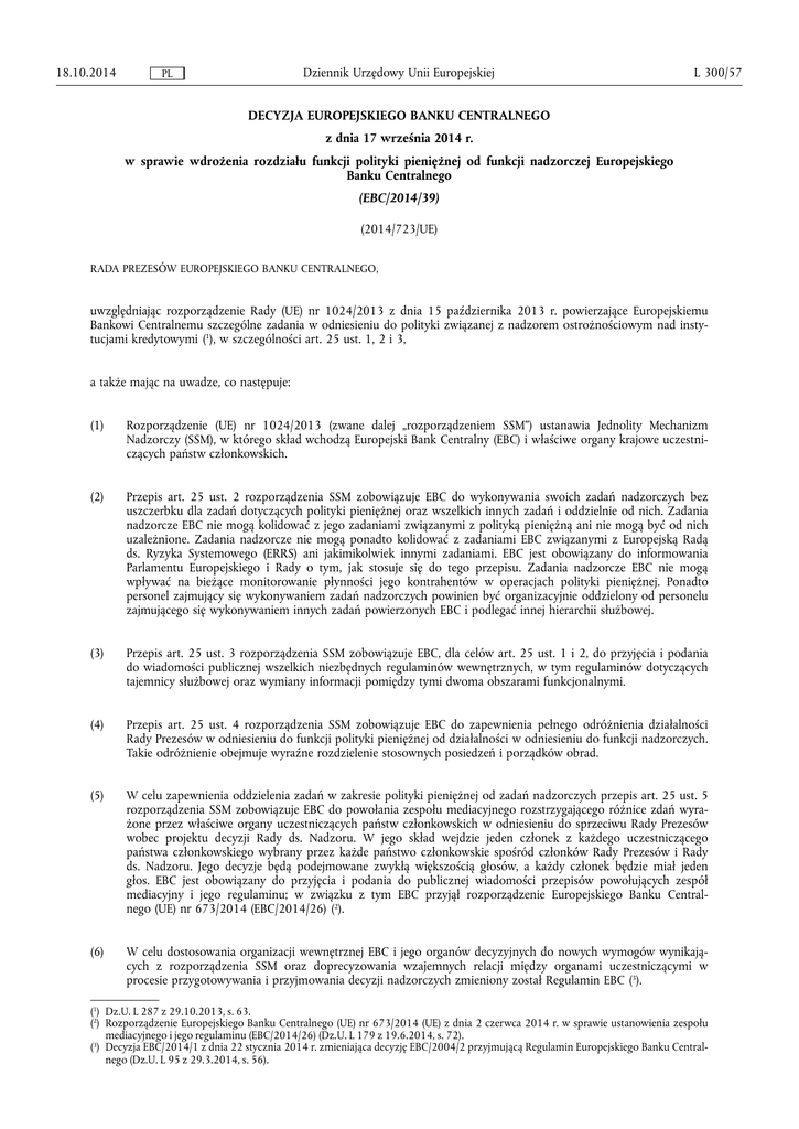 18.10.2014 Dziennik Urzędowy Unii Europejskiej PL L 300/57 DECYZJA EUROPEJSKIEGO BANKU CENTRALNEGO z dnia 17 września 2014 r. w sprawie wdrożenia rozdziału funkcji polityki pieniężnej od funkcji nadzorczej Europejskiego Banku Centralnego (EBC/2014/39) (2014/723/UE) RADA PREZESÓW EUROPEJSKIEGO BANKU CENTRALNEGO, uwzględniając rozporządzenie Rady (UE) nr 1024/2013 z dnia 15 października 2013 r. powierzające Europejskiemu Bankowi Centralnemu szczególne zadania w odniesieniu do polityki związanej z nadzorem ostrożnościowym nad insty tucjami kredytowymi (1), w szczególności art. 25 ust. 1, 2 i 3, a także mając na uwadze, co następuje: (1) Rozporządzenie (UE) nr 1024/2013 (zwane dalej „rozporządzeniem SSM”) ustanawia Jednolity Mechanizm Nadzorczy (SSM), w którego skład wchodzą Europejski Bank Centralny (EBC) i właściwe organy krajowe uczestni czących państw członkowskich. (2) Przepis art. 25 ust. 2 rozporządzenia SSM zobowiązuje EBC do wykonywania swoich zadań nadzorczych bez uszczerbku dla zadań dotyczących polityki pieniężnej oraz wszelkich innych zadań i oddzielnie od nich. Zadania nadzorcze EBC nie mogą kolidować z jego zadaniami związanymi z polityką pieniężną ani nie mogą być od nich uzależnione. Zadania nadzorcze nie mogą ponadto kolidować z zadaniami EBC związanymi z Europejską Radą ds. Ryzyka Systemowego (ERRS) ani jakimikolwiek innymi zadaniami. EBC jest obowiązany do informowania Parlamentu Europejskiego i Rady o tym, jak stosuje się do tego przepisu. Zadania nadzorcze EBC nie mogą wpływać na bieżące monitorowanie płynności jego kontrahentów w operacjach polityki pieniężnej. Ponadto personel zajmujący się wykonywaniem zadań nadzorczych powinien być organizacyjnie oddzielony od personelu zajmującego się wykonywaniem innych zadań powierzonych EBC i podlegać innej hierarchii służbowej. (3) Przepis art. 25 ust. 3 rozporządzenia SSM zobowiązuje EBC, dla celów art. 25 ust. 1 i 2, do przyjęcia i podania do wiadomości publicznej wszelkich niezbędnych regulaminów wewnętrznych, w tym regulaminów dotyczących tajemnicy służbowej oraz wymiany informacji pomiędzy tymi dwoma obszarami funkcjonalnymi. (4) Przepis art. 25 ust. 4 rozporządzenia SSM zobowiązuje EBC do zapewnienia pełnego odróżnienia działalności Rady Prezesów w odniesieniu do funkcji polityki pieniężnej od działalności w odniesieniu do funkcji nadzorczych. Takie odróżnienie obejmuje wyraźne rozdzielenie stosownych posiedzeń i porządków obrad. (5) W celu zapewnienia oddzielenia zadań w zakresie polityki pieniężnej od zadań nadzorczych przepis art. 25 ust. 5 rozporządzenia SSM zobowiązuje EBC do powołania zespołu mediacyjnego rozstrzygającego różnice zdań wyra żone przez właściwe organy uczestniczących państw członkowskich w odniesieniu do sprzeciwu Rady Prezesów wobec projektu decyzji Rady ds. Nadzoru. W jego skład wejdzie jeden członek z każdego uczestniczącego państwa członkowskiego wybrany przez każde państwo członkowskie spośród członków Rady Prezesów i Rady ds. Nadzoru. Jego decyzje będą podejmowane zwykłą większością głosów, a każdy członek będzie miał jeden głos. EBC jest obowiązany do przyjęcia i podania do publicznej wiadomości przepisów powołujących zespół mediacyjny i jego regulaminu; w związku z tym EBC przyjął rozporządzenie Europejskiego Banku Central nego (UE) nr 673/2014 (EBC/2014/26) (2). (6) W celu dostosowania organizacji wewnętrznej EBC i jego organów decyzyjnych do nowych wymogów wynikają cych z rozporządzenia SSM oraz doprecyzowania wzajemnych relacji między organami uczestniczącymi w procesie przygotowywania i przyjmowania decyzji nadzorczych zmieniony został Regulamin EBC (3). (1) Dz.U. L 287 z 29.10.2013, s. 63. (2) Rozporządzenie Europejskiego Banku Centralnego (UE) nr 673/2014 (UE) z dnia 2 czerwca 2014 r. w sprawie ustanowienia zespołu mediacyjnego i jego regulaminu (EBC/2014/26) (Dz.U. L 179 z 19.6.2014, s. 72). (3) Decyzja EBC/2014/1 z dnia 22 stycznia 2014 r. zmieniająca decyzję EBC/2004/2 przyjmującą Regulamin Europejskiego Banku Central nego (Dz.U. L 95 z 29.3.2014, s. 56). L 300/58 PL Dziennik Urzędowy Unii Europejskiej 18.10.2014 (7) Przepisy art. 13g–13j Regulaminu EBC szczegółowo regulują przyjmowanie przez Radę Prezesów decyzji dotyczą cych kwestii związanych z rozporządzeniem SSM. W szczególności art. 13g dotyczy przyjmowania decyzji dla celów wykonywania zadań, o których mowa w art. 4 rozporządzenia SSM, a art. 13h dotyczy przyjmowania decyzji dla celów wykonywania zadań, o których mowa w art. 5 rozporządzenia SSM, wdrażając wymogi okreś lone w art. 26 ust. 8 rozporządzenia SSM. (8) Przepis art. 13k Regulaminu EBC przewiduje, że EBC musi wykonywać zadania nadzorcze bez uszczerbku dla swoich zadań dotyczących polityki pieniężnej oraz wszelkich innych zadań, i oddzielnie od nich. W związku z tym EBC jest zobowiązany do podjęcia wszelkich odpowiednich kroków celem zapewnienia rozdziału funkcji polityki pieniężnej od funkcji nadzorczej. Rozdział funkcji polityki pieniężnej od funkcji nadzorczej nie wyklucza przy tym wymiany pomiędzy tymi dwoma obszarami funkcjonalnymi informacji niezbędnych do realizacji zadań EBC i Europejskiego Systemu Banków Centralnych (ESBC). (9) Przepis art. 13l Regulaminu EBC przewiduje, że posiedzenia Rady Prezesów dotyczące zadań nadzorczych muszą się odbywać oddzielnie od zwykłych posiedzeń Rady Prezesów i mieć odrębny porządek obrad. (10) Zgodnie z art. 13m Regulaminu EBC dotyczącym wewnętrznej struktury EBC dla zadań nadzorczych kompe tencje Zarządu w odniesieniu do struktury wewnętrznej EBC i pracowników EBC obejmują zadania nadzorcze. W odniesieniu do takiej struktury wewnętrznej Zarząd ma zasięgać opinii przewodniczącego i wiceprzewodniczą cego Rady ds. Nadzoru. Rada ds. Nadzoru, w porozumieniu z Zarządem, może usta