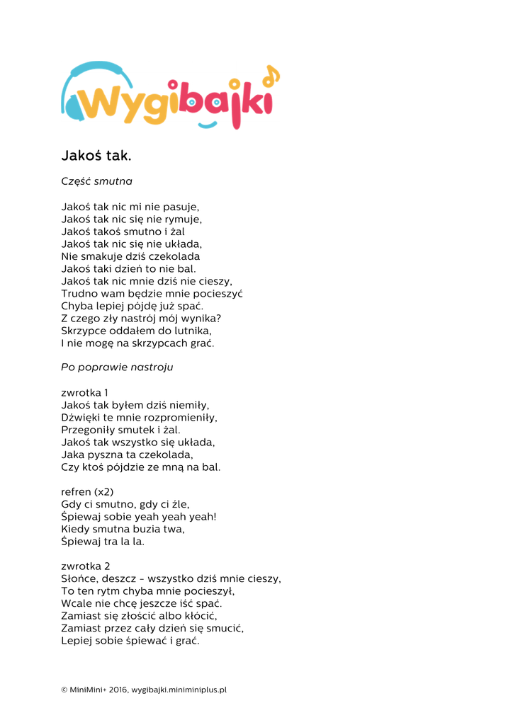 Jakoś tak. Część smutna Jakoś tak nic mi nie pasuje, Jakoś tak nic się nie rymuje, Jakoś takoś smutno i żal Jakoś tak nic się nie układa, Nie smakuje dziś czekolada Jakoś taki dzień to nie bal. Jakoś tak nic mnie dziś nie cieszy, Trudno wam będzie mnie pocieszyć Chyba lepiej pójdę już spać. Z czego zły nastrój mój wynika? Skrzypce oddałem do lutnika, I nie mogę na skrzypcach grać. Po poprawie nastroju zwrotka 1 Jakoś tak byłem dziś niemiły, Dźwięki te mnie rozpromieniły, Przegoniły smutek i żal. Jakoś tak wszystko się układa, Jaka pyszna ta czekolada, Czy ktoś pójdzie ze mną na bal. refren (x2) Gdy ci smutno, gdy ci źle, Śpiewaj sobie yeah yeah yeah! Kiedy smutna buzia twa, Śpiewaj tra la la. zwrotka 2 Słońce, deszcz - wszystko dziś mnie cieszy, To ten rytm chyba mnie pocieszył, Wcale nie chcę jeszcze iść spać. Zamiast się złościć albo kłócić, Zamiast przez cały dzień się smucić, Lepiej sobie śpiewać i grać. © MiniMini+ 2016, wygibajki.miniminiplus.pl refren (x2) Gdy ci smutno, gdy ci źle, Śpiewaj sobie yeah yeah yeah! Kiedy smutna buzia twa, Śpiewaj tra la la. © MiniMini+ 2016, wygibajki.miniminiplus.pl