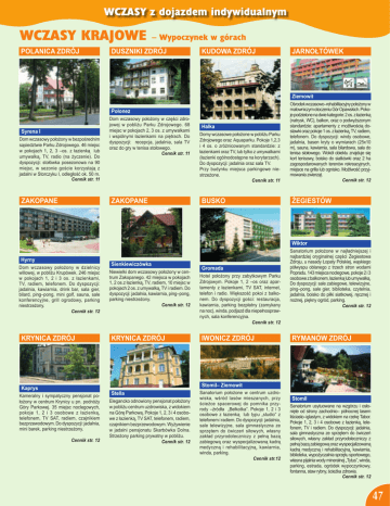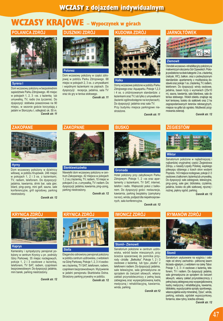 WCZASY z dojazdem indywidualnym WCZASY KRAJOWE – Wypoczynek w górach POLANICA ZDRÓJ DUSZNIKI ZDRÓJ KUDOWA ZDRÓJ JARNOŁTÓWEK Ziemowit Polonez Syrena I Dom wczasowy położony w bezpośrednim sąsiedztwie Parku Zdrojowego. 46 miejsc w pokojach 1, 2, 3 –os. z łazienką lub umywalką, TV, radio (na życzenie). Do dyspozycji: stołówka posezonowa na 90 miejsc, w sezonie goście korzystają z jadalni w Storczyku I, odległość ok. 50 m. Cennik str. 11 ZAKOPANE Dom wczasowy położony w części zdrojowej w pobliżu Parku Zdrojowego. 68 miejsc w pokojach 2, 3 os. z umywalkami i wspólnymi łazienkami na piętrach. Do dyspozycji: recepcja, jadalnia, sala TV oraz do gry w tenisa stołowego. Cennik str. 11 ZAKOPANE Halka Domy wczasowe położone w pobliżu Parku Zdrojowego oraz Aquaparku. Pokoje 1,2,3 i 4 os. o zróżnicowanym standardzie: z łazienkami oraz TV, lub tylko z umywalkami (łazienki ogólnodostępne na korytarzach). Do dyspozycji: jadalnia oraz sala TV. Przy budynku miejsca parkingowe niestrzeżone. Cennik str. 11 BUSKO Ośrodek wczasowo–rehabilitacyjny położony w malowniczym otoczeniu Gór Opawskich. Pokoje podzielone na dwie kategorie: 2 os. z łazienką (natrysk, WC), balkon, oraz o podwyższonym standardzie: apartamenty z możliwością dostawki oraz pokoje 1 os. z łazienką, TV, radiem, telefonem. Do dyspozycji: windy osobowe, jadalnia, basen kryty o wymiarach (25x10 m), sauna, kawiarnia, sala bilardowa, sala do tenisa stołowego. Wokół obiektu znajduje się kort tenisowy, boisko do siatkówki oraz 2 ha zagospodarowanych terenów rekreacyjnych, miejsce na grilla lub ognisko. Możliwość przyjmowania zwierząt. Cennik str. 12 ŻEGIESTÓW Wiktor Hyrny Dom wczasowy położony w dzielnicy willowej, w pobliżu Krupówek. 246 miejsc w pokojach 1, 2 i 3 os. z łazienkami, TV, radiem, telefonem. Do dyspozycji: jadalnia, kawiarnia, drink bar, sala gier, bilard, ping–pong, mini golf, sauna, sale konferencyjne, grill ogrodowy, parking niestrzeżony. Cennik str. 12 KRYNICA ZDRÓJ Sienkiewiczówka Niewielki dom wczasowy położony w centrum Zakopanego. 42 miejsca w pokojach 1, 2 os.z łazienką, TV, radiem, 10 miejsc w pokojach 2 os. z umywalką, TV i radiem. Do dyspozycji: jadalnia, kawiarnia, ping–pong, parking niestrzeżony. Cennik str. 12 KRYNICA ZDRÓJ Gromada Hotel położony przy zabytkowym Parku Zdrojowym. Pokoje 1, 2 –os oraz apartamenty z łazienkami, TV SAT, internet, telefon i radio. Większość pokoi z balkonem. Do dyspozycji gości: restauracja, kawiarnia, parking bezpłatny (zamykany na noc), winda, podjazd dla niepełnosprawnych, sala konferencyjna. Cennik str. 12 IWONICZ ZDRÓJ Sanatorium położone w najładniejszej i najbardziej oryginalnej części Żegiestowa Zdroju, u nasady Łopaty Polskiej, wąskiego półwyspu oblanego z trzech stron wodami Popradu. 143 miejsca noclegowe, pokoje 2 i 3 osobowe z balkonem, łazienką lub umywalką. Do dyspozycji: sale zabiegowe, telewizyjne, ping–pong, sale gier, biblioteka, czytelnia, jadalnia, boisko do piłki siatkowej, ręcznej i nożnej, piękny ogród, parking. Cennik str. 12 RYMANÓW ZDRÓJ Stomil– Ziemowit Kaprys Kameralny i sympatyczny pensjonat położony w centrum Krynicy u pn. podnóży Góry Parkowej. 35 miejsc noclegowych, pokoje 1, 2 i 3 osobowe z łazienką, telefonem, TV SAT, radiem, czajnikiem bezprzewodowym. Do dyspozycji: jadalnia, mini barek, parking niestrzeżony. Cennik str. 12 Stella Elegancko odnowiony pensjonat położony w pobliżu centrum uzdrowiska, z widokiem na Górę Parkową. Pokoje 1, 2, 3 i 4 osobowe z łazienką, TV SAT, telefonem, radiem, czajnikiem bezprzewodowym. Wyżywienie w jadalni pensjonatu Skarbówka Dolna. Strzeżony parking prywatny w pobliżu. Cennik str. 12 Sanatorium położone w centrum uzdrowiska, wśród lasów mieszanych, przy ścieżce spacerowej do pomnika przyrody –źródła „Bełkotka”. Pokoje 1, 2 i 3 osobowe z łazienką lub typu „studio” z telefonem i radiem. Do dyspozycji: jadalnia, sale telewizyjne, sala gimnastyczna ze sprzętem do ćwiczeń siłowych, własny zakład przyrodoleczniczy z pełną bazą zabiegową oraz wyspecjalizowaną kadrą medyczną i rehabilitacyjną, kawiarnia, winda, parking. Cennik str.12 Stomil Sanatorium usytuowane na wzgórzu i osłonięte od strony zachodnio– północnej lasem liściasto–iglastym, z widokiem na rzekę Tabor. Pokoje 1, 2, 3 i 4 osobowe z łazienką, telefonem, TV i radiem. Do dyspozycji: jadalnia, sala gimnastyczna ze sprzętem do ćwiczeń siłowych, własny zakład przyrodoleczniczy z pełną bazą zabiegową oraz wyspecjalizowaną kadrą medyczną i rehabilitacyjną, kawiarnia, biblioteka, wypożyczalnia sprzętu sportowego, własna pijalnia wody mineralnej „Tytus”, winda, parking, estrada, ogródek wypoczynkowy, fontanna, staw rybny, ścieżka zdrowia. Cennik str. 12 47