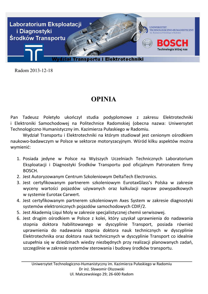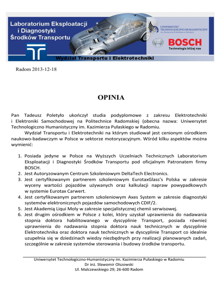 Radom 2013-12-18 OPINIA Pan Tadeusz Poletyło ukończył studia podyplomowe z zakresu Elektrotechniki i Elektroniki Samochodowej na Politechnice Radomskiej (obecna nazwa: Uniwersytet Technologiczno Humanistyczny im. Kazimierza Pułaskiego w Radomiu. Wydział Transportu i Elektrotechniki na którym studiował jest cenionym ośrodkiem naukowo-badawczym w Polsce w sektorze motoryzacyjnym. Wśród kilku aspektów można wymienić: 1. Posiada jedyne w Polsce na Wyższych Uczelniach Technicznych Laboratorium Eksploatacji i Diagnostyki Środków Transportu pod oficjalnym Patronatem firmy BOSCH. 2. Jest Autoryzowanym Centrum Szkoleniowym DeltaTech Electronics. 3. Jest certyfikowanym partnerem szkoleniowym EurotaxGlass’s Polska w zakresie wyceny wartości pojazdów używanych oraz kalkulacji napraw powypadkowych w systemie Eurotax Carwert. 4. Jest certyfikowanym partnerem szkoleniowym Axes System w zakresie diagnostyki systemów elektronicznych pojazdów samochodowych CDIF/2. 5. Jest Akademią Liqui Moly w zakresie specjalistycznej chemii serwisowej. 6. Jest drugim ośrodkiem w Polsce z kolei, który uzyskał uprawnienia do nadawania stopnia doktora habilitowanego w dyscyplinie Transport, posiada również uprawnienia do nadawania stopnia doktora nauk technicznych w dyscyplinie Elektrotechnika oraz doktora nauk technicznych w dyscyplinie Transport co idealnie uzupełnia się w dziedzinach wiedzy niezbędnych przy realizacji planowanych zadań, szczególnie w zakresie systemów sterowania i budowy środków transportu. Uniwersytet Technologiczno-Humanistyczny im. Kazimierza Pułaskiego w Radomiu Dr inż. Sławomir Olszowski Ul. Malczewskiego 29; 26-600 Radom 7. Wydział pozyskuje specjalistyczne informacje serwisowe od cenionych dostawców technologii dla sektora motoryzacyjnego m. in: ATE, AXES SYSTEM, BOSCH, DELPHI, DeltaTech Electronics, DENSO, FEBI, GATES, Liqui Moly, Loctite, Magneti Marelli, Ravenol, Teroson. 8. Współpracuje z sieciami serwisowymi: Auto Crew, AD SERWIS, AD KAROSERIA, Auto Primo, Lider Serwis, Bosch Car Service, Bosch Diesel Centrum, Service Center Delphi, OK. Serwis, Magneti Marelli, CheckStar Service Network, Land Serwis, Perfect Serwis, Euro Warsztat, Wydział wykonuje mnóstwo ekspertyz dla Sądów Powszechnych i Prokuratur z terenu całego kraju w zakresie techniki i elektroniki samochodowej oraz dynamiki ruchu pojazdów. Informuję, że miałem przyjemność być promotorem pracy Pana Tadeusza Poletyło, nt.: „ Wtryskiwacz CR (Common Rail) elektromagnetyczny Bosch (budowa, działanie, diagnostyka, naprawa)”, którą obronił z wynikiem bardzo dobrym. Jako kierownik jedynego w Polsce specjalistycznego laboratorium diagnostycznego w zakresie techniki i elektroniki samochodowej pod oficjalnym patronatem firmy Bosch oraz jako Wiceprezes Koła Certyfikacji Rzeczoznawców Samochodowych SITK Rzeczpospolitej Polskiej o/Radom, mogę oświadczyć, że Pan Tadeusz Poletyło jest osobą rzetelną, solidną, niezwykle dokładną i kompetentną w zakresie techniki i elektroniki samochodowej. Obszarem o najwyższym stopniu wtajemniczenia eksperckiego jest technologia bezpośredniego wtrysku oleju napędowego w silnikach z systemami Common Rail. Dotyczy to zarówno budowy i konstrukcji tych silników jak również elektronicznych parametrów sterowania. Z satysfakcją i przyjemnością mogę polecić Pana Tadeusza Poletyło, jako osobę o wyjątkowych kompetencjach zawodowych, o ogromnym doświadczeniu praktycznym i umiejętnościach właściwego wnioskowania. Jestem pewien, że jego umiejętności pozwolą na kompetentne wsparcie przy analizach w procesach o „błędy w sztuce” podczas napraw serwisowych oraz w przypadku nadzwyczajnych awarii silników pojazdów, maszyn specjalnych i urządzeń, w których jednostką napędową jest silnik spalinowy. Pan Tadeusz Poletyło, cały czas się dokształca, dalej utrzymuje czynny kontakt z Uczelnią, a szczególnie z Kołem Techniki i Elektroniki Samochodowej, którego jestem opiekunem. Jest autorem wielu opracowań przy rozkodowywaniu błędów systemowych w sieciach transmisji danych, w tym niekonwencjonalnych błędów międzysystemowych. Chciałbym dodać, że osobiście namówiłem Pana Tadeusz Poletyło, aby aplikował do pracy jako biegły sądowy. Takich ludzi w gronie biegłych bardzo potrzeba. Wielokrotnie miałem styczność z osobami, które wypowiadały się jako „biegli”, w nowych technologiach, zaś ich kompetencje dotyczyły historii motoryzacji. Nie wiedzieli o czym mówią. Postęp zaś jest tak duży, że nie wystarczy kiedyś ukończyć studia, trzeba poszerzać swoje umiejętności na bieżąco, w trybie ciągłym. Pan Tadeusz Poletyło jest osobą, która z powodzeniem może wypowiadać się jako ekspert w nowych technologiach stosowanych w pojazdach samochodowych. Dr inż. Sławomir Olszowski 1. Członek Kapituły Konkursowej „sprzęt i wyposażenie warsztatu” czasopisma „autoExpert” na produkt roku 2012 i 2013 2. Prezes Koła Elektroniki i Diagnostyki Samochodowej SITK RP Oddział w Radomiu 3. Wiceprezes Koła Certyfikacji Rzeczoznawcóa. Samochodowych SITK Rzeczpospolitej Polskiej o/Radom 4. Członek Krajowej Sekcji Bezpieczeństwa Ruchu Drogowego SITK RP 5. EurotaxGlass’s ETG/AM/011/2009 6. Expert KKEB nr 0440/1326 7. Upr. D. nr WR/D/0052, cdef 8. DEKRA Nr Certyfikatu DZJP/SKP/003/04 9. Doktor Nauk Technicznych w dyscyplinie: budowa i eksploatacja maszyn 10. Rzeczoznawca SITK Rzeczpospolitej Polskiej nr 880/07 w specjalnościach: 1. Eksploatacja, naprawa oraz ocena stanu technicznego taboru i sprzętu komunikacyjnego – pojazdy samochodowe, 2. Obiekty zaplecza technicznego transportu – pojazdów samochodowych 11.Licencja V-SIM 12.Licencja Autodata CD 13.Licencja EurotaxGlass’s Carwert 14.Licencja BOSCH ESI [tronic] w zakresie: C9, D, E, CS, P, M + S + K CS K3 15.Licencja BOSCH TRUCK 16.Licencja Magneti Marelli CAR 17.Licencja Magneti Marelli TRUCK 18.Licencja Magneti Marelli BIKE 19.Li