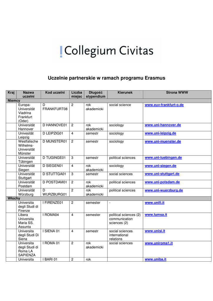 Uczelnie partnerskie w ramach programu Erasmus Kraj Nazwa uczelni Niemcy EuropaUniversität Viadrina Frankfurt (Oder) Universität Hannover Univesität Leipzig Westfalische WilhelmsUniversität Münster Universität Tübingen Universität Siegen Universität Stuttgart Universität Postdam Universität Würzburg Włochy Universita degli Studi di Firenze Libera Universita Maria SS. Assunta Universita degli Studi Di Siena Universita degli Studi di Roma LA SAPIENZA Universita Kod uczelni Liczba miejsc Długość stypendium Kierunek Strona WWW D FRANKFURT08 2 rok akademicki social science www.euv-frankfurt-o.de D HANNOVE01 2 sociology www.uni-hannover.de D LEIPZIG01 4 rok akademicki semestr sociology www.uni-leipzig.de D MUNSTER01 2 semestr sociology www.uni-muenster.de D TUGINGE01 3 semestr political sciences www.uni-tuebingen.de D SIEGEN01 4 sociology www.uni-siegen.de D STUTTGA01 3 rok akademicki semestr social sciences www.uni-stuttgart.de D POSTDAM01 2 political sciences www.uni-potsdam.de D WURZBURG01 2 rok akademicki rok akademicki political sciences www.uni-wuerzburg.de I FIRENZE01 2 semester - www.unifi.it I ROMA04 4 semester political sciences (2) communication sciences (2) www.lumsa.it I SIENA 01 4 semestr www.unisi.it I ROMA 01 2 rok akademicki social sciences international relations social sciences I BARI 01 2 rok www.uniroma1.it www.uniba.it degli Studi di Bari Francja Institut d'Etudes Politiques de Paris Université R. Schuman Strasbourg Institute of Political Studies in Lille Wielka Brytania Kingston University London Norwegia University of Bergen Volda University College Finnmark University College Szwecja University of Uppsala * Estonia Tallinn University of Technology University of Tartu Hiszpania Universitat Autònoma de Barcelona Universitdad Publica de Navarra Universidad Complutense de Madrid Universidad San Jorge Czechy Masaryk University akademicki F PARIS014 6 semester social sciences www.sciences-po.fr F STRASBO48 1 rok akademicki social sciences www.www-urs.u-strasbg.fr F LILLE02 2 rok akademicki political sciences www.iep.univ-lille2.fr UK KINGSTO01 3 rok akademicki social sciences www.kingston.ac.uk N BERGEN01 3 social sciences www.uib.no N VOLDA01 5 rok akademicki semestr www.hivolda.no N ALTA01 4 semestr journalism/social science/international relations business studies SE UPPSAL01 1 rok akademicki political sciences www.info.uu.se EE TALLINN04 2 semestr social sciences political sciences international relations www.ttu.ee EE TARTU02 4 semestr social sciences www.ut.ee E BARCEL02 4 semestr www.uab.es E PAMPLON02 2 rok akademicki law (2) economics and business (2) sociology E MADRID03 2 rok akademicki www.ucm.es E ZAGAROZ07 2 semestr ciencias de la comunicación y de la información (1) relaciones públicas, publicidad (1) communication CZ BRNO05 1 rok akademicki social sciences www.muni.cz www.hifm.no www.unavarra.es www.usj.es CEVRO Institute Jan Amos Komensky University Prague Węgry Eszterházy Károly College Budapest Business School CZ PRAHA30 3 rok akademicki political science and international relations public administration www.cevroinstitut.cz CZ PRAHA21 2 rok akademicki HU EGER01 2 rok akademicki social sciences www.ektf.hu HU BUDAPE20 2 rok akademicki social sciences www.bgf.hu LT VILNIUS01 2 semestr social sciences and communication www.vu.lt IRL LIMERICK01 4 rok akademicki social sciences www.ul.ie B GENT01 3 rok akademicki communication and Information science (2), political science (1) www.ugent.be NL AMSTERD01 2 semestr social sciences www.uva.nl NL WAGENIN01 2 rok akademicki social science www.wur.nl TR ANKARA07 2 social sciences www.bilkent.edu.tr TR KARABUK01 TR BURSA01 2 TR ISTANBU12 3 semestr international relations international relations social sciences www.karabuk.edu.tr 2 rok akademicki rok akademicki semestr TR ISTNBU15 4 semestr social sciences www.halic.edu.tr TR ISTANBU41 3 semestr political science www.iszu.edu.tr DK ODENSE01 2 rok akademicki political science and civic www.sdu.dk www.ujak.cz Litwa Vilnius University Irlandia Limerick University Belgia Universiteit Gent Holandia Universiteit van Amsterdam Wageningen University Turcja Bilkent Üniversitesi Karabük Üniversitesi Uludağ Üniversitesi Doğuş Üniversitesi Haliç Üniversitesi İstanbul Sabahattin Zaim Üniversitesi Dania University of Southern Denmark www.uludag.edu.tr www.dogus.edu.tr Malta University of Malta Grecja University of Crete Portugalia Universidade do Porto Universidade Nova de Lisboa Szwajcaria Universität Luzern Szkocja University of Stirling MT MALTA01 1 rok akademicki international relations www.um.edu.mt G KRITIS01 2 semestr international relations www.uoc.gr P PORTO02 2 political science www.sigarra.up.pt P LISBOA03 1 rok akademicki semestr political science www.unl.pt CH LUZERN01 2 rok akademicki political science www.unilu.ch UK STIRLIN01 4 semestr political science www.stir.ac.uk *umowa ma charakter ekwiwalentny, tzn. studenci z CC mogą wyjechać na studia w przypadku jeśli studenci z uczelni partnerskiej zdecydują się na przyjazd do CC. Uczelnie partnerskie poza Erasmusem Kanada Ottawa University 4 semestr www.uottawa.ca Kazachstan Institute of Management, Economics and Strategic Research The Pavlodar State University after S. Toraighyrov 2 semestr www.kimep.kz 4 semestr www.psu.kz American University of Central Asia 2 semestr www.auca.kg Graduate School of International Studies, Sogang University 2 semestr www.sogang.ac.kr Soochow University 4 semestr www.scu.edu.tw Scranton University 2 semestr www.scranton.edu West Virginia University 4 semestr www.wvu.edu Angelo State University 4 semestr www.angelo.edu Kazachstan Kirgistan Korea Tajwan USA Ukraina Ivan Franko National University of Lviv 2 semestr www.lnu.edu.ua Arab International University 4 semestr www.aiu.edu.sy American University of Science & Technology 2 semestr/ rok www.aust.edu.lb Caucasus University 2 semestr www.cu.edu.ge Universidad De Monterrey (UDEM) 6 rok akademicki ww