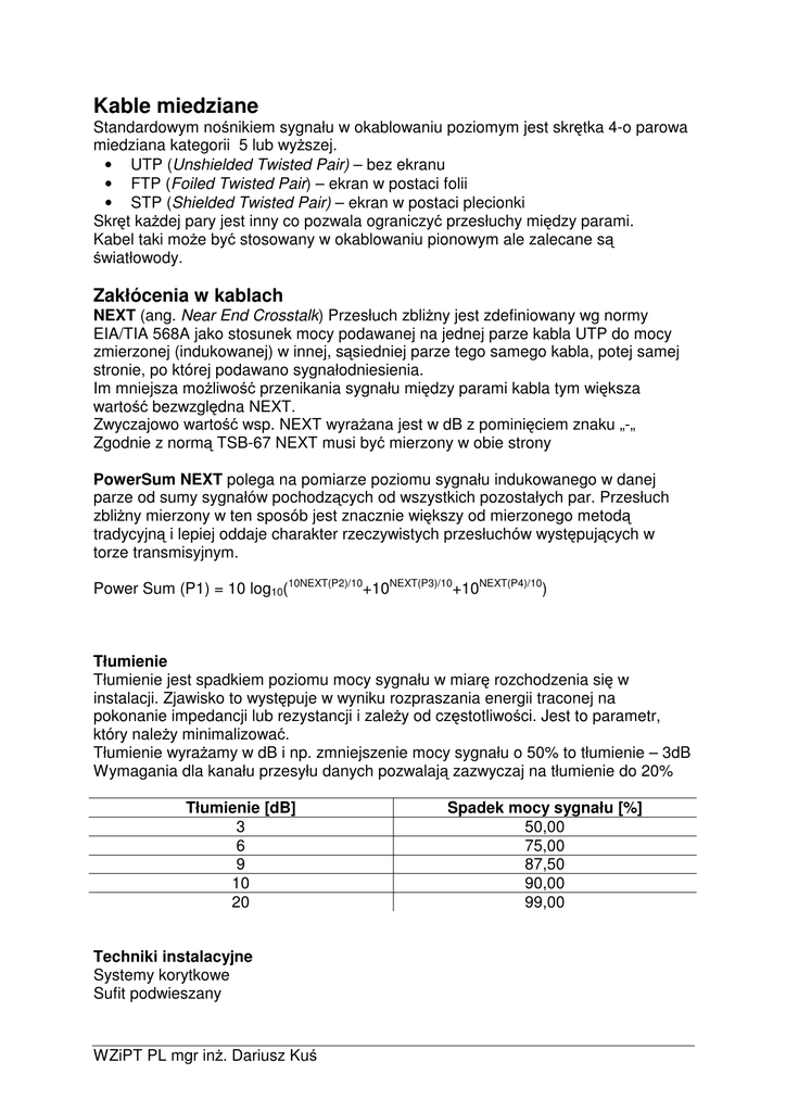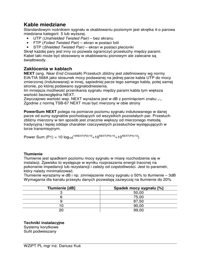 Kable miedziane Standardowym no nikiem sygnału w okablowaniu poziomym jest skr tka 4-o parowa miedziana kategorii 5 lub wy szej. • UTP (Unshielded Twisted Pair) – bez ekranu • FTP (Foiled Twisted Pair) – ekran w postaci folii • STP (Shielded Twisted Pair) – ekran w postaci plecionki Skr t ka dej pary jest inny co pozwala ograniczy przesłuchy mi dzy parami. Kabel taki mo e by stosowany w okablowaniu pionowym ale zalecane s wiatłowody. Zakłócenia w kablach NEXT (ang. Near End Crosstalk) Przesłuch zbli ny jest zdefiniowany wg normy EIA/TIA 568A jako stosunek mocy podawanej na jednej parze kabla UTP do mocy zmierzonej (indukowanej) w innej, s siedniej parze tego samego kabla, potej samej stronie, po której podawano sygnałodniesienia. Im mniejsza mo liwo przenikania sygnału mi dzy parami kabla tym wi ksza warto bezwzgl dna NEXT. Zwyczajowo warto wsp. NEXT wyra ana jest w dB z pomini ciem znaku „-„ Zgodnie z norm TSB-67 NEXT musi by mierzony w obie strony PowerSum NEXT polega na pomiarze poziomu sygnału indukowanego w danej parze od sumy sygnałów pochodz cych od wszystkich pozostałych par. Przesłuch zbli ny mierzony w ten sposób jest znacznie wi kszy od mierzonego metod tradycyjn i lepiej oddaje charakter rzeczywistych przesłuchów wyst puj cych w torze transmisyjnym. Power Sum (P1) = 10 log10(10NEXT(P2)/10+10NEXT(P3)/10+10NEXT(P4)/10) Tłumienie Tłumienie jest spadkiem poziomu mocy sygnału w miar rozchodzenia si w instalacji. Zjawisko to wyst puje w wyniku rozpraszania energii traconej na pokonanie impedancji lub rezystancji i zale y od cz stotliwo ci. Jest to parametr, który nale y minimalizowa . Tłumienie wyra amy w dB i np. zmniejszenie mocy sygnału o 50% to tłumienie – 3dB Wymagania dla kanału przesyłu danych pozwalaj zazwyczaj na tłumienie do 20% Tłumienie [dB] 3 6 9 10 20 Techniki instalacyjne Systemy korytkowe Sufit podwieszany WZiPT PL mgr in . Dariusz Ku Spadek mocy sygnału [%] 50,00 75,00 87,50 90,00 99,00 Zakłócenia Podział ze wzgl du na ródło • Wewn trzne – powstaj w samym kanale transmisyjnym wskutek szumów cieplnych w rezystorach i półprzewodnikach oraz w miejscach styków w przypadku zastosowania niewła ciwych technologii lub niestarannego monta u • Zewn trzne – to zakłócenia elektromagnetyczne (EMI) oraz radiowe (RFI) Pasma cz stotliwo ci zakłóce zewn trznych fmin fmax 150kHz Nazwa 0 nisko cz stotliwo ciowe 150kHz 16MHz rednio cz stotliwo ciowe 16MHz 1GHz wysoko cz stotliwo ciowe impulsowe • ródło wyładowcze ródła wiatła • • • • • • • • • • • sprz t RTV urz dzenia elektroniczne elektrostatyczne regeneratory powietrza Komputery Sprz t RTV Elektromagnetyczne sensory ruchu Radary Silniki Przeł czniki Spawarki Zapłony samochodowe Kompatybilno elektromagnetyczna (EMC) To zdolno systemu (elektrycznego lub elektronicznego) do poprawnej pracy w swoim otoczeniu. System nie mo e generowanym przez siebie polem elektromagnetycznym zakłóca otoczenia (minimalny poziom emisji) oraz nie mo e wadliwie pracowa na skutek wpływu otoczenia (maksymalna odporno ). Metody osi gania kompatybilno ci elektromagnetycznej • Stosowanie układów symetrycznych. Celem jest przesyłanie równych co do warto ci lecz przeciwnych co do znaku sygnałów w liniach nieekranowanej pary. Sygnały te indukuj równe co do warto ci, przeciwnie skierowane pola magnetyczne. Pola te znosz si wzajemnie i rezultatem jest brak emisji pary traktowanej jako cało . W praktyce pr dy w liniach nie s identyczne, nie ma pełnego znoszenia , istnieje minimalny poziom emisji. • Filtrowanie. W przypadku wyst pienia zakłóce , sygnał w liniach pary jest równy co do warto ci i znaku tworz c tzw. sygnał wspólny. Jest on filtrowany w układach wej ciowych odbiornika (sprz enie transformatorowe). • Ekranowanie. Jest zastosowanie klatki Faraday’a wokół chronionego toru. Jest to oplot umieszczony wokół przewodów oraz sprz tu instalacyjnego: gniazda, krosownice w postaci o siatki z drutów stalowych o folii aluminiowej jednostronnie pokrytej lakierem izolacyjnym WZiPT PL mgr in . Dariusz Ku Cele zastosowania kabli STP • Zabezpieczenie przesyłanych sygnałów przed wpływem otoczenia EMI i RFI • Odizolowanie rodowiska od przesyłanych sygnałów • Ochrona sygnałów przed zakłóceniami od innych przewodów teleinformatycznych • Minimalizacja potencjalnych problemów w przyszło ci zwi zanych za rozbudow infrastruktury Przykładowe zastosowanie kabli STP • W rodowisku fabrycznym: silniki, spawarki • W pobli u aparatury nadawczej RTV • W warsztatach samochodowych: układy zapłonowe • W laboratoriach i szpitalnych salach operacyjnych: minimalizacji emisji • W budynkach administracji pa stwowej, policji, wojska: poufno danych Uziemienie Ekran kabla STP jest anten odbieraj c zakłócenia elektromagnetyczne z otoczenia i unieszkodliwiaj c je poprzez odprowadzenie do punktu zerowego (ziemia). Je li ekran nie jest prawidłowo uziemiona mo e promieniowa zakłócenia do toru transmisyjnego lub na zewn trz. Niewła ciwe uziemienie ekranu mo e spowodowa obni enie sprawno ci kabla ekranowanego do poziomu ni szego ni kabel UTP równorz dnej kategorii. Problemy z uziemieniem mog wyst pi na skutek: • nieaktywnego odprowadzenia do ziemi (przerwa) • powstania p tli uziemienia (w przypadku wielu punktów uziemiaj cych) Problem z p tl wyst powałgłównie w instalacjach analogowych, w których obowi zuje zalecenia uziemiania ekranu co 1/10 długo ci fali (dla 1MHz – 21m). W systemach cyfrowych zaleca si uziemianie ekranów w maksymalnie 3 punktach. Je li ekrany s uziemione w wielu punktach i pojawi si ró nica potencjałów mo e popłyn pr d wyrównawczy dlatego ró nica nie powinna przekracza 1V. Ekranowanie nie mo e by lepszej jako ci ni uziemienie Uziemienie nale y okresowo kontrolowa (korozja galwaniczna, wibracje, zmiany temperatury) Testy i pomiary Tester statyczny pozwalaj skontrolowa : • Ci gło ył • Przerw