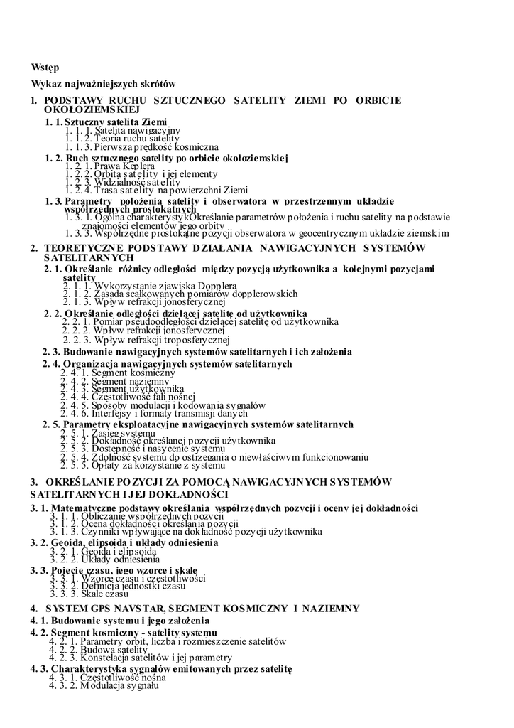 Wstęp Wykaz najwaŜniejszych skrótów 1. PODS TAWY RUCHU S ZTUCZN EGO S ATELITY ZIEMI PO ORBIC IE OKOŁOZIEMS KIEJ 1. 1. Sztuczny satelita Ziemi 1. 1. 1. Satelita nawigacyjny 1. 1. 2. Teoria ruchu satelity 1. 1. 3. Pierwsza prędkość kosmiczna 1. 2. Ruch sztucznego satelity po orbicie okołoziemskiej 1. 2. 1. Prawa Keplera 1. 2. 2. Orbita s at elity i jej elementy 1. 2. 3. Widzialność s at elity 1. 2. 4. Trasa s at elity na powierzchni Ziemi 1. 3. Parametry połoŜenia satelity i obserwatora w przestrzennym układzie współrzędnych prostokątnych 1. 3. 1. Ogólna charakterystykOkreślanie parametrów połoŜenia i ruchu satelity na podstawie znajomości elementów jego orbity 1. 3. 3. Współrzędne prostokątne pozycji obserwatora w geocentrycznym układzie ziemskim 2. TEORETYCZN E PODS TAWY D ZIAŁANIA NAWIGACYJN YCH S YS TEMÓW S ATELITARN YCH 2. 1. Określanie róŜnicy odległości między pozycją uŜytkownika a kolejnymi pozycjami satelity 2. 1. 1. Wykorzystanie zjawiska Dopplera 2. 1. 2. Zasada scałkowanych pomiarów dopplerowskich 2. 1. 3. Wpływ refrakcji jonosferycznej 2. 2. Określanie odległości dzielącej satelitę od uŜytkownika 2. 2. 1. Pomiar pseudoodległości dzielącej satelitę od uŜytkownika 2. 2. 2. Wpływ refrakcji jonosferycznej 2. 2. 3. Wpływ refrakcji troposferycznej 2. 3. Budowanie nawigacyjnych systemów satelitarnych i ich załoŜenia 2. 4. Organizacja nawigacyjnych systemów satelitarnych 2. 4. 1. Segment kosmiczny 2. 4. 2. Segment naziemny 2. 4. 3. Segment uŜytkownika 2. 4. 4. Częstotliwość fali nośnej 2. 4. 5. Sposoby modulacji i kodowania sygnałów 2. 4. 6. Interfejsy i formaty transmisji danych 2. 5. Parametry eksploatacyjne nawigacyjnych systemów satelitarnych 2. 5. 1. Zasięg systemu 2. 5. 2. Dokładność określanej pozycji uŜytkownika 2. 5. 3. Dostępność i nasycenie systemu 2. 5. 4. Zdolność systemu do ostrzegania o niewłaściwym funkcjonowaniu 2. 5. 5. Opłaty za korzystanie z systemu 3. OKREŚ LANIE PO ZYCJI ZA POMOCĄ NAWIGACYJN YCH S YS TEMÓW S ATELITARN YCH I JEJ DOKŁADNOŚCI 3. 1. Matematyczne podstawy określania współrzędnych pozycji i oceny jej dokładności 3. 1. 1. Obliczanie współrzędnych pozycji 3. 1. 2. Ocena dokładności określania pozycji 3. 1. 3. Czynniki wpływające na dokładność pozycji uŜytkownika 3. 2. Geoida, elipsoida i układy odniesienia 3. 2. 1. Geoida i elipsoida 3. 2. 2. Układy odniesienia 3. 3. Pojęcie czasu, jego wzorce i skale 3. 3. 1. Wzorce czasu i częstotliwości 3. 3. 2. Definicja jednostki czasu 3. 3. 3. Skale czasu 4. S YS TEM GPS NAVS TAR, S EGMENT KOS MICZNY I NAZIEMNY 4. 1. Budowanie systemu i jego załoŜenia 4. 2. Segment kosmiczny - satelity systemu 4. 2. 1. Parametry orbit, liczba i rozmieszczenie satelitów 4. 2. 2. Budowa satelity 4. 2. 3. Konstelacja satelitów i jej parametry 4. 3. Charakterystyka sygnałów emitowanych przez satelitę 4. 3. 1. Częstotliwość nośna 4. 3. 2. M odulacja sygnału 4. 3. 3. Kodowanie sygnałów 4. 3. 4. Depesza nawigacyjna 4. 3. 5. Zniekształcenia i zakłócenia 4. 4. Segment naziemny 4. 4. 1. Stacje śledzące 4. 4. 2. Stacja główna 4. 4. 3. Stacje korygujące 5. S YS TEM GPS NAVS TAR, S EGMENT UśYTKO WNIKA 5. 1. Określanie pozycji uŜytkownika i jej dokładność 5. 1. 1. Pomiar pseudoodległości 5. 1. 2. Błędy pomiaru pseudoodległości, budŜet błędów 5. 1. 3. Obliczanie współrzędnych satelity i uŜytkownika 5. 1. 4. Dokładność pozycji uŜytkownika 5. 2. Charakterystyka ogólna odbiorników nawigacyjnych 5. 2. 1. Odbiorniki XX wieku 5. 2. 2. Zasada działania współczesnego odbiornika 5. 2. 3. Antena odbiorcza 5. 2. 4. Odbiorniki GPS w odbiornikach wielosystemowych 5. 2. 5. Podział odbiorników systemu GPS 5. 3. Parametry techniczno-eksploatacyjne odbiorników 5. 3. 1. Parametry odbiorników stacjonarnych 5. 3. 2. Parametry odbiorników przenośnych 5. 4. Kryteria i wymogi odnoszące się do odbiorników systemu GPS 5. 4. 1. Wymogi M iędzynarodowej Organizacji M orskiej IM O 5. 4. 2. Wymogi M iędzynarodowej Komisji Elektrotechnicznej IEC 6. S YS TEM GPS NAVS TAR, EKS PLOATACJA I PERS PEKTYWY ROZWOJU 6. 1. Eksploatacja systemu 6. 1. 1. Zastosowanie systemu w róŜnych dziedzinach gospodarki i nauki 6. 1. 2. Wybrane parametry eksploatacyjne systemu 6. 1. 3. Ograniczenia eksploatacyjne systemu 6. 1. 4. Problemy eksploatacyjne odbiornika stacjonarnego 6. 1. 5. Problemy eksploatacyjne odbiornika przenośnego 6. 1. 6. Zliczanie czasu w systemie GPS 6. 2. Perspektywy rozwoju systemu 6. 2. 1. Rozbudowa i modernizacja segmentu kosmicznego 6. 2. 2. Nowe częstotliwości nośne i kody 6. 2. 3. Segment naziemny 6. 2. 4. Segment uŜytkownika, przewidywana dokładność pozycji 6. 2. 5. System GPS trzeciej generacji 6. 2. 6. Plany radionawigacji administracji amerykańskiej 7. S YS TEM GLONASS 7. 1. Budowanie systemu 7. 2. Segment kosmiczny 7. 2. 1. Parametry orbit, licz ba i rozmieszczenie satelitów 7. 2. 2. Budowa s at elity 7. 2. 3. Częstotliwość nośna 7. 2. 4. Depesza nawigacyjna 7. 3. S egment naziemny 7. 4. Określanie pozycji 7. 5. S tan obecny systemu i perspektywy na przyszłość 8. ODMIANY RÓśNICOWE N AWIGAC YJNYCH S YS TEMÓW S ATELITARNYCH 8. 1. Ogólna koncepcja odmiany róŜnicowej 8. 1. 1. Funkcjonowanie systemu satelitarnego w odmianie róŜnicowej 8. 1. 2. M etody określania poprawek róŜnicowych i ich przesyłania uŜytkownikom 8. 1. 3. Określanie pozycji uŜytkownika i jej błąd 8. 2. Odmiana róŜnicowa systemu GPS - DGPS 8. 2. 1. Zasada odmiany róŜnicowej 8. 2. 2. Budowanie odmiany róŜnicowej dla uŜytkownika morskiego 8. 2. 3. Wykorzystanie odmiany róŜnicowej w nawigacji morskiej 8. 2. 4. Format transmisji danych RTCM SC-104 8. 2. 5. Odbiorniki nawigacyjne 8. 2. 6. Wymagania ITU i IM O 8. 2. 7. Sieciowe wersje odmiany róŜnicowej 8. 2. 8. Komercyjne wersje odmiany róŜnicowej 8. 2. 9. Współpraca odbiornika DGPS z innymi urządzeniami 8. 2. 10. Zalety i wady odmiany róŜ