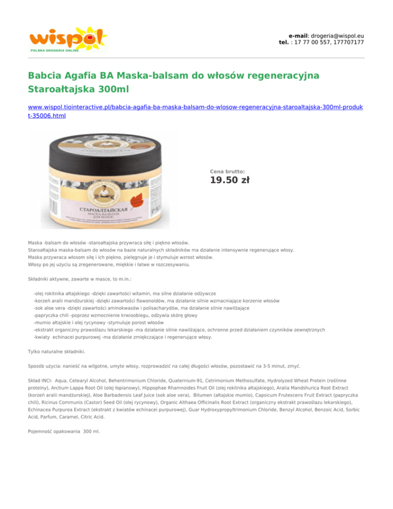 e-mail: [email protected] tel. : 17 77 00 557, 177707177 Babcia Agafia BA Maska-balsam do włosów regeneracyjna Staroałtajska 300ml www.wispol.tiointeractive.pl/babcia-agafia-ba-maska-balsam-do-wlosow-regeneracyjna-staroaltajska-300ml-produk t-35006.html Cena brutto: 19.50 zł Maska -balsam do włosów -staroałtajska przywraca siłę i piękno włosów. Staroałtajska maska-balsam do włosów na bazie naturalnych składników ma działanie intensywnie regenerujące włosy. Maska przywraca włosom siłę i ich piękno, pielęgnuje je i stymuluje wzrost włosów. Włosy po jej użyciu są zregenerowane, miękkie i łatwe w rozczesywaniu. Składniki aktywne, zawarte w masce, to m.in.: -olej rokitnika ałtajskiego -dzięki zawartości witamin, ma silne działanie odżywcze -korzeń aralii mandżurskiej -dzięki zawartości flawonoidów, ma działanie silnie wzmacniające korzenie włosów -sok aloe vera -dzięki zawartości aminokwasów i polisacharydów, ma działanie silnie nawilżające -papryczka chili -poprzez wzmocnienie krwioobiegu, odżywia skórę głowy -mumio ałtajskie i olej rycynowy -stymuluje porost włosów -ekstrakt organiczny prawoślazu lekarskiego -ma działanie silnie nawilżające, ochronne przed działaniem czynników zewnętrznych -kwiaty echinacei purpurowej -ma działanie zmiękczające i regenerujące włosy. Tylko naturalne składniki. Sposób użycia: nanieść na wilgotne, umyte włosy, rozprowadzić na całej długości włosów, pozostawić na 3-5 minut, zmyć. Skład INCI: Aqua, Cetearyl Alcohol, Behentrimonium Chloride, Quaternium-91, Cetrimonium Methosulfate, Hydrolyzed Wheat Protein (roślinne proteiny), Arctium Lappa Root Oil (olej łopianowy), Hippophae Rhamnoides Fruit Oil (olej rokitnika ałtajskiego), Aralia Mandshurica Root Extract (korzeń aralii mandżurskiej), Aloe Barbadensis Leaf Juice (sok aloe vera), Bitumen (ałtajskie mumio), Capsicum Frutescens Fruit Extract (papryczka chili), Ricinus Communis (Castor) Seed Oil (olej rycynowy), Organic Althaea Officinalis Root Extract (organiczny ekstrakt prawoślazu lekarskiego), Echinacea Purpurea Extract (ekstrakt z kwiatów echinacei purpurowej), Guar Hydroxypropyltrimonium Chloride, Benzyl Alcohol, Benzoic Acid, Sorbic Acid, Parfum, Caramel, Citric Acid. Pojemność opakowania 300 ml. Kraj pochodzenia: Federacja Rosyjska. *Ceny obowiązują wyłącznie przy składaniu zamówień przez sklep internetowy. Ceny w sklepach mogą nieznacznie różnić się od cen prezentowanych na stronach sklepu internetowego. Przedstawiona oferta w sklepie internetowym nie stanowi oferty w rozumieniu Kodeksu Cywilnego, i jest jedynie zaproszeniem do rozpoczęcia rokowań (zgodnie z art. 71 k.c.). Zastrzegamy sobie prawo do niezrealizowania zamówień z ważnych przyczyn ekonomicznych.