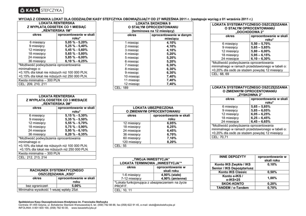 WYCIĄG Z CENNIKA LOKAT DLA ODDZIAŁÓW KASY STEFCZYKA