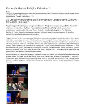Komenda Miejska Policji w Katowicach Źródło: http://www.katowice.slaska.policja.gov.pl/k14/informacje/wiadomosci/125635,10-urodziny-programu-profilaktycznego-Bezpie czne-Dziecko-Przyjaciel-Sznupka.html Wygenerowano: Czwartek, 2 marca 2017, 21:47 10 urodziny programu profilaktycznego „Bezpieczne Dziecko – Przyjaciel Sznupka” Miejski Program Profilaktyczny „Bezpieczne Dziecko – Przyjaciel Sznupka” ma już 10 lat. Powstał z inicjatywy policjantów z Wydziału Prewencji Komendy Miejskiej Policji w Katowicach. Przy współudziale przedstawicieli Urzędu Miasta Katowice oraz Rady Pedagogów i Psychologów Szkolnych Miasta Katowice opracowane zostały założenia programu skierowanego do uczniów katowickich szkół podstawowych i gimnazjów Program obejmuje odrębne scenariusze zajęć dla każdego poziomu klas szkoły podstawowej i gimnazjum. W ten sposób każdy uczeń uczęszczający do szkoły w Katowicach, bierze udział w zajęciach z zakresu bezpieczeństwa w zastosowaniem różnorodnych metod i form pracy. Głównym celem programu jest przygotowanie uczniów do właściwego zachowania się w sytuacjach zagrożenia. Tematyka poruszana w scenariuszach odnosi się do rozwijania kompetencji dzieci i młodzieży w radzeniu sobie z występującymi problemami czy zagrożeniami. Zajęcia według założeń programu, prowadzone są przez wychowawców klasy, którzy doskonale znają swój zespół uczniowski i mogą dostosować sposób prowadzenia zajęć do specyfiki i problemu danej grupy. Nauczyciele znając swoich podopiecznych z właściwą czujnością pedagogiczną przeprowadzają zajęcia według proponowanego scenariusza. 10 urodziny odbyły się w Miejskim Domu Kultury w Szopienicach przy ulicy Hallera. Gościem honorowym była Wiceprezydent Krystyna Siejna. Uczniowie, którzy zwyciężyli w tematycznych konkursach otrzymali cenne nagrody, a dyrektorzy, pedagogowie i psycholodzy certyfikaty „Szkoły laureatów miejskich konkursów profilaktycznych” oraz dyplomy „Szkoła aktywna w miejskim programie profilaktycznym. Policjantów reprezentował nadkom. Tomasz Kępa Naczelnik Wydziału Prewencji. Zainstaluj wtyczkę Flash, aby zobaczyć odtwarzacz. pobierz film - 28.91 MB Ocena: 0/5 (0) Tweetnij