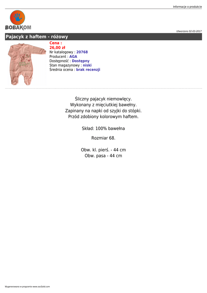 Informacje o produkcie Utworzono 02-03-2017 Pajacyk z haftem - różowy Cena : 26,00 zł Nr katalogowy : 20768 Producent : AGA Dostępność : Dostępny Stan magazynowy : niski Średnia ocena : brak recenzji Śliczny pajacyk niemowlęcy. Wykonany z mięciutkiej bawełny. Zapinany na napki od szyjki do stópki. Przód zdobiony kolorowym haftem. Skład: 100% bawełna Rozmiar 68. Obw. kl. pierś. - 44 cm Obw. pasa - 44 cm Wygenerowano w programie www.oscGold.com Informacje o produkcie Dostępne opcje Pajacyk z haftem - różowy » kolor: różowy, różowy. » Producent: Aga. Wygenerowano w programie www.oscGold.com