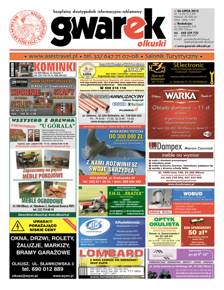 26 LIPCA 2012 Nr 14/2012 (149) Nakład: 20 000 szt. ISSN: 1896-1797 Redakcja: ul. Kluczewska 2/8 32-300 Olkusz tel. 668 339 732 tel. 608 696 097 e-mail: [email protected] [email protected] www.gwarek-olkuski.pl • www.asestravel.pl • tel. 32/ 647 71 07-08 • Salonik Turystyczny • KOMBUD KOMINKI 32-300 Olkusz, ul. Osiecka 1 tel. (32) 754 76 72, 606 249 021 www.system-olkusz.pl KUCHNIE NA WYMIAR SKLEP „ŁUKA” dypl. mistrz kucharstwa - Łukasz Szlęzak Organizacja styp i imprez okolicznościowych Olkusz, ul. Powstańców Śląskich 40 /obok cmentarza/ koszt stypy od jednej osoby - 38 zł /w tym obiad, ciasto, napoje zimne i gorące/ www.gastronomia-wolbrom.pl OLKUSZ, ul. Sławkowska 22 SZAFY Z DRZWIAMI SUWANYMI Centrum Diagnostyki Samochodów Osobowych i Ciężarowych Skoczeń Sebastian 505 179 818 Naprawa Elektroniki Samochodowej ul. Garbarska 41, 32-340 Wolbrom [email protected] ( 508 218 110 Zapraszamy również do organizacji imprez w naszych lokalach w Wolbromiu SKLEP WODNO-KANALIZACYJNY Łukasz Knapczyk WSZYSTKO DO MEBLI czynne 9.00 - 17.00 Obiady domowe – 11 zł tel./fax 32 641 32 00 kom. 502 26 15 86 WSZYSTKO Z DREWNA U NAS NA JTANIEJ!!!! "U GÓRALA" ul. Główna, 32-329 Bolesław, tel. 728-820-552 Po - Pt 8.00 - 17.00, So 8.00 - 14.00 www.knapczyklukasz.bazarek.pl www.kredyty-chwilówki.pl • infolinia: 801 800 107, 604 95 00 95 Producent wyrobów z drewna oferuje: • Boazerię świerkową: szer. 7 cm, 9 cm lub 15 cm • Podbitkę pod dachy • Bardzo duży asortyment listew wykończeniowych z lipy, świerka, buka, dębu i jesionu. Deski podłogowe, schody, poręcze, tralki, sztachety, więźby dachowe, meble oraz drzwi. NOWA BIZNES POŻYCZKA DO 300.000 ZŁ MOŻLIWOŚĆ DOWOZU WŁASNYM TRANSPORTEM tel. kom: 500 400 700 Olkusz, ul. Rynek 27 Zapraszamy!!! warka.olkusz.pl Marcin Czerniak Z NAMI ROZWINIESZ SWOJE SKRZYDŁA Zapraszamy na piętro MEBLE POKOJOWE WOLBROM, ul. Krakowska 44 tel. (32) 611 08 34 • kom. 698 686 482 Serwis spalinowego sprzętu ogrodniczego, leśnego i budowlanego F.H.U. „BRATEX” Marcin Bratek MEBLE OGRODOWE NAPRAWY: • pilarki • kosiarki • traktorki ogrodowe • • wykaszarki itd • stopy wibracyjne • • zagęszczarki gruntu • naprawa elektronarzędzi • 32-300 Olkusz, ul. Składowa 2, (budynek Dworca PKP) tel. (32) 754 60 10 32-340 Wolbrom, ul. 20-stu Straconych 56 tel. 514 998 627 [email protected] [email protected], drzwi.olkusz24.pl Alfaelektronix uc od Pr Maciej Ściański właściciel t en UWAGA!!! PORAŻAJĄCO NISKIE CENY dowóz organizacja imprez okolicznosciowych DLA OSÓB PROWADZĄCYCH DZIAŁALNOŚĆ GOSPODARCZĄ Czynne: pon - piątek 9.00 - 17.15, sobota 9.00-13.00 OLKUSZ, UL. SŁAWKOWSKA 3 tel. 690 012 889 www.wynn.pl Montaż sprzętu RTV Dojazd do klienta gratis 32-310 Klucze, ul. Zawierciańska 6 tel. 32 622 93 69 kom. 515268 149 NIP 637 194 26 33 Sprzedaż sprzętu AGD i RTV Możliwość kupienia sprzętu do zabudowy LOMBARD Z NAMI ZAWSZE SIĘ DOGADASZ!! SKUP ZŁOTA 32-300 Olkusz, Rynek 24, tel. 32 643 34 26, 512 777 884 Czynne: 1000-1800 www.lombard.olkusz.pl Al. 1000-lecia 15D, 32-300 Olkusz przy bramie wjazdowej do OFNE Emalia tel. 662 738 296, 601 432 908 [email protected] www.duodampex.pl PRZEDSIĘBIORSTWO WIELOBRANŻOWE WOBUD 32-300 Olkusz, ul.Nullo 23/7 tel/fax 32 754-26-22, tel.kom. 602-589-437 • NOWOCZESNE TECHNIKI GRZEWCZE /sprzedaż, montaż/ • ARTYKUŁY WOD-KAN • WYPOSAŻENIE ŁAZIENEK OPTYK OKULISTA Technik Optyk Jolanta Siembab Stylistka Optyki Okularowej BON UPOMINKOWY 50 zł* Klucze, ul. Zawierciańska 4 tel: 501 506 547 godziny otwarcia: pon - pt 10:00 - 17:00, sob 09:00 - 13:00 www.optykokulistaklucze.pl [email protected] Przy zamówieniu okularów powyżej 300 zł # OKNA, DRZWI, ROLETY, ŻALUZJE, MARKIZY, BRAMY GARAŻOWE [email protected] SElectronic Przedsiębiorstwo Wielobranżowe Kupon ważny do: końca sierpnia 2012 r. Zapraszamy pn-pt 900-1600 POŚREDNICTWO • DORADZTWO • KREDYTY • KUPNO • SPRZEDAŻ ul. Króla Kazimierza Wielkiego 60, 32-300 Olkusz tel: 32 307 77 33 kom: 508 186 606 [email protected] www.nieruchomosci-lesniak.pl 2 Informacje Powiatowy serwis informacyjny Nie martwię się o przyszłość naszego powiatu Druga część rozmowy ze starostą Jerzym Antonim Kwaśniewskim - Czy jest szansa na porozumienie z Urzędem Miasta w Olkuszu w sprawie budynku starego Starostwa? Należy on po połowie do miasta i powiatu. Ten budynek, po remoncie, mógłby być perłą, ale w takim stanie, w jakim jest obecnie, grozi katastrofą budowlaną. Czy miasto, tak jak powiat, też chce sprzedać swoją połowę? - Tak. Jestem po rozmowach z burmistrzem Dariuszem Rzepką. Miasta też nie stać na remont tego budynku. To byłaby kwota kilkunastu milionów złotych. Nie mamy takich pieniędzy i jest wątpliwe, żebyśmy je dostali ze środków unijnych. Z drugiej strony nie możemy pozwolić na dalsze niszczenie tego budynku. Dodam, że wojewódzki konserwator zabytków nie wnosi sprzeciwu wobec sprzedaży. Do końca sierpnia obie rady, miasta i powiatu, wspólnie, powinny podjąć ostateczną decyzję. Nie możemy tego zrobić sami, bo byłoby to niezgodne z umową, jaką podpisaliśmy z miastem, gdy przekazano nam aktem darowizny połowę tego budynku. - Jakich jeszcze inwestycji, poza drogami, możemy się spodziewać? - W ramach projektu „Najzdrowszy Powiat Europy” chcemy wyremontować skrzydło w Zespole Szkół nr 3, gdzie znajdzie się Prewentorium. Na tę inwestycję staramy się pozyskać środki z Funduszu Norweskiego, który wynosi 30 mln złotych. Niedługo mają zapaść decyzje o ich podziale. Budynek należałby do powiatu, a za profilaktykę odpowiadałby nasz ZOZ. Jest to, według mnie, najważniejsza inwestycja, bo dotyczy zdrowia i przedłużenia życia mieszkańców naszego powiatu. - Był Pan zwolennikiem prywatyzacji olkuskiego szpitala, a teraz jest Pan w koalicji z przeciwnikami tego pomysłu. Jak wygląda sprawa ze szpitalem? - Od zapisu o przekształceniu ZOZ