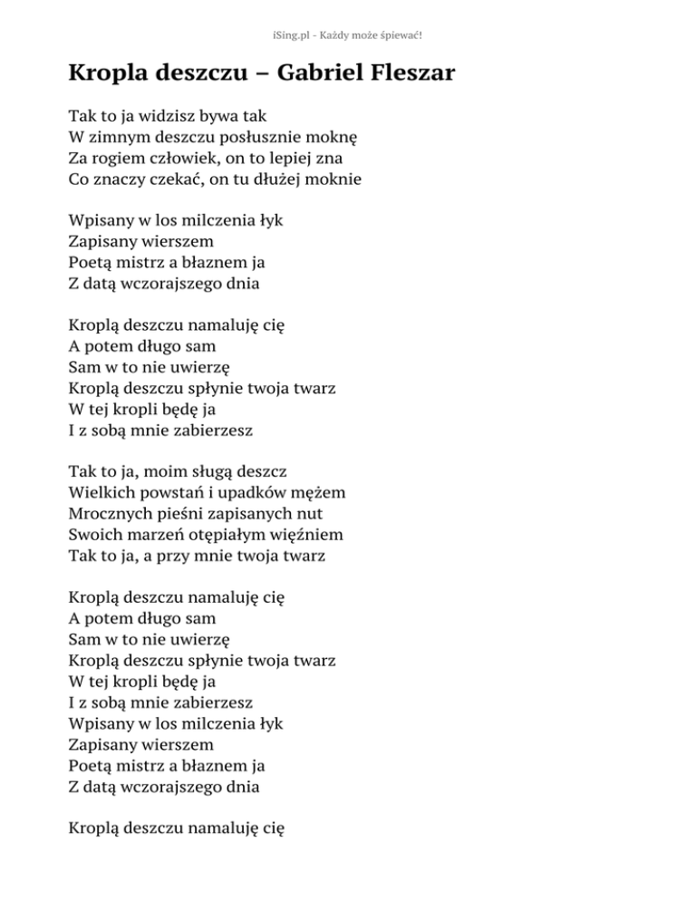 iSing.pl - Każdy może śpiewać! Kropla deszczu – Gabriel Fleszar Tak to ja widzisz bywa tak W zimnym deszczu posłusznie moknę Za rogiem człowiek, on to lepiej zna Co znaczy czekać, on tu dłużej moknie Wpisany w los milczenia łyk Zapisany wierszem Poetą mistrz a błaznem ja Z datą wczorajszego dnia Kroplą deszczu namaluję cię A potem długo sam Sam w to nie uwierzę Kroplą deszczu spłynie twoja twarz W tej kropli będę ja I z sobą mnie zabierzesz Tak to ja, moim sługą deszcz Wielkich powstań i upadków mężem Mrocznych pieśni zapisanych nut Swoich marzeń otępiałym więźniem Tak to ja, a przy mnie twoja twarz Kroplą deszczu namaluję cię A potem długo sam Sam w to nie uwierzę Kroplą deszczu spłynie twoja twarz W tej kropli będę ja I z sobą mnie zabierzesz Wpisany w los milczenia łyk Zapisany wierszem Poetą mistrz a błaznem ja Z datą wczorajszego dnia Kroplą deszczu namaluję cię A potem długo sam Sam w to nie uwierzę Kroplą deszczu spłynie twoja twarz W tej kropli będę ja I z sobą mnie zabierzesz Kroplą deszczu namaluję cię A potem długo sam Sam w to nie uwierzę Kroplą deszczu spłynie twoja twarz W tej kropli będę ja I z sobą mnie zabierzesz Tam będę ja Słowa: Aldona Dąbrowska Muzyka: Sławomir Sokołowski Rok wydania: brak danych Płyta: brak danych