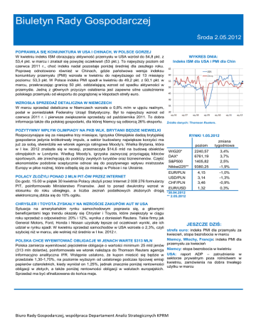 Biuletyn Rady Gospodarczej Środa 2.05.2012 POPRAWIŁA SIĘ KONIUNKTURA W USA I CHINACH, W POLSCE GORZEJ W kwietniu indeks ISM obrazujący aktywność przemysłu w USA wzrósł do 54,8 pkt. z 53,4 pkt. w marcu i znalazł się powyżej oczekiwań (53 pkt.). To najwyższy poziom od czerwca 2011 r., choć indeks nadal pozostaje poniżej średniej dla zeszłego roku. Poprawę odnotowano również w Chinach, gdzie państwowa wersja indeksu koniunktury przemysłu (PMI) wzrosła w kwietniu do najwyższego od 13 miesięcy poziomu: 53,3 pkt. W Polsce indeks PMI spadł w kwietniu do 49,2 pkt. z 50,1 pkt. w marcu, przekraczając granicę 50 pkt. oddzielającą wzrost od spadku aktywności w przemyśle. Jedną z głównych przyczyn osłabienia jest zapewne silne uzależnienie polskiego przemysłu od eksportu do pogrążonej w kłopotach strefy euro. WZROSŁA SPRZEDAŻ DETALICZNA W NIEMCZECH W marcu sprzedaż detaliczna w Niemczech wzrosła o 0,8% m/m w ujęciu realnym, podał w poniedziałek Federalny Urząd Statystyczny. Był to najwyższy wzrost od czerwca 2011 r. i pierwsze zwiększenie sprzedaży od października 2011. To dobra informacja także dla polskiej gospodarki, dla której Niemcy są odbiorcą 26% eksportu. POZYTYWNY WPŁYW OLIMPIADY NA PKB WLK. BRYTANII BĘDZIE NIEWIELKI Rozpoczynające się za niespełna trzy miesiące, Igrzyska Olimpijskie dadzą brytyjskiej gospodarce jedynie krótkotrwały impuls, a sektor budowlany największe korzyści ma już za sobą, stwierdziła we wtorek agencja ratingowa Moody’s. Wielka Brytania, która w I kw. 2012 znalazła się w recesji, przeznaczyła $14,6 mld na budowę obiektów olimpijskich w Londynie. Według Moody’s, igrzyska zazwyczaj przyciągają kibiców sportowych, ale zniechęcają do podróży zwykłych turystów oraz biznesmenów. Część ekonomistów podobnie sceptycznie odnosi się do pozytywnego wpływu mistrzostw Europy w piłce nożnej, które odbędą się za miesiąc w Polsce i na Ukrainie. WYKRES DNIA: Indeks ISM dla USA i PMI dla Chin Źródło danych: Thomson Rueters. RYNKI 1.05.2012 WIG20* DAX* S&P500 Nikkei225** EUR/PLN POLACY ZŁOŻYLI PONAD 2 MLN PIT-ÓW PRZEZ INTERNET USD/PLN Do godz. 15.00 w piątek 30 kwietnia Polacy złożyli przez Internet 2 008 276 formularzy CHF/PLN PIT, poinformowało Ministerstwo Finansów. Jest to ponad dwukrotny wzrost w EUR/USD stosunku do roku ubiegłego, a liczba zeznań podatkowych złożonych drogą *30.04.2012 elektroniczną zbliża się do 10% ogółu. ** 2.05.2012 poziom zmiana tygodniowa 2240,57 6761,19 1405,82 9380,25 3,4% 3,7% 2,5% -1,9% 4,15 3,14 3,46 1,32 -1,0% -1,3% -0,9% 0,3% CHRYSLER I TOYOTA ZYSKAŁY NA WZROŚCIE ZAKUPÓW AUT W USA Sytuacja na amerykańskim rynku samochodowym poprawia się, a głównymi beneficjentami tego trendu okazały się Chrysler i Toyota, które zwiększyły w ciągu roku sprzedaż o odpowiednio: 20% i 12%, wynika z doniesień Reutera. Takie firmy jak General Motors, Ford, Honda i Nissan uzyskały lepsze od oczekiwań wyniki, ale ich JESZCZE DZIŚ: udział w rynku spadł. W kwietniu sprzedaż samochodów w USA wzrosła o 2,3%, czyli strefa euro: indeks PMI dla przemysłu za szybciej niż w marcu, ale wolniej niż średnio w I kw. 2012 r. kwiecień, stopa bezrobocia w marcu Niemcy, Włochy, Francja: indeks PMI dla POLSKA CHCE WYEMITOWAĆ OBLIGACJE W JENACH WARTE $313 MLN przemysłu za kwiecień Polska zamierza wyemitować pięcioletnie obligacje o wartości minimum 25 mld jenów (313 mln dolarów), poinformowała we wtorek należąca do Thomson Reuters agencja Niemcy: stopa bezrobocia w kwietniu informacyjno analityczna IFR. Wstępnie ustalono, że kupon mieścić się będzie w USA: raport ADP – zatrudnienie w przedziale 1,30-1,70%, na poziomie wyższym od ustalonego podczas lipcowej emisji sektorze prywatnym poza rolnictwem w kwietniu, zamówienia na dobra trwałego papierów czteroletnich, kiedy wyniósł on 1,25%, jednak znacznie poniżej rentowności użytku w marcu obligacji w złotych, a także poniżej rentowności obligacji w walutach europejskich. Sprzedaż ma być sfinalizowana do końca maja. Biuro Rady Gospodarczej, współpraca Departament Analiz Strategicznych KPRM Biuro Rady Gospodarczej, współpraca Departament Analiz Strategicznych KPRM
