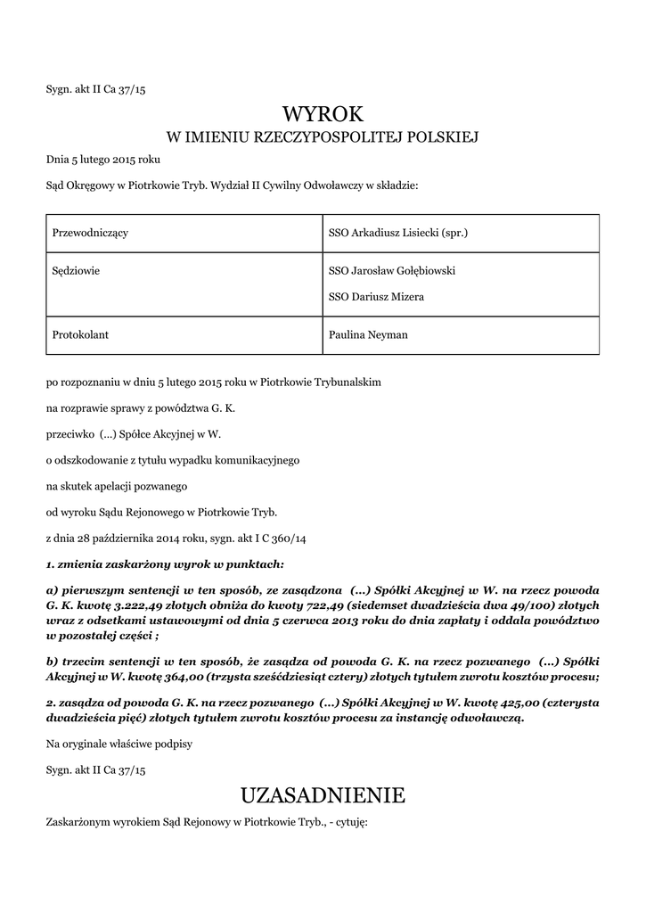 Sygn. akt II Ca 37/15 WYROK W IMIENIU RZECZYPOSPOLITEJ POLSKIEJ Dnia 5 lutego 2015 roku Sąd Okręgowy w Piotrkowie Tryb. Wydział II Cywilny Odwoławczy w składzie: Przewodniczący SSO Arkadiusz Lisiecki (spr.) Sędziowie SSO Jarosław Gołębiowski SSO Dariusz Mizera Protokolant Paulina Neyman po rozpoznaniu w dniu 5 lutego 2015 roku w Piotrkowie Trybunalskim na rozprawie sprawy z powództwa G. K. przeciwko (...) Spółce Akcyjnej w W. o odszkodowanie z tytułu wypadku komunikacyjnego na skutek apelacji pozwanego od wyroku Sądu Rejonowego w Piotrkowie Tryb. z dnia 28 października 2014 roku, sygn. akt I C 360/14 1. zmienia zaskarżony wyrok w punktach: a) pierwszym sentencji w ten sposób, ze zasądzona (...) Spółki Akcyjnej w W. na rzecz powoda G. K. kwotę 3.222,49 złotych obniża do kwoty 722,49 (siedemset dwadzieścia dwa 49/100) złotych wraz z odsetkami ustawowymi od dnia 5 czerwca 2013 roku do dnia zapłaty i oddala powództwo w pozostałej części ; b) trzecim sentencji w ten sposób, że zasądza od powoda G. K. na rzecz pozwanego (...) Spółki Akcyjnej w W. kwotę 364,00 (trzysta sześćdziesiąt cztery) złotych tytułem zwrotu kosztów procesu; 2. zasądza od powoda G. K. na rzecz pozwanego (...) Spółki Akcyjnej w W. kwotę 425,00 (czterysta dwadzieścia pięć) złotych tytułem zwrotu kosztów procesu za instancję odwoławczą. Na oryginale właściwe podpisy Sygn. akt II Ca 37/15 UZASADNIENIE Zaskarżonym wyrokiem Sąd Rejonowy w Piotrkowie Tryb., - cytuję: „1. zasądził od pozwanego na rzecz powoda kwotę 3 222,49 złote z ustawowymi odsetkami: a. w zakresie kwoty 2 900 złotych od dnia 05 czerwca 2013 r. o dnia zapłaty, b. w zakresie kwoty 322,49 złote od dnia 26 sierpnia 2014 r. do dnia zapłaty, 2. oddalił powództwo w pozostałym zakresie. 3. zasądził od pozwanego na rzecz powoda kwotę 1 371.51 złotych tytułem zwrotu kosztów procesu” – koniec cytatu. Podstawę powyższego rozstrzygnięcia stanowiły przytoczone poniżej ustalenia i zarazem rozważania Sądu Rejonowego: W wyniku wypadku komunikacyjnego mającego miejsce w dniu 29 sierpnia 2012 roku uszkodzony został samochód osobowy marki S. (...) nr rej (...), stanowiący własność powoda G. K.. Sprawca wypadku w chwili zdarzenia posiadał zawartą z pozwanym towarzystwem ubezpieczeń umowę ubezpieczenia od odpowiedzialności cywilnej posiadaczy pojazdów mechanicznych. Strona pozwana uznała zasadę swojej odpowiedzialności, w związku z czym po przeprowadzeniu postępowania likwidacyjnego ostatecznie wypłaciła powodowi G. K. kwotę 8.977,51 zł tytułem odszkodowania, 776.70 zł tytułem zwrotu kosztu holowania oraz 2.687,55 zł tytułem zwrotu kosztu wynajmu pojazdu zastępczego. Po dokonanej naprawie pojazdu powoda pękła prawa sprężyna amortyzacyjna, na skutek czego w październiku 2012 r. powód dokonał wymiany dwóch sprężyn amortyzacyjnych. W połowie lutego 2013 r. uszkodzeniu uległa z kolei przekładnia układu kierowniczego. Pismem z dnia 25 marca 2013 r. powód zgłosił dodatkową szkodę, jednakże decyzją wydana w dniu 4 czerwca 2013 r. pozwany odmówił wypłaty dalszego odszkodowania. Pękniecie sprężyny zawieszenia koła przedniego prawego nie jest związane ze zdarzeniem przedmiotowym i posiada charakter tzw. pęknięcia zmęczeniowego rozwijającego się na długo przed datą zdarzenia przedmiotowego w dniu 29 sierpnia 2012 r. Z kolei uszkodzenie przekładni kierowniczej posiada związek skutkowo-przyczynowy ze zdarzeniem przedmiotowym z dnia 29 sierpnia 2012 r. Koszt naprawy uszkodzeń pojazdu marki ..S. (...)" nr rej (...)po kolizji z. dnia 29 sierpnia 2012 r. roku przy użyciu oryginalnych części zamiennych oznaczonych logiem producenta pojazdu oraz nieoznaczonych logo marki pojazdu jakości (...) z uwzględnieniem zakresu uszkodzeń udokumentowanych w załączonych aktach bez potrąceń kosztów lakierowania i cen części zamiennych, przy stawce roboczogodzinowej wynoszącej 90 / 90 zł netto / rbh blacha/lakier, z regeneracją (naprawa) przekładni kierowniczej wynosi 15.353,82 zł netto (18.885,20 zł brutto). Koszt naprawy przekładni kierownicy polegający na wymianie na nową regenerowaną pochodzącą z (...) S. wynosi 2520 zł brutto. Koszt naprawy przekładni kierowniczej polegający na zastąpieniu uszkodzonej przekładni kierowniczej nową pochodzącą z (...) S. wynosi 3.500 zł brutto. Koszt naprawy przekładni kierowniczej polegającej na regeneracji przekładni kierowniczej wynosi 925 zł brutto ( koszt wymiany przekładni + koszt regeneracji). Wartość rynkowa pojazdu marki S. (...) o numerze rejestracyjnym(...) w stanie nieuszkodzonym na dzień kolizji z dnia 29 sierpnia 2012r. ustalona na podstawie systemu Info - Ekspert z uwzględnieniem cech indywidualnych pojazdu wynosiła 12.200 zł brutto. Przy koszcie naprawy pojazdu wynoszącym przynajmniej 18.885.20 zł brutto, szkoda przedmiotowa to szkoda całkowita (koszt naprawy pojazdu przekracza wartość pojazdu w stanie nieuszkodzonym na dzień szkody). Wartość pozostałości (wraku) wynosi wtedy 2.500 zł brutto, zaś wartość szkody (wysokość odszkodowania dla poszkodowanego) wynosi wtedy 9.700 zł brutto. Suma wartości pozostałości oraz odszkodowania jest wartością pojazdu przed szkodą w stanie nieuszkodzonym. Mając tak poczynione ustalenia faktyczne Sąd Rejonowy uznał powództwo za częściowo uzasadnione. W przedmiotowej sprawie nie były kwestionowane okoliczności związane z powstaniem szkody w samochodzie stanowiącym własność powoda oraz odpowiedzialność strony pozwanej z tego tytułu. Kwestię sporną stanowił zakres powstałych uszkodzeń w wyniku kolizji, a w szczególności istnienie związku przyczynowego między pęknięciem prawej sprężyna amortyzatora oraz awarii przekładni układu kierowniczego a zdarzeniem z dnia 29 sierpnia 2012 r., a także koszt naprawy uszkodzonego pojazdu. W przedmiotowej sprawie Sąd Rejonowy dopuścił dowód z o
