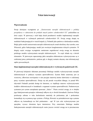 Tekst interwencji Wprowadzenie Swoje dzisiejsze wystąpienie pt. „Zastosowanie narzędzi elektronicznych z polskiej perspektywy w odniesieniu do praktyki innych państw członkowskich UE” podzieliłem na dwie części. W pierwszej z nich będę chciał przedstawić modele implementacji narzędzi elektronicznych w wybranych państwach członkowskich UE. Swoją uwagę skupię na modelach funkcjonujących w trzech krajach, tj. Finlandii jako państwa o doskonałym modelu, Belgii gdzie model zastosowania narzędzi elektronicznych został określony zbyt szeroko, oraz Włoszech, gdzie funkcjonujący model jest swoistym konglomeratem różnych systemów. W drugiej części swojego wystąpienia zamierzam zogniskować swoją uwagę na ukazaniu polskiego modelu wykorzystania narzędzi elektronicznych. Ta część składa się z dwóch elementów. W pierwszym zaprezentuję jakie narzędzia elektroniczne wykorzystywane są w codziennej pracy prokuratorów, podczas gdy w drugiej zostanie ukazany stan informatyzacji sądów powszechnych. Stan implementacji narzędzi elektronicznych w wybranych państwach UE. W pierwszej kolejności dokonam prezentacji fińskiego modelu wykorzystywania narzędzi elektronicznych w praktyce wymiaru sprawiedliwości. System fiński uznawany jest za wzorcowy, albowiem rozwiązania w nim przyjęte stanowią istotne ułatwienia w codziennej pracy wymiaru sprawiedliwości. Dzieje się tak przede wszystkim dlatego, że ponad 90% obywateli Finlandii posiada dostęp do Internetu, co implikuje masowe wykorzystywanie środków elektronicznych w kontaktach z organami wymiaru sprawiedliwości. Podstawowym systemem jest system zarządzania sprawami „Sakari”. Warto zwrócić uwagę, że w obrębie jego funkcjonowania przepływ informacji odbywa się w dwóch kierunkach. Zarówno Policja przekazuje zebrane w toku dochodzenia materiały do prokuratury jak i prokuratura komunikuje się za pomocą tego systemu z Policją. Również za pośrednictwem tego systemu odbywa się komunikacja na linii prokuratura - sąd. W tym celu wykorzystywane jest specjalne, wysoce chronione łącze internetowe. Przy omawianiu fińskiego modelu funkcjonowania narzędzi elektronicznych warto jeszcze zwrócić uwagę na te przeznaczone dla obywateli. Obywatele Finlandii mają możliwość elektronicznego zgłoszenia popełnienia przestępstwa. Na stronie fińskiej policji dostępne są specjalne formularze dotyczące najczęściej popełnianych przestępstw. Kolejną interesującą rzeczą jest konto obywatelskie, za pośrednictwem którego obywatel ma możliwość uzyskania pomocy, m. in. dotyczącej „pomocy prawnej”. Logowanie do systemu następuje za pośrednictwem specjalnej elektronicznej karty ID, albo numeru konta bankowego. Drugim modelem, który pragnę omówić jest model belgijski, który okazał się być zbyt rozbudowany. Projekt „Phenix”, w ramach którego działał podstawowy system elektronicznego zarządzania sprawami karnymi został oparty w całości na aktach elektronicznych, których ciągłe rozbudowywanie spowalniało funkcjonowanie systemu. Dodatkowo rozbudowywanie to miało miejsce na wszystkich etapach procesu karnego, począwszy od Policji, a na sądzie skończywszy. Na skutek powyższych działań w 2005 r. zaprzestano dalszego wdrażania systemu. Projekt okazał się niemożliwym do zrealizowania właśnie przez jego znaczne rozbudowanie. Ostatnim modelem, których chciałbym zaprezentować jest model włoski, który wydaje się być swoistym połączeniem wielu różnych systemów. Zanim pod koniec lat 80 – tych wprowadzono system „Rege”, we Włoszech funkcjonowało wiele pomniejszych systemów. Zdecydowano się je połączyć w jeden ogólnonarodowy system działający właśnie pod nazwą „Rege”. Po kilku latach jego funkcjonowania zastąpiono go systemem NSC. Systemy te, tak jak i ich odpowiedniki w pozostałych krajach ułatwiają ogólno pojęte administrowanie sprawami karnymi. Interesującym aspektem NSC jest funkcjonowanie podsystemu przeznaczonego dla krajowego biura zwalczającego mafię oraz okręgowych biur zwalczających mafię. W przeciwieństwie do systemu fińskiego, tutaj przepływ informacji odbywa się tylko i wyłącznie w jednym kierunku. Ma to zapewnić ochronę przekazywanych informacji. W ramach włoskiego modelu funkcjonowania narzędzi elektronicznych, warto również wspomnieć o portalu Abiforjustice.it . Portal ten został utworzony prze Włoski Związek Bankowy i ma na celu zwiększenie wydajności procedur, promowanie nowych technologii, a także ograniczenie kosztów związanych z funkcjonowaniem wymiaru sprawiedliwości. Do portalu przyłączyły się już 52 prokuratury. Polska perspektywa Przechodząc do drugiej części mojego wystąpienia, poświęconej prezentacji polskiej perspektywy implementacji narzędzi elektronicznych. Również ta część została podzielona na dwa fragmenty. Pierwszy z nich dotyczy funkcjonowania narzędzi elektronicznych w obrębie powszechnych jednostek prokuratury, podczas gdy drugi koncentruje się na narzędziach elektronicznych wykorzystywanych w obrębie sądów powszechnych. Omawianie istniejących narzędzi elektronicznych w praktyce prokuratorskiej pragnę rozpocząć od przedstawienia możliwości składania skarg i zażaleń drogą elektroniczną. Niestety brak jest jednolitego systemu, który umożliwiałby komunikację obywateli z prokuraturą za pośrednictwem Internetu. Jednakże w praktyce wykształciła się sytuacja, w której to obywatel chcąc złożyć skargę lub wniosek, może wysłać ją z pośrednictwem poczty elektronicznej. Żaden mail wysłany przez obywatela nie pozostanie bez odpowiedzi. Dodatkowo w 2011 roku uruchomiono elektroniczną platformę usług administracji publicznej (EPUAP), która po prostym zalogowaniu, umożliwia wysłanie skarg lub wniosków do każdej prokuratury w kraju. Podstawowym narzędziem pracy prokuratorów jest system informacji proku