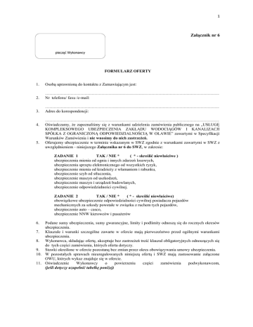 1 Załącznik nr 6 pieczęć Wykonawcy FORMULARZ OFERTY 1. Osobą uprawnioną do kontaktu z Zamawiającym jest: 2. …………………………………………………………………………………………………………… Nr telefonu/ faxu /e-mail: 3. …………………………………………………………………………………………………………… Adres do korespondencji: 4. 5. …………………………………………………………………………………………………………… Oświadczamy, że zapoznaliśmy się z warunkami udzielenia zamówienia publicznego na „USŁUGĘ KOMPLEKSOWEGO UBEZPIECZENIA ZAKŁADU WODOCIĄGÓW I KANALIZACJI SPÓŁKA Z OGRANICZONĄ ODPOWIEDZIALNOŚCIĄ W OŁAWIE” zawartymi w Specyfikacji Warunków Zamówienia i nie wnosimy do nich zastrzeżeń. Oferujemy ubezpieczenie w terminie wskazanym w SWZ zgodnie z warunkami zawartymi w SWZ z uwzględnieniem - niniejszego Załącznika nr 6 do SWZ, w zakresie: ZADANIE 1 TAK / NIE * ( * - skreślić niewłaściwe ) ubezpieczenia mienia od ognia i innych zdarzeń losowych, ubezpieczenia sprzętu elektronicznego od wszystkich ryzyk, ubezpieczenie mienia od kradzieży z włamaniem i rabunku, ubezpieczenie szyb od stłuczenia, ubezpieczenie maszyn od uszkodzeń, ubezpieczenie maszyn i urządzeń budowlanych, ubezpieczenie odpowiedzialności cywilnej. ZADANIE 2 TAK / NIE * ( * - skreślić niewłaściwe) obowiązkowe ubezpieczenie odpowiedzialności cywilnej posiadacza pojazdów mechanicznych za szkody powstałe w związku z ruchem tych pojazdów, ubezpieczenie auto – casco, ubezpieczenie NNW kierowców i pasażerów Podane sumy ubezpieczenia, sumy gwarancyjne, limity i podlimity odnoszą się do rocznych okresów ubezpieczenia. 7. Klauzule i warunki szczególne zawarte w ofercie mają pierwszeństwo przed ogólnymi warunkami ubezpieczenia. 8. Wykonawca, składając ofertę, akceptuje bez zastrzeżeń treść klauzul obligatoryjnych odnoszących się do tych części zamówienia, których oferta dotyczy. 9. Stawki określone w ofercie pozostaną bez zmian przez okres obowiązywania umowy ubezpieczenia. 10. W pozostałych sprawach nieuregulowanych niniejszą ofertą i SWZ mają zastosowanie załączone OWU, których wykaz znajduje się w ofercie. 11. Oświadczenie Wykonawcy o powierzeniu części zamówienia podwykonawcom, (jeśli dotyczy uzupełnić tabelkę poniżej) 6. 2 Oświadczenie Wykonawcy o powierzeniu części zamówienia podwykonawcy/om Rodzaj części zamówienia, której wykonanie wykonawca zamierza powierzyć podwykonawcom Lp. 12. Informujemy, że uważamy się za związanych niniejszą ofertą w okresie wskazanym w SWZ. 13. Akceptujemy treść wzorów umowy odpowiednio: Załącznik nr 9 (wzór umowy do Zadania 1) i Załącznik nr 10 (wzór umowy do zadania 2) do SWZ i zobowiązujemy się w przypadku wyboru naszej oferty - jako najkorzystniejszej - do zawarcia umowy ubezpieczenia w miejscu i terminie oznaczonym przez Zamawiającego. 14. Oferujemy ubezpieczenie dla Zakładu Wodociągów i Kanalizacji Spółka z ograniczoną odpowiedzialnością w Oławie w terminie wskazanym, w zakresie: ZADANIE 1 TAK / NIE* ( * - skreślić niewłaściwe) W przypadku nieskładania oferty na zadanie pierwsze prosimy o niewypełnianie pozycji dotyczących zadania pierwszego oraz nie podpisywanie stron dotyczących zadania pierwszego. W przypadku składania oferty na zadanie pierwsze prosimy wypełnić wszystkie pozycje, rubryki tabel, a także podać pełny wykaz warunków ubezpieczenia, które będą miały zastosowanie, z oznaczeniem uchwały zatwierdzającej i daty zatwierdzenia. ubezpieczenia mienia od ognia i innych zdarzeń losowych, ubezpieczenia sprzętu elektronicznego od wszystkich ryzyk, ubezpieczenie mienia od kradzieży z włamaniem i rabunku, ubezpieczenie szyb od stłuczenia, ubezpieczenie maszyn od uszkodzeń, ubezpieczenie maszyn i urządzeń budowlanych, ubezpieczenie odpowiedzialności cywilnej. Łączna składka przedstawionej oferty dla ZADANIA 1 za wskazany okres ubezpieczenie mienia i odpowiedzialności cywilnej Zakładu Wodociągów i Kanalizacji Spółka z ograniczoną odpowiedzialnością w Oławie wynosi: ............................................................................... zł brutto, (słownie: …………………………………….................................................................................... zł). W ramach powyższej składki oferujemy: Ubezpieczenie mienia od ognia i innych zdarzeń losowych składka za roczny okres ubezpieczenia ............................................................................. zł , (słownie................................................................................................................................. zł) Przedmiot ubezpieczenia Lp Suma Stawka za roczny Składka za roczny okres ubezpieczenia w okres ubezpieczenia ubezpieczenia (zł) (%) (zł) 1. Budynki i budowle (grupa I – II) 98.099.874,- 2. Maszyny, urządzenia i wyposażenie (grupa III – VIII) a) bez maszyn budowlanych (5 koparek) – ubezpieczenie odrębną polisą b) bez sprzętu elektronicznego, nośników danych, oprogramowania – ubezpieczenie odrębną polisą c) bez pojazdów z grupy VII KRŚT, podlegających obowiązkowi 1.920.906,- ........................... .............................. ............................ …………………… 3 rejestracji – ubezpieczenie odrębną polisą 3. 4. 5. 6. Środki obrotowe (bez VAT) 650.000,- Maszyny, urządzenia i wyposażenie nie ujęte w ewidencji środków trwałych – środki trwałe mniejszej wartości (niskocenne) amortyzowane jednorazowo Nakłady inwestycyjne we własnych środkach trwałych - inwestycje nie zakończone we własnych środkach trwałych Mienie najmowane – przyjęte przez ubezpieczającego do używania w ramach umowy najmu, dzierżawy, leasingu, użyczenia lub innego rodzaju umowy o podobnym charakterze: Prze