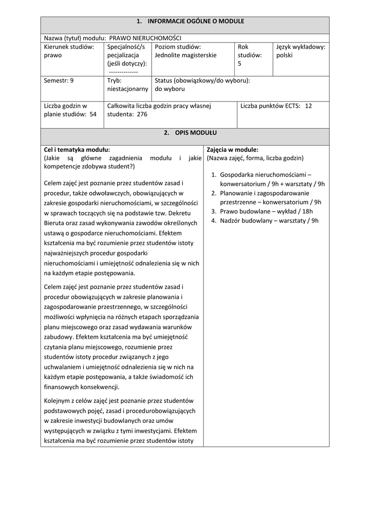 1. INFORMACJE OGÓLNE O MODULE Nazwa (tytuł) modułu: PRAWO NIERUCHOMOŚCI Kierunek studiów: Specjalność/s Poziom studiów: Rok prawo pecjalizacja Jednolite magisterskie studiów: (jeśli dotyczy): 5 -------------Semestr: 9 Tryb: Status (obowiązkowy/do wyboru): niestacjonarny do wyboru Liczba godzin w planie studiów: 54 Całkowita liczba godzin pracy własnej studenta: 276 Język wykładowy: polski Liczba punktów ECTS: 12 2. OPIS MODUŁU Cel i tematyka modułu: (Jakie są główne zagadnienia kompetencje zdobywa student?) modułu i Zajęcia w module: jakie (Nazwa zajęć, forma, liczba godzin) Celem zajęć jest poznanie przez studentów zasad i procedur, także odwoławczych, obowiązujących w zakresie gospodarki nieruchomościami, w szczególności w sprawach toczących się na podstawie tzw. Dekretu Bieruta oraz zasad wykonywania zawodów określonych ustawą o gospodarce nieruchomościami. Efektem kształcenia ma być rozumienie przez studentów istoty najważniejszych procedur gospodarki nieruchomościami i umiejętność odnalezienia się w nich na każdym etapie postępowania. Celem zajęć jest poznanie przez studentów zasad i procedur obowiązujących w zakresie planowania i zagospodarowanie przestrzennego, w szczególności możliwości wpłynięcia na różnych etapach sporządzania planu miejscowego oraz zasad wydawania warunków zabudowy. Efektem kształcenia ma być umiejętność czytania planu miejscowego, rozumienie przez studentów istoty procedur związanych z jego uchwalaniem i umiejętność odnalezienia się w nich na każdym etapie postępowania, a także świadomość ich finansowych konsekwencji. Kolejnym z celów zajęć jest poznanie przez studentów podstawowych pojęć, zasad i procedurobowiązujących w zakresie inwestycji budowlanych oraz umów występujących w związku z tymi inwestycjami. Efektem kształcenia ma być rozumienie przez studentów istoty 1. Gospodarka nieruchomościami – konwersatorium / 9h + warsztaty / 9h 2. Planowanie i zagospodarowanie przestrzenne – konwersatorium / 9h 3. Prawo budowlane – wykład / 18h 4. Nadzór budowlany – warsztaty / 9h tych procedur i umiejętność odnalezienia się w nich na każdym etapie, a także świadomość ich finansowych konsekwencji Celem zajęć jest praktyczne przećwiczenie procedur związanych z inwestycjami budowlanymi, o których mowa na wykładzie, w szczególności przygotowanie wniosków i odwołań, a także opracowanie projektów umów w działalności budowlanej. 3. EFEKTY KSZTAŁCENIA Efekty modułowe: (Wiedza i umiejętności, jakie powinien posiadać student, by zaliczyć moduł) Wiedza: 1. ma wiedzę o sposobach i źródłach pozyskiwania danych pozwalających na samodzielne analizowanie obowiązujących przepisów z zakresu nieruchomości 2. ma wiedzę o procesach zmian zachodzących w dziedzinie gospodarowania nieruchomościami i prowadzenia inwestycji ich dotyczących 3. ma podstawową wiedzę o organach państwa, których kompetencje obejmują kwestie związane z nieruchomościami i inwestycjami ich dotyczącymi, zna pojęcia z zakresu nieruchomości i inwestycji Umiejętności: 1. posiada umiejętność praktycznego wykorzystania zdobytej wiedzy z zakresu procesów związanych z nieruchomościami, potrafi formułować w tym zakresie własne opinie na podstawie dobieranych krytycznie danych, również w zakresie oceny ich skutków prawnych i ekonomicznych 2. potrafi prognozować praktyczne skutki zmian prawa regulującego kwestie związane z nieruchomościami oraz przebieg postępowań prawnych związanych z prowadzeniem inwestycji związanych z nieruchomościami 3. posiada umiejętność samodzielnego przygotowania i zaproponowania rozwiązań konkretnych problemów wynikłych w procesie zarządzania i inwestycji w nieruchomości, posiada Obowiązkowa literatura: (jeśli jest wymagana) umiejętność wdrożenia proponowanych rozwiązań Kompetencje społeczne: 1. potrafi odpowiednio określić priorytety służące realizacji określonego przez siebie lub innych zadania oraz przewidywać skutki podjętej działalności 2. umie uczestniczyć w przygotowaniu projektów gospodarczych z zakresu nieruchomości i inwestycji z nimi związanych uwzględniając aspekty prawne i ekonomiczne