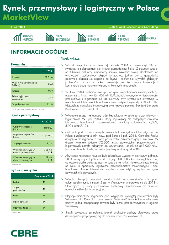 Rynek przemysłowy i logistyczny w Polsce MarketView CBRE Global Research and Consulting I poł. 2014 AKTYWNOŚĆ NAJEMCÓW STOPA PUSTOSTANÓW OBIEKTY UKOŃCZONE OBIEKTY W BUDOWIE ABSORPCJA INFORMACJE OGÓLNE Trendy rynkowe Ekonomia H1 2014 Ludność 38,5 mln Wzrost PKB (prognoza na 2014 r.) 3,6% Inflacja 0,3% Referencyjna stopa procentowa 2,5% Stopa bezrobocia 12,5% Źródło: GUS, NBP, Oxford Economics, H1 2014 Rynek przemysłowy H1 2014 Obiekty ukończone (mkw.) 340.000 Aktywność najemców (mkw.) 1.154.000 Stopa pustostanów 9,1% Wolumen inwestycji w nieruch. przemysłowe 308 mln EUR Wolumen inwestycji w nieruch. komercyjne 1.309 mln EUR Źródło: CBRE Sytuacja na rynku Wzrost gospodarczy w pierwszej połowie 2014 r. przekroczył 3%, co świadczy o polepszającej się sytuacji gospodarczej Polski. Z powodu sytuacji na Ukrainie niektórzy eksporterzy musieli zawiesić swoją działalność na wschodzie i zorientować eksport na zachód, jednak polska gospodarka ponownie okazała się odporna na kryzys i konflikt nie wywołał głębszych problemów na polskim rynku. Przewiduje się, że rosnące inwestycje i konsumpcja będą motorami wzrostu w kolejnych miesiącach. W II kw. 2014 wolumen inwestycji na rynku nieruchomości komercyjnych był niższy niż w I kw. i wyniósł 409 mln EUR. Jednak inwestycje w nieruchomości przemysłowe i logistyczne po raz pierwszy były wyższe niż inwestycje w nieruchomości biurowe i handlowe razem wzięte i wyniosły 218 mln EUR. Największą transakcją inwestycyjną było nabycie portfolio Standard Life przez Blackstone za 118 mln EUR. Występuje presja na obniżkę stóp kapitalizacji w sektorze przemysłowym i logistycznym. W I poł. 2014 r. stopy kapitalizacji dla najlepszych obiektów biurowych, handlowych i przemysłowych wyniosły odpowiednio 6,00%, 5,90% oraz 7,10%. Całkowita podaż nowoczesnych powierzchni przemysłowych i logistycznych w Polsce przekroczyła 8 mln mkw. pod koniec I poł. 2014. Centralna Polska dołączyła do regionów z ilością powierzchni przekraczającą 1 mln mkw. W drugim kwartale jedynie 72.000 mkw. powierzchni przemysłowych i logistycznych zostało oddanych do użytkowania, jednak aż 853.000 mkw. jest obecnie w budowie, co jest najwyższą wartością od 2008 r. Aktywność najemców również była rekordowo wysoka w pierwszym półroczu 2014 (wyłączając II półrocze 2013 gdy 300.000 mkw. wynajął Amazon), co odzwierciedla polepszającą się sytuację na rynku. Najaktywniejsze branże na rynku to operatorzy logistyczni, przedsiębiorstwa motoryzacyjne i sieci handlowe. Handel internetowy wywiera coraz większy wpływ na rynek powierzchni logistycznych. Prognoza na 2014 1 Podaż Stopa pustostanów Popyt Stawki czynszu Stopy kapitalizacji Źródło: CBRE Wysoka absorpcja przyczynia się do obniżki stóp pustostanów – 2 pp na całym polskim rynku i nawet 5 pp w Warszawie w porównaniu do 2013 r. Obniżające się stopy pustostanów zachęcają deweloperów do szukania nowych możliwości inwestycyjnych. Najpopularniejszymi regionami pod względem wynajętej powierzchni były Warszawa II, Górny Śląsk oraz Poznań. Większość transakcji stanowiły nowe umowy, jednak renegocjacje również były liczne, przede wszystkim w regionie Warszawy. Stawki czynszowe są stabilne, jednak atrakcyjne zachęty oferowane przez deweloperów przyczyniają się do obniżek czynszów efektywnych. H1 2014 Rynek przemysłowy i logistyczny w Polsce | MarketView RYNEK PRZEMYSŁOWY I LOGISTYCZNY NAJWIĘKSZE TRANSAKCJE NAJMU W H1 OBIEKTY UKOŃCZONE (TYS. MKW.) Wschód 600 Kraków 500 Najemca Region Carrefour Górny Śląsk Szczecin 400 Północ 300 Centralna Polska Górny Śląsk 200 Poznań Wrocław 100 Warszawa II 0 2010 2011 2012 2013 Warszawa I 2014H1 STAWKI CZYNSZU (EUR/mkw./msc.) Efektywne Typ Distribution Park Będzin 45 800 Odnowienie Goodman Konin 40 000 BTS Procter & Gamble Warszawa II Prologis Park Sochaczew 40 000 Odnowienie Viva Manufacturing Warszawa II Prologis Park Teresin 34 000 Odnowienie CLIP 30 800 Nowa transakcja 20 600 Nowa transakcja 19 000 Nowa transakcja Rhenus Poznań Hi Logistics Wrocław Geodis Wrocław Prologis Park Wrocław V Distribution Park Wrocław Wrocław 2 500 Warszawa I 2 000 Warszawa I Umowne Mkw. AKTYWNOŚĆ NAJEMCÓW (TYS. MKW.) Prognoza na 2014 H1 2014 Sieć spożywcza Centralna Polska Budynek 4,20 – 5,00 3,55 – 4,50 Warszawa II Szczecin 1 500 Górny Śląsk 1 000 Poznań Północ 500 Polska regionalna Kraków Umowne 3,00 – 3,90 Efektywne 2,50 – 3,50 POWIERZCHNIA W BUDOWIE (TYS. MKW.) 0 Wschód Centralna Polska POWIERZCHNIA ISTNIEJĄCA (TYS. MKW.) 10000 8000 6000 4000 2000 0 1000 800 600 400 200 0 NAJWIEKSZE OBIEKTY W BUDOWIE W H1 2014 2 Goodman Wrocław South Logistics Centre (Amazon) 123.500 mkw. Panattoni BTS Amazon Poznań 100.600 mkw. H1 2014 Rynek przemysłowy i logistyczny w Polsce | MarketView RYNEK PRZEMYSŁOWY I LOGISTYCZNY Szczecin Północ Poznań Warszawa I&II Centralna Polska Wrocław Wschód Górny Śląsk Kraków Powierzchnia istniejąca 3 Powierzchnia w budowie Warszawa I Warszawa II Wrocław Poznań Górny Śląsk Centralna Polska Północ Szczecin Kraków Wschód Polska Podaż 636 500 2 191 800 920 500 993 600 1 517 900 1 068 400 338 800 62 100 201 500 130 100 8 061 200 Powierzchnia planowana 778 000 3 378 500 2 003 200 1 817 400 1 973 700 1 624 200 1 035 400 169 600 297 000 234 900 13 312 100 Pustostany 15% 11% 6% 2% 8% 12% 11% 0% 1% 16% 9% W budowie 8 200 14 000 314 600 316 100 56 600 59 300 48 500 25 200 11 000 0 853 500 Popyt 66 200 202 100 75 700 130 300 77 200 31 100 43 900 8 400 9 500 17 800 662 300 Czynsze umowne (€/mkw./msc.) 4,2 – 5,0 2,6 – 3,6 3,0 – 3,9 3,0 – 3,4 2,9 – 3,4 2,6 – 3,6 2,5 – 3,5 3,1 – 3,9 3,6 – 5,0 3,5 – 4,2 3,0 – 3,9 H1 2014 Rynek przemysłowy i logistyczny w Polsce | MarketView DEFINICJE Podaż powierzchni magazynowej to całkowity zasób nowoczesnej powierzchni magazynowej na danym obszarze, wybudowanej