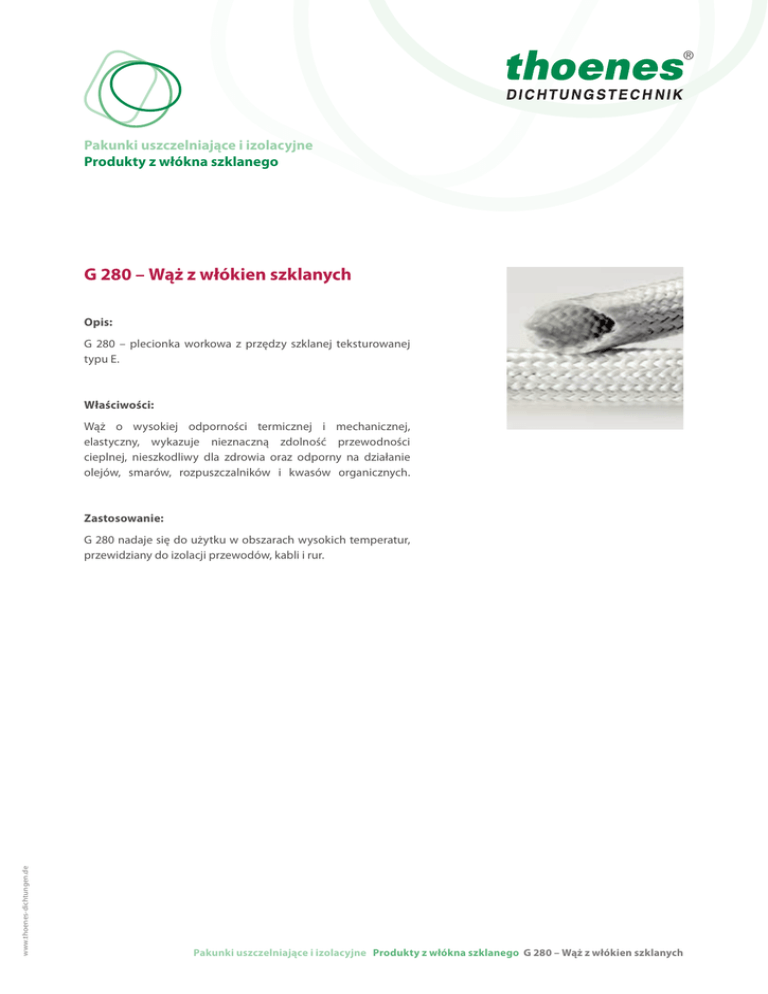 ® Pakunki uszczelniające i izolacyjne Produkty z włókna szklanego G 280 – Wąż z włókien szklanych Opis: G 280 – plecionka workowa z przędzy szklanej teksturowanej typu E. Właściwości: Wąż o wysokiej odporności termicznej i mechanicznej, elastyczny, wykazuje nieznaczną zdolność przewodności cieplnej, nieszkodliwy dla zdrowia oraz odporny na działanie olejów, smarów, rozpuszczalników i kwasów organicznych. Zastosowanie: www.thoenes-dichtungen.de G 280 nadaje się do użytku w obszarach wysokich temperatur, przewidziany do izolacji przewodów, kabli i rur. Pakunki uszczelniające i izolacyjne Produkty z włókna szklanego G 280 – Wąż z włókien szklanych Pakunki uszczelniające i izolacyjne Produkty z włókna szklanego Rodzaj: Artykuł Nazwa Materiał Wykonanie Wymiary G 280 (1770) Wąż z włókien szklanych szkło typu E wąż, grub. ścianki 1-2 mm 2 – 40 mm T (°C) 550 Ilość w opakowaniu: Wymiary (mm) 2–3 4 5 – 12 13 – 16 17 – 20 21 – 35 36 – 40 Jednostka opakowaniowa (m) 200 150 100 50 50 25 20 W przypadku pytań odnośnie pozostałych ilości opakowaniowych prosimy o kontakt. Masa metra bieżącego: indywidualna, w zależności od wykonania Tolerancje: Wymiary (mm) 3 – 10 11 – 20 21 – 50 Tolerancje (%) +/- 10 +/- 8 +/-7 www.thoenes-dichtungen.de Wymienione tu dane odzwierciedlają aktualny stan naszej wiedzy na temat poszczególnych produktów i zostały ustalone zgodnie z naszą najlepszą wiedzą i przekonaniem. Dane te nie mogą stanowić podstawy do wnoszenia roszczeń gwarancyjnych. W tym momecie tracą swą ważność wszystkie wydane dotychczas opracowania. Pakunki uszczelniające i izolacyjne Produkty z włókna szklanego G 280 – Wąż z włókien szklanych