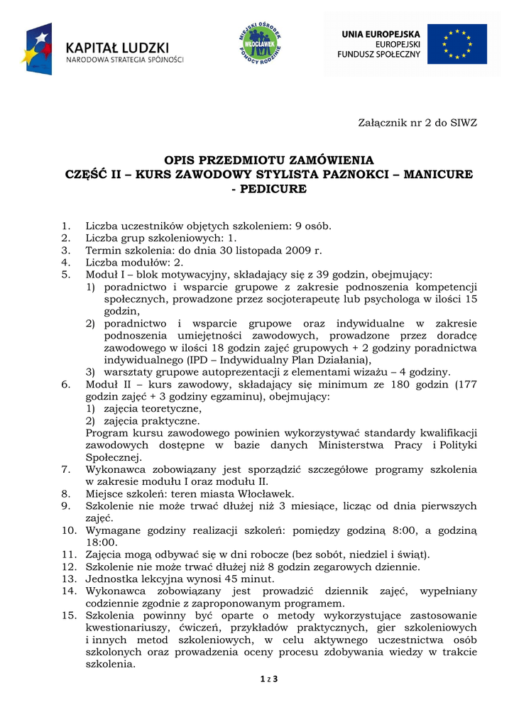 Załącznik nr 2 do SIWZ OPIS PRZEDMIOTU ZAMÓWIENIA CZĘŚĆ II – KURS ZAWODOWY STYLISTA PAZNOKCI – MANICURE - PEDICURE 1. 2. 3. 4. 5. 6. 7. 8. 9. 10. 11. 12. 13. 14. 15. Liczba uczestników objętych szkoleniem: 9 osób. Liczba grup szkoleniowych: 1. Termin szkolenia: do dnia 30 listopada 2009 r. Liczba modułów: 2. Moduł I – blok motywacyjny, składający się z 39 godzin, obejmujący: 1) poradnictwo i wsparcie grupowe z zakresie podnoszenia kompetencji społecznych, prowadzone przez socjoterapeutę lub psychologa w ilości 15 godzin, 2) poradnictwo i wsparcie grupowe oraz indywidualne w zakresie podnoszenia umiejętności zawodowych, prowadzone przez doradcę zawodowego w ilości 18 godzin zajęć grupowych + 2 godziny poradnictwa indywidualnego (IPD – Indywidualny Plan Działania), 3) warsztaty grupowe autoprezentacji z elementami wizażu – 4 godziny. Moduł II – kurs zawodowy, składający się minimum ze 180 godzin (177 godzin zajęć + 3 godziny egzaminu), obejmujący: 1) zajęcia teoretyczne, 2) zajęcia praktyczne. Program kursu zawodowego powinien wykorzystywać standardy kwalifikacji zawodowych dostępne w bazie danych Ministerstwa Pracy i Polityki Społecznej. Wykonawca zobowiązany jest sporządzić szczegółowe programy szkolenia w zakresie modułu I oraz modułu II. Miejsce szkoleń: teren miasta Włocławek. Szkolenie nie może trwać dłużej niż 3 miesiące, licząc od dnia pierwszych zajęć. Wymagane godziny realizacji szkoleń: pomiędzy godziną 8:00, a godziną 18:00. Zajęcia mogą odbywać się w dni robocze (bez sobót, niedziel i świąt). Szkolenie nie może trwać dłużej niż 8 godzin zegarowych dziennie. Jednostka lekcyjna wynosi 45 minut. Wykonawca zobowiązany jest prowadzić dziennik zajęć, wypełniany codziennie zgodnie z zaproponowanym programem. Szkolenia powinny być oparte o metody wykorzystujące zastosowanie kwestionariuszy, ćwiczeń, przykładów praktycznych, gier szkoleniowych i innych metod szkoleniowych, w celu aktywnego uczestnictwa osób szkolonych oraz prowadzenia oceny procesu zdobywania wiedzy w trakcie szkolenia. 1z3 16. Wykonawca zobowiązany jest wyznaczyć osobę sprawującą nadzór wewnętrzny nad przebiegiem szkolenia, mający na celu podnoszenie jakości prowadzonego szkolenia. 17. Wykonawca zapewnia catering dla uczestników szkolenia, obejmujący między innymi przygotowanie poczęstunku w formie ciepłego drugiego dania każdego dnia oraz stałego dostępu do zimnych napojów, kawy i herbaty. 18. Program szkoleń na dany dzień musi uwzględniać przerwę na posiłek, o którym mowa w pkt 17. 19. Wykonawca zapewni (umieszczając w kosztach szkolenia) materiały niezbędne do realizacji kursu, w tym: ubrania robocze wymagane dla stylisty paznokci, skrypty książki, a także dla każdego uczestnika materiały piśmiennicze (np. zeszyt, długopis). 20. Wykonawca zobowiązany jest do zapewnienia warunków szkolenia zgodnie z przepisami bezpieczeństwa i higieny pracy w trakcie szkolenia. 21. Wykonawca zobowiązany jest do sfinansowania kosztów ubezpieczenia NNW uczestników szkolenia oraz badań lekarskich dopuszczających do wykonywania zawodu stylisty paznokci. 22. Wykonawca zobowiązany jest do przeprowadzenia ankiety wśród uczestników szkolenia na początku oraz po jego zakończeniu, zgodnie z kwestionariuszem ankiety dostarczonym przez zamawiającego. Ankieta zostanie dostarczona wykonawcy, którego oferta zostanie uznana za najkorzystniejszą przed podpisaniem umowy. 23. Wykonawca na bieżąco będzie informował zamawiającego imiennie o nieobecności na szkoleniu osób skierowanych przez zamawiającego, nie zgłoszeniu się tych osób na szkolenie lub też rezygnacji z uczestnictwa w szkoleniu w trakcie jego trwania – pod rygorem odmowy przez zamawiającego zapłaty za szkolenie tych osób. 24. Wykonawca przedkłada zamawiającemu listy obecności za poszczególne dni szkolenia, co dziennie. 25. W przypadku skierowania mniejszej ilości osób na szkolenie i braku możliwości przyjęcia nowej osoby do uzupełnienia, Wykonawca zobowiązuje się zweryfikować preliminarz kosztów szkolenia stosownie do ilości osób uczestniczących w szkoleniu i przesłać go wykonawcy. 26. Wykonawca zobowiązany jest do promowania projektu, poprzez oznaczenie wszelkiej dokumentacji logotypami projektu. 27. Zamawiający dostarczy materiały do oznakowania pomieszczeń promujące realizowany projekt. 28. Po zakończeniu cyklu szkoleń wykonawca obligatoryjnie musi dostarczyć zamawiającemu: 1) potwierdzenie odbioru materiałów szkoleniowych przez uczestników kursu, 2) kopię protokołu egzaminacyjnego z wyszczególnieniem osób, które nie przystąpiły do egzaminu, nie zdały egzaminu, i które egzamin zdały, 3) kserokopie zaświadczeń lub innych dokumentów potwierdzających ukończenie szkolenia, 4) imiennego wykazu osób, które nie ukończyły cyklu szkoleń, 5) ankiety, o których mowa w pkt 22. 29. Wykonawca zobowiązany jest wydać uczestnikom szkolenia zaświadczenia zgodnie ze wzorem stanowiącym załącznik nr 3 do rozporządzenia Ministra Edukacji i Nauki z dnia 3 lutego 2006 r. (Dz.U. Nr 31, poz. 216) lub 2z3 zaświadczeń wymaganych innymi przepisami prawa, zaświadczenia o ukończeniu bloku motywacyjnego i doradztwa zawodowego oraz stosowny certyfikat uczestnictwa w szkoleniach z informacją o sposobie finansowania szkolenia (projekt współfinansowany przez Unię Europejską w ramach Europejskiego Funduszu Społecznego). 3z3