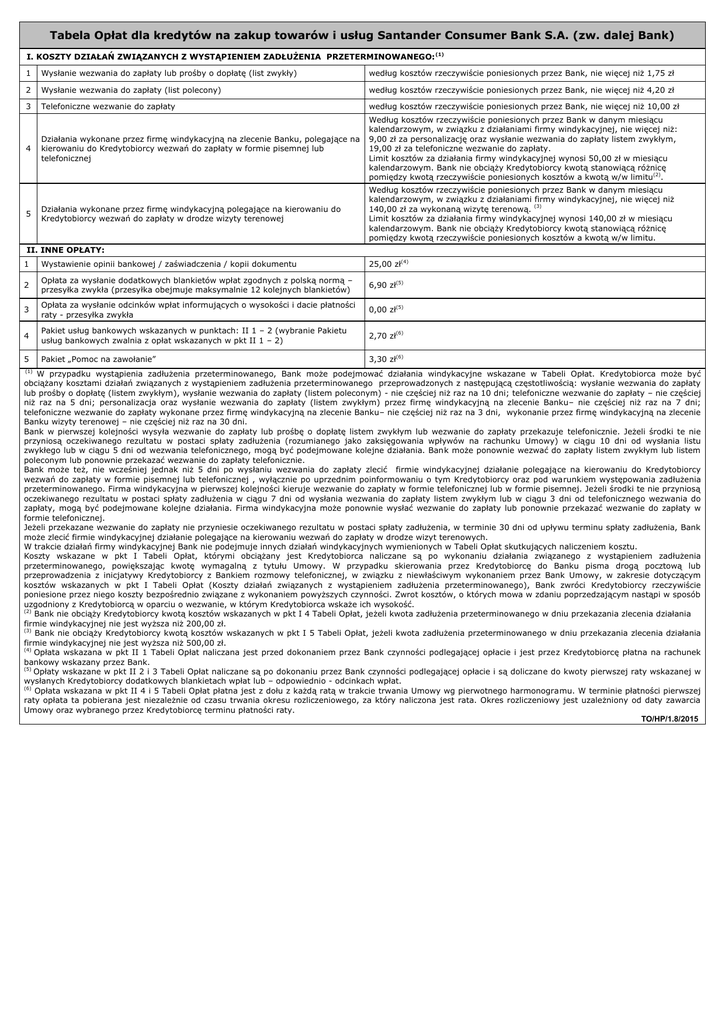 Tabela Opłat dla kredytów na zakup towarów i usług Santander Consumer Bank S.A. (zw. dalej Bank) I. KOSZTY DZIAŁAŃ ZWIĄZANYCH Z WYSTĄPIENIEM ZADŁUŻENIA PRZETERMINOWANEGO: (1) 1 Wysłanie wezwania do zapłaty lub prośby o dopłatę (list zwykły) według kosztów rzeczywiście poniesionych przez Bank, nie więcej niż 1,75 zł 2 Wysłanie wezwania do zapłaty (list polecony) według kosztów rzeczywiście poniesionych przez Bank, nie więcej niż 4,20 zł 3 Telefoniczne wezwanie do zapłaty według kosztów rzeczywiście poniesionych przez Bank, nie więcej niż 10,00 zł Działania wykonane przez firmę windykacyjną na zlecenie Banku, polegające na kierowaniu do Kredytobiorcy wezwań do zapłaty w formie pisemnej lub telefonicznej Według kosztów rzeczywiście poniesionych przez Bank w danym miesiącu kalendarzowym, w związku z działaniami firmy windykacyjnej, nie więcej niż: 9,00 zł za personalizację oraz wysłanie wezwania do zapłaty listem zwykłym, 19,00 zł za telefoniczne wezwanie do zapłaty. Limit kosztów za działania firmy windykacyjnej wynosi 50,00 zł w miesiącu kalendarzowym. Bank nie obciąży Kredytobiorcy kwotą stanowiącą różnicę pomiędzy kwotą rzeczywiście poniesionych kosztów a kwotą w/w limitu(2). Działania wykonane przez firmę windykacyjną polegające na kierowaniu do Kredytobiorcy wezwań do zapłaty w drodze wizyty terenowej Według kosztów rzeczywiście poniesionych przez Bank w danym miesiącu kalendarzowym, w związku z działaniami firmy windykacyjnej, nie więcej niż 140,00 zł za wykonaną wizytę terenową. (3) Limit kosztów za działania firmy windykacyjnej wynosi 140,00 zł w miesiącu kalendarzowym. Bank nie obciąży Kredytobiorcy kwotą stanowiącą różnicę pomiędzy kwotą rzeczywiście poniesionych kosztów a kwotą w/w limitu. 4 5 II. INNE OPŁATY: 1 Wystawienie opinii bankowej / zaświadczenia / kopii dokumentu 25,00 zł(4) 2 Opłata za wysłanie dodatkowych blankietów wpłat zgodnych z polską normą – przesyłka zwykła (przesyłka obejmuje maksymalnie 12 kolejnych blankietów) 6,90 zł(5) 3 Opłata za wysłanie odcinków wpłat informujących o wysokości i dacie płatności raty - przesyłka zwykła 0,00 zł(5) 4 Pakiet usług bankowych wskazanych w punktach: II 1 – 2 (wybranie Pakietu usług bankowych zwalnia z opłat wskazanych w pkt II 1 – 2) 2,70 zł(6) 5 Pakiet „Pomoc na zawołanie” 3,30 zł(6) (1) W przypadku wystąpienia zadłużenia przeterminowanego, Bank może podejmować działania windykacyjne wskazane w Tabeli Opłat. Kredytobiorca może być obciążany kosztami działań związanych z wystąpieniem zadłużenia przeterminowanego przeprowadzonych z następującą częstotliwością: wysłanie wezwania do zapłaty lub prośby o dopłatę (listem zwykłym), wysłanie wezwania do zapłaty (listem poleconym) - nie częściej niż raz na 10 dni; telefoniczne wezwanie do zapłaty – nie częściej niż raz na 5 dni; personalizacja oraz wysłanie wezwania do zapłaty (listem zwykłym) przez firmę windykacyjną na zlecenie Banku– nie częściej niż raz na 7 dni; telefoniczne wezwanie do zapłaty wykonane przez firmę windykacyjną na zlecenie Banku– nie częściej niż raz na 3 dni, wykonanie przez firmę windykacyjną na zlecenie Banku wizyty terenowej – nie częściej niż raz na 30 dni. Bank w pierwszej kolejności wysyła wezwanie do zapłaty lub prośbę o dopłatę listem zwykłym lub wezwanie do zapłaty przekazuje telefonicznie. Jeżeli środki te nie przyniosą oczekiwanego rezultatu w postaci spłaty zadłużenia (rozumianego jako zaksięgowania wpływów na rachunku Umowy) w ciągu 10 dni od wysłania listu zwykłego lub w ciągu 5 dni od wezwania telefonicznego, mogą być podejmowane kolejne działania. Bank może ponownie wezwać do zapłaty listem zwykłym lub listem poleconym lub ponownie przekazać wezwanie do zapłaty telefonicznie. Bank może też, nie wcześniej jednak niż 5 dni po wysłaniu wezwania do zapłaty zlecić firmie windykacyjnej działanie polegające na kierowaniu do Kredytobiorcy wezwań do zapłaty w formie pisemnej lub telefonicznej , wyłącznie po uprzednim poinformowaniu o tym Kredytobiorcy oraz pod warunkiem występowania zadłużenia przeterminowanego. Firma windykacyjna w pierwszej kolejności kieruje wezwanie do zapłaty w formie telefonicznej lub w formie pisemnej. Jeżeli środki te nie przyniosą oczekiwanego rezultatu w postaci spłaty zadłużenia w ciągu 7 dni od wysłania wezwania do zapłaty listem zwykłym lub w ciągu 3 dni od telefonicznego wezwania do zapłaty, mogą być podejmowane kolejne działania. Firma windykacyjna może ponownie wysłać wezwanie do zapłaty lub ponownie przekazać wezwanie do zapłaty w formie telefonicznej. Jeżeli przekazane wezwanie do zapłaty nie przyniesie oczekiwanego rezultatu w postaci spłaty zadłużenia, w terminie 30 dni od upływu terminu spłaty zadłużenia, Bank może zlecić firmie windykacyjnej działanie polegające na kierowaniu wezwań do zapłaty w drodze wizyt terenowych. W trakcie działań firmy windykacyjnej Bank nie podejmuje innych działań windykacyjnych wymienionych w Tabeli Opłat skutkujących naliczeniem kosztu. Koszty wskazane w pkt I Tabeli Opłat, którymi obciążany jest Kredytobiorca naliczane są po wykonaniu działania związanego z wystąpieniem zadłużenia przeterminowanego, powiększając kwotę wymagalną z tytułu Umowy. W przypadku skierowania przez Kredytobiorcę do Banku pisma drogą pocztową lub przeprowadzenia z inicjatywy Kredytobiorcy z Bankiem rozmowy telefonicznej, w związku z niewłaściwym wykonaniem przez Bank Umowy, w zakresie dotyczącym kosztów wskazanych w pkt I Tabeli Opłat (Koszty działań związanych z wystąpieniem zadłużenia przeterminowanego), Bank zwróci Kredytobiorcy rzeczywiście poniesione przez niego koszty bezpośrednio związane z wykonaniem powyższych czynności. Zwrot kosztów, o których mowa w zdaniu poprzed