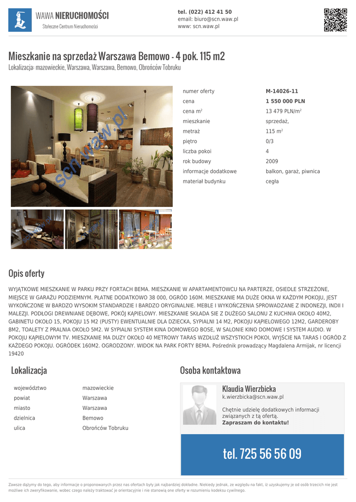 tel. (022) 412 41 50 email: [email protected] www: scn.waw.pl Mieszkanie na sprzedaż Warszawa Bemowo - 4 pok. 115 m2 Lokalizacja: mazowieckie, Warszawa, Warszawa, Bemowo, Obrońców Tobruku numer oferty M-14026-11 cena 1 550 000 PLN cena m 13 479 PLN/m2 mieszkanie sprzedaż, metraż 115 m2 piętro 0/3 liczba pokoi 4 rok budowy 2009 informacje dodatkowe balkon, garaż, piwnica materiał budynku cegła 2 Opis oferty WYJĄTKOWE MIESZKANIE W PARKU PRZY FORTACH BEMA. MIESZKANIE W APARTAMENTOWCU NA PARTERZE, OSIEDLE STRZEŻONE, MIEJSCE W GARAŻU PODZIEMNYM. PŁATNE DODATKOWO 38 000, OGRÓD 160M. MIESZKANIE MA DUŻE OKNA W KAŻDYM POKOJU, JEST WYKOŃCZONE W BARDZO WYSOKIM STANDARDZIE I BARDZO ORYGINALNIE. MEBLE I WYKOŃCZENIA SPROWADZANE Z INDONEZJI, INDII I MALEZJI. PODŁOGI DREWNIANE DĘBOWE, POKÓJ KĄPIELOWY. MIESZKANIE SKŁADA SIE Z DUŻEGO SALONU Z KUCHNIA OKOŁO 40M2, GABINETU OKOŁO 15, POKOJU 15 M2 (PUSTY) EWENTUALNIE DLA DZIECKA, SYPIALNI 14 M2, POKOJU KĄPIELOWEGO 12M2, GARDEROBY 8M2, TOALETY Z PRALNIA OKOŁO 5M2. W SYPIALNI SYSTEM KINA DOMOWEGO BOSE, W SALONIE KINO DOMOWE I SYSTEM AUDIO. W POKOJU KĄPIELOWYM TV. MIESZKANIE MA DUZY OKOŁO 40 METROWY TARAS WZDŁUŻ WSZYSTKICH POKOI, WYJŚCIE NA TARAS I OGRÓD Z KAŻDEGO POKOJU. OGRÓDEK 160M2. OGRODZONY. WIDOK NA PARK FORTY BEMA. Pośrednik prowadzący Magdalena Armijak, nr licencji 19420 Lokalizacja Osoba kontaktowa Klaudia Wierzbicka województwo mazowieckie powiat Warszawa [email protected] miasto Warszawa dzielnica Bemowo ulica Obrońców Tobruku Chętnie udzielę dodatkowych informacji związanych z tą ofertą. Zapraszam do kontaktu! tel. 725 56 56 09 Zawsze dążymy do tego, aby informacje o proponowanych przez nas ofertach były jak najbardziej dokładne. Niekiedy jednak, ze względu na fakt, iż uzyskujemy je od osób trzecich nie jest możliwe ich zweryfikowanie, wobec czego należy traktować je orientacyjnie i nie stanowią one oferty w rozumieniu kodeksu cywilnego.