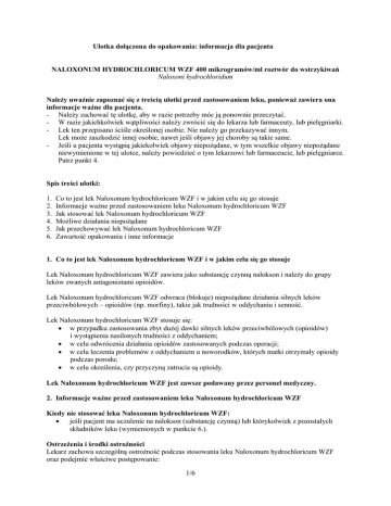 Ulotka dołączona do opakowania: informacja dla pacjenta NALOXONUM HYDROCHLORICUM WZF 400 mikrogramów/ml roztwór do wstrzykiwań Naloxoni hydrochloridum Należy uważnie zapoznać się z treścią ulotki przed zastosowaniem leku, ponieważ zawiera ona informacje ważne dla pacjenta. - Należy zachować tę ulotkę, aby w razie potrzeby móc ją ponownie przeczytać. - W razie jakichkolwiek wątpliwości należy zwrócić się do lekarza lub farmaceuty, lub pielęgniarki. - Lek ten przepisano ściśle określonej osobie. Nie należy go przekazywać innym. Lek może zaszkodzić innej osobie, nawet jeśli objawy jej choroby są takie same. - Jeśli u pacjenta wystąpią jakiekolwiek objawy niepożądane, w tym wszelkie objawy niepożądane niewymienione w tej ulotce, należy powiedzieć o tym lekarzowi lub farmaceucie, lub pielęgniarce. Patrz punkt 4. Spis treści ulotki: 1. 2. 3. 4. 5. 6. Co to jest lek Naloxonum hydrochloricum WZF i w jakim celu się go stosuje Informacje ważne przed zastosowaniem leku Naloxonum hydrochloricum WZF Jak stosować lek Naloxonum hydrochloricum WZF Możliwe działania niepożądane Jak przechowywać lek Naloxonum hydrochloricum WZF Zawartość opakowania i inne informacje 1. Co to jest lek Naloxonum hydrochloricum WZF i w jakim celu się go stosuje Lek Naloxonum hydrochloricum WZF zawiera jako substancję czynną nalokson i należy do grupy leków zwanych antagonistami opioidów. Lek Naloxonum hydrochloricum WZF odwraca (blokuje) niepożądane działania silnych leków przeciwbólowych – opioidów (np. morfiny), takie jak trudności w oddychaniu i senność. Lek Naloxonum hydrochloricum WZF stosuje się: w przypadku zastosowania zbyt dużej dawki silnych leków przeciwbólowych (opioidów) i wystąpienia nasilonych trudności z oddychaniem; w celu odwrócenia działania opioidów zastosowanych podczas operacji; w celu leczenia problemów z oddychaniem u noworodków, których matki otrzymały opioidy podczas porodu; w celu określenia, czy przyczyną zatrucia są opioidy. Lek Naloxonum hydrochloricum WZF jest zawsze podawany przez personel medyczny. 2. Informacje ważne przed zastosowaniem leku Naloxonum hydrochloricum WZF Kiedy nie stosować leku Naloxonum hydrochloricum WZF: jeśli pacjent ma uczulenie na nalokson (substancję czynną) lub którykolwiek z pozostałych składników leku (wymienionych w punkcie 6.). Ostrzeżenia i środki ostrożności Lekarz zachowa szczególną ostrożność podczas stosowania leku Naloxonum hydrochloricum WZF oraz podejmie właściwe postępowanie: 1/6 jeśli pacjent przyjął zbyt dużą dawkę opioidów lub jest uzależniony od opioidów; jeśli pacjent choruje na serce lub ma choroby układu krążenia (występuje u niego, np.: nieregularne bicie serca, podwyższone ciśnienie krwi lub kłopoty z oddychaniem); jeśli pacjent stosował silny lek przeciwbólowy – buprenorfinę lub pentazocynę, ponieważ skuteczność naloksonu w tym przypadku jest ograniczona; jeśli po zastosowaniu leku Naloxonum hydrochloricum WZF wystąpią trudności z oddychaniem, które wynikają z tego, że czas działania naloksonu jest krótszy niż opioidów; jeśli działanie opioidów jest nagle odwracane po operacji – mogą wystąpić takie objawy jak nudności, wymioty, drżenia, przyspieszone bicie serca (patrz punkt 4. ulotki: „Możliwe działania niepożądane”); jeśli pacjent ma poważne problemy z wątrobą lub nerkami. Naloxonum hydrochloricum WZF a inne leki Należy powiedzieć lekarzowi o wszystkich lekach przyjmowanych przez pacjenta obecnie lub ostatnio, a także o lekach, które pacjent planuje stosować. Pacjent powinien poinformować lekarza, jeśli stosował lub stosuje silnie działające leki przeciwbólowe (np. morfinę, kodeinę, buprenorfinę), lub jeśli jest uzależniony od leków (dotyczy to również pacjentek w ciąży). Nagłe i całkowite odwrócenie działania opioidów poprzez podanie naloksonu może spowodować wystąpienie objawów nazywanych zespołem odstawiennym (patrz punkt 4. ulotki: „Możliwe działania niepożądane”). Ciąża i karmienie piersią Jeśli pacjentka jest w ciąży lub karmi piersią, przypuszcza, że może być w ciąży, lub gdy planuje mieć dziecko, powinna poradzić się lekarza przed zastosowaniem tego leku. Należy powiedzieć lekarzowi, jeśli pacjentka: jest w ciąży; przypuszcza, że jest w ciąży; planuje ciążę; karmi piersią. O zastosowaniu leku Naloxonum hydrochloricum WZF decyduje lekarz. Nalokson może być stosowany u kobiet w ciąży tylko w przypadkach, gdy jego zastosowanie jest konieczne. Nalokson może być zastosowany w drugiej fazie porodu w celu odwrócenia trudności z oddychaniem, spowodowanych podaniem opioidów rodzącej. Prowadzenie pojazdów i obsługiwanie maszyn Nie wolno prowadzić pojazdów ani obsługiwać maszyn po zastosowaniu leku. Lek Naloxonum hydrochloricum WZF zawiera sód Lek zawiera 3,65 mmol (84,00 mg) sodu na maksymalną dobową dawkę 10 mg naloksonu chlorowodorku. Lekarz weźmie to pod uwagę u pacjentów kontrolujących zawartość sodu w diecie. 2/6 3. Jak stosować lek Naloxonum hydrochloricum WZF Naloxonum hydrochloricum WZF jest zawsze podawany przez personel medyczny. Lek może być podawany: dożylnie - wstrzykiwany bezpośrednio do żyły lub podawany w kroplówce; domięśniowo; podskórnie. Dawkę leku określa lekarz. Zastosowana dawka zależy od masy ciała, stanu pacjenta oraz rodzaju i ilości zastosowanego opioidu. Zastosowanie większej niż zalecana dawki leku Naloxonum hydrochloricum WZF Po zastosowaniu znacznie większej niż zalecana dawki naloksonu odnotowywano nudności, wymioty, dreszcze, przyspieszony, pogłębiony oddech, a u pacjentów po operacji może wystąpić zniesienie działania przeciwbólowego i pobudzenie. Nasilone objawy mogą wymagać intensywnej opieki medycznej. Lek jest podawany przez personel medyczny, dlatego jest mało prawdopodobne, aby pacjent otrzymał więcej leku niż pow