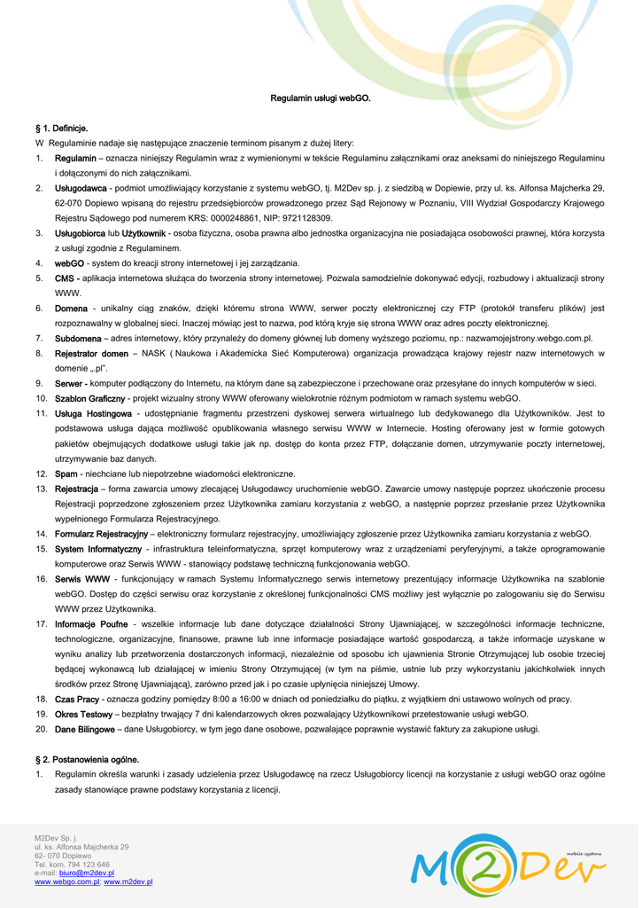 Regulamin usługi webGO. § 1. Definicje. W Regulaminie nadaje się następujące znaczenie terminom pisanym z dużej litery: 1. Regulamin – oznacza niniejszy Regulamin wraz z wymienionymi w tekście Regulaminu załącznikami oraz aneksami do niniejszego Regulaminu i dołączonymi do nich załącznikami. 2. Usługodawca - podmiot umożliwiający korzystanie z systemu webGO, tj. M2Dev sp. j. z siedzibą w Dopiewie, przy ul. ks. Alfonsa Majcherka 29, 62-070 Dopiewo wpisaną do rejestru przedsiębiorców prowadzonego przez Sąd Rejonowy w Poznaniu, VIII Wydział Gospodarczy Krajowego Rejestru Sądowego pod numerem KRS: 0000248861, NIP: 9721128309. 3. Usługobiorca lub Użytkownik - osoba fizyczna, osoba prawna albo jednostka organizacyjna nie posiadająca osobowości prawnej, która korzysta z usługi zgodnie z Regulaminem. 4. webGO - system do kreacji strony internetowej i jej zarządzania. 5. CMS - aplikacja internetowa służąca do tworzenia strony internetowej. Pozwala samodzielnie dokonywać edycji, rozbudowy i aktualizacji strony WWW. 6. Domena - unikalny ciąg znaków, dzięki któremu strona WWW, serwer poczty elektronicznej czy FTP (protokół transferu plików) jest rozpoznawalny w globalnej sieci. Inaczej mówiąc jest to nazwa, pod którą kryje się strona WWW oraz adres poczty elektronicznej. 7. Subdomena – adres internetowy, który przynależy do domeny głównej lub domeny wyższego poziomu, np.: nazwamojejstrony.webgo.com.pl. 8. Rejestrator domen – NASK ( Naukowa i Akademicka Sieć Komputerowa) organizacja prowadząca krajowy rejestr nazw internetowych w domenie „.pl”. 9. Serwer - komputer podłączony do Internetu, na którym dane są zabezpieczone i przechowane oraz przesyłane do innych komputerów w sieci. 10. Szablon Graficzny - projekt wizualny strony WWW oferowany wielokrotnie różnym podmiotom w ramach systemu webGO. 11. Usługa Hostingowa - udostępnianie fragmentu przestrzeni dyskowej serwera wirtualnego lub dedykowanego dla Użytkowników. Jest to podstawowa usługa dająca możliwość opublikowania własnego serwisu WWW w Internecie. Hosting oferowany jest w formie gotowych pakietów obejmujących dodatkowe usługi takie jak np. dostęp do konta przez FTP, dołączanie domen, utrzymywanie poczty internetowej, utrzymywanie baz danych. 12. Spam - niechciane lub niepotrzebne wiadomości elektroniczne. 13. Rejestracja – forma zawarcia umowy zlecającej Usługodawcy uruchomienie webGO. Zawarcie umowy następuje poprzez ukończenie procesu Rejestracji poprzedzone zgłoszeniem przez Użytkownika zamiaru korzystania z webGO, a następnie poprzez przesłanie przez Użytkownika wypełnionego Formularza Rejestracyjnego. 14. Formularz Rejestracyjny – elektroniczny formularz rejestracyjny, umożliwiający zgłoszenie przez Użytkownika zamiaru korzystania z webGO. 15. System Informatyczny - infrastruktura teleinformatyczna, sprzęt komputerowy wraz z urządzeniami peryferyjnymi, a także oprogramowanie komputerowe oraz Serwis WWW - stanowiący podstawę techniczną funkcjonowania webGO. 16. Serwis WWW - funkcjonujący w ramach Systemu Informatycznego serwis internetowy prezentujący informacje Użytkownika na szablonie webGO. Dostęp do części serwisu oraz korzystanie z określonej funkcjonalności CMS możliwy jest wyłącznie po zalogowaniu się do Serwisu WWW przez Użytkownika. 17. Informacje Poufne - wszelkie informacje lub dane dotyczące działalności Strony Ujawniającej, w szczególności informacje techniczne, technologiczne, organizacyjne, finansowe, prawne lub inne informacje posiadające wartość gospodarczą, a także informacje uzyskane w wyniku analizy lub przetworzenia dostarczonych informacji, niezależnie od sposobu ich ujawnienia Stronie Otrzymującej lub osobie trzeciej będącej wykonawcą lub działającej w imieniu Strony Otrzymującej (w tym na piśmie, ustnie lub przy wykorzystaniu jakichkolwiek innych środków przez Stronę Ujawniającą), zarówno przed jak i po czasie upłynięcia niniejszej Umowy. 18. Czas Pracy - oznacza godziny pomiędzy 8:00 a 16:00 w dniach od poniedziałku do piątku, z wyjątkiem dni ustawowo wolnych od pracy. 19. Okres Testowy – bezpłatny trwający 7 dni kalendarzowych okres pozwalający Użytkownikowi przetestowanie usługi webGO. 20. Dane Bilingowe – dane Usługobiorcy, w tym jego dane osobowe, pozwalające poprawnie wystawić faktury za zakupione usługi. § 2. Postanowienia ogólne. 1. Regulamin określa warunki i zasady udzielenia przez Usługodawcę na rzecz Usługobiorcy licencji na korzystanie z usługi webGO oraz ogólne zasady stanowiące prawne podstawy korzystania z licencji. M2Dev Sp. j. ul. ks. Alfonsa Majcherka 29 62- 070 Dopiewo Tel. kom. 794 123 646 e-mail: [email protected] www.webgo.com.pl; www.m2dev.pl 2. Regulamin zostaje udostępniony Użytkownikowi przed dokonaniem Rejestracji na stronie www.webgo.com.pl, a także w trakcie Rejestracji na Formularzu Rejestracyjnym oraz po wypełnieniu Formularza Rejestracyjnego Użytkownik otrzyma wraz z przesłanymi przez Usługodawcę danymi dostępowymi na wskazany w Formularzu Rejestracyjnym adres e-mail. 3. Użytkownik ma obowiązek zapoznać się nieodpłatnie z treścią Regulaminu przed ukończeniem Procesu Rejestracji i zakupu Licencji. 4. Użytkownik korzystający z usługi zobowiązany jest do przestrzegania wszystkich warunków i postanowień niniejszego Regulaminu. Wysłanie przez Użytkownika wypełnionego Formularza Rejestracyjnego na adres e-mail Usługodawcy jest równoznaczne z potwierdzeniem zapoznania się z treścią Regulaminu oraz akceptacją jego postanowień w całości i zobowiązaniem się do ich przestrzegania. 5. Regulamin chroniony jest przepisami ustawy z dnia 4 lutego 1994 r. o prawie autorskim i prawach pokrewnych (tekst jednolity Dz.U. 2000 nr 20 poz. 904 z późniejszymi zmianami) oraz wiążącymi Polskę umowami międzynarodowymi. Każdy może wydrukować, utrwalać oraz zwielokrotniać techniką cyfrow