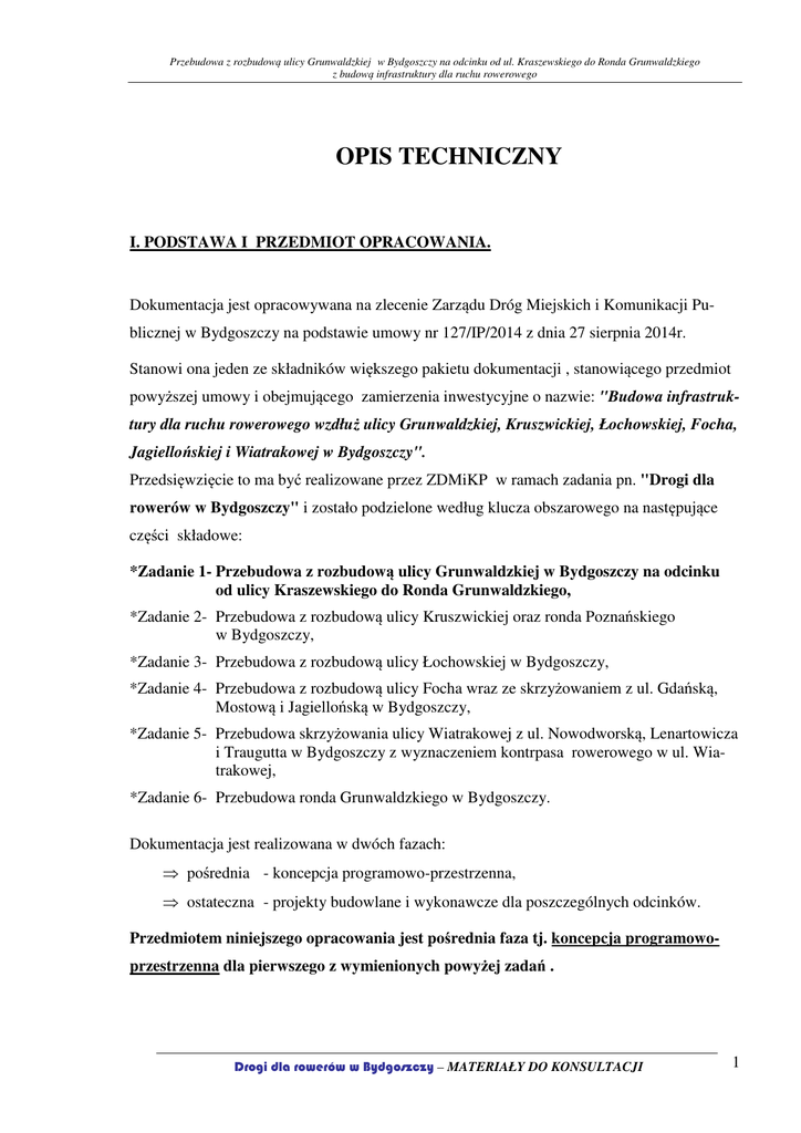 Przebudowa z rozbudową ulicy Grunwaldzkiej w Bydgoszczy na odcinku od ul. Kraszewskiego do Ronda Grunwaldzkiego z budową infrastruktury dla ruchu rowerowego OPIS TECHNICZNY I. PODSTAWA I PRZEDMIOT OPRACOWANIA. Dokumentacja jest opracowywana na zlecenie Zarządu Dróg Miejskich i Komunikacji Publicznej w Bydgoszczy na podstawie umowy nr 127/IP/2014 z dnia 27 sierpnia 2014r. Stanowi ona jeden ze składników większego pakietu dokumentacji , stanowiącego przedmiot powyższej umowy i obejmującego zamierzenia inwestycyjne o nazwie: "Budowa infrastruktury dla ruchu rowerowego wzdłuż ulicy Grunwaldzkiej, Kruszwickiej, Łochowskiej, Focha, Jagiellońskiej i Wiatrakowej w Bydgoszczy". Przedsięwzięcie to ma być realizowane przez ZDMiKP w ramach zadania pn. "Drogi dla rowerów w Bydgoszczy" i zostało podzielone według klucza obszarowego na następujące części składowe: *Zadanie 1- Przebudowa z rozbudową ulicy Grunwaldzkiej w Bydgoszczy na odcinku od ulicy Kraszewskiego do Ronda Grunwaldzkiego, *Zadanie 2- Przebudowa z rozbudową ulicy Kruszwickiej oraz ronda Poznańskiego w Bydgoszczy, *Zadanie 3- Przebudowa z rozbudową ulicy Łochowskiej w Bydgoszczy, *Zadanie 4- Przebudowa z rozbudową ulicy Focha wraz ze skrzyżowaniem z ul. Gdańską, Mostową i Jagiellońską w Bydgoszczy, *Zadanie 5- Przebudowa skrzyżowania ulicy Wiatrakowej z ul. Nowodworską, Lenartowicza i Traugutta w Bydgoszczy z wyznaczeniem kontrpasa rowerowego w ul. Wiatrakowej, *Zadanie 6- Przebudowa ronda Grunwaldzkiego w Bydgoszczy. Dokumentacja jest realizowana w dwóch fazach: ⇒ pośrednia - koncepcja programowo-przestrzenna, ⇒ ostateczna - projekty budowlane i wykonawcze dla poszczególnych odcinków. Przedmiotem niniejszego opracowania jest pośrednia faza tj. koncepcja programowoprzestrzenna dla pierwszego z wymienionych powyżej zadań . Drogi dla rowerów w Bydgoszczy – MATERIAŁY DO KONSULTACJI 1 Przebudowa z rozbudową ulicy Grunwaldzkiej w Bydgoszczy na odcinku od ul. Kraszewskiego do Ronda Grunwaldzkiego z budową infrastruktury dla ruchu rowerowego II. FORMALNE PODSTAWY INWESTYCJI. Planowana budowa dróg rowerowych ma być wykonywana w ramach Regionalnego Programu Operacyjnego Województwa Kujawsko - Pomorskiego. Ze względu na konieczność pozyskania gruntów prywatnych, Inwestor planuje iż całe zadanie będzie realizowane na mocy „Ustawy z dnia 10 kwietnia 2003 r o szczególnych zasadach przygotowania i realizacji inwestycji w zakresie dróg publicznych” oraz „Ustawy z dnia 25 lipca 2008r o zmianie ustawy o szczególnych zasadach przygotowania i realizacji inwestycji w zakresie dróg publicznych oraz o zmianie niektórych innych ustaw”. III. ROZWIĄZANIE PROJEKTOWE III.1. Rozwiązanie funkcjonalno-geometryczne. Projektem objęto odcinek o długości ok. 1 500 m od ulicy Kraszewskiego do ronda Grunwaldzkiego. Planowane roboty mieszczą się w pasie wyznaczonym przez obrzeżną linię zabudowy. Konieczne będą jednak lokalne regulacje terenowo-prawne, związane z przejęciem gruntów prywatnych na cele inwestycji drogowej. W opracowaniu wydzielono 3 odcinki. III.1.1. Odcinek ul. Grunwaldzkiej od ul. Kraszewskiego do wiaduktu (ul. Czarna Droga). Po północnej stronie pasa ulicznego na całej długości przewidziano budowę drogi rowerowej, zblokowanej z chodnikiem - każdy element o szerokości 2,0 m. Z zasady ścieżka zlokalizowana została od strony jezdni a chodnik od strony budynków – przeplot występuje jedynie po wschodniej stronie zatoki autobusowej , w rejonie posesji nr 116-118. Taki „odwrócony” układ został dowiązany do istniejących nawierzchni w rejonie wlotu ul. Młyńskiej. Na ogół oba ciągi byłyby rozdzielone marginesem o szerokości 0,5÷0,3 m. Wyjątek stanowi odcinek o długości ok. 170 m, usytuowany od posesji nr 102 do 118, gdzie udało się odsunąć ścieżkę od chodnika na odległość 1,8 m - pas ten zostanie wypełniony zielenią. Ciąg rowerowo-pieszy będzie oddzielony od jezdni pasem zieleni o szerokości 6÷7 m. Zachowana zostanie dotychczasowa lokalizacja zatok autobusowych i zjazdów do posesji. Po stronie południowej, począwszy od wlotu ul. Kraszewskiego, zaprojektowano drogę rowerową, stanowiącą przedłużenie ciągu, zbudowanego w ramach budowy Węzła Zachodniego. O ile jednak po zachodniej stronie ul. Kraszewskiego ścieżka jest zblokowana z chodDrogi dla rowerów w Bydgoszczy – MATERIAŁY DO KONSULTACJI 2 Przebudowa z rozbudową ulicy Grunwaldzkiej w Bydgoszczy na odcinku od ul. Kraszewskiego do Ronda Grunwaldzkiego z budową infrastruktury dla ruchu rowerowego nikiem o tyle w części objętej niniejszą koncepcją zaproponowano wydzielenie samodzielnej drogi rowerowej. Ma ona być usytuowana w obecnym pasie zieleni, oddzielającym jezdnię główną ulicy Grunwaldzkiej od istniejącej drogi serwisowej. Na planie sytuacyjnym wskazano też lokalizację nowej stacji przystankowej dla rowerów ( w rejonie posesji nr 135 i 137). Projektowana ścieżka na całej długości ma mieć szerokość 2,0 m i byłaby oddzielona od jezdni głównej pasem zieleni o zmiennej szerokości od 2,9 m ÷ 6,8 m . Zaprojektowano ją w taki sposób, aby zachować możliwość przyszłej przebudowy drogi serwisowej i wykonania wzdłuż niej stanowisk postojowych. Na obecnym etapie piesi oraz kierowcy samochodów korzystaliby z jezdni serwisowej na dotychczasowych zasadach. Projektowana droga rowerowa łączyłaby się z chodnikiem dopiero przed nasypem kolejowym. Taki zblokowany odcinek byłby dowiązany do ul. Czarna Droga. Uwaga! Budowa nowej ścieżki rowerowej będzie wymagała przestawienia dwóch słupów oświetleniowych oraz wiaty przystankowej przy zatoce autobusowej za ulicą Kraszewskiego. Ponadto po stronie wschodniej (pomiędzy posesją nr 84 a wiaduktem) przewiduje się zaadaptowanie rozwiązania, przygotowanego w ramach odrębnego projektu, związanego z budową nowego obiektu handlowego. Zgodnie z tym opracowaniem, jezdnia będzie