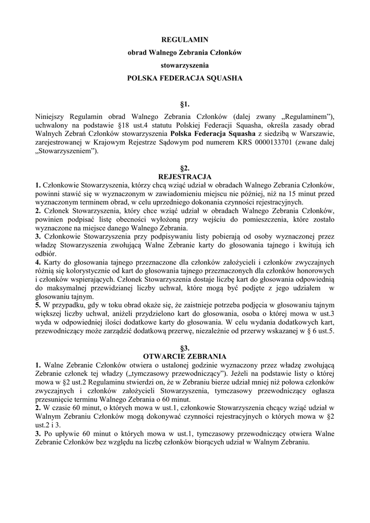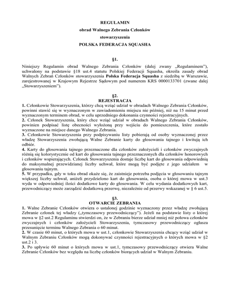 REGULAMIN obrad Walnego Zebrania Członków stowarzyszenia POLSKA FEDERACJA SQUASHA §1. Niniejszy Regulamin obrad Walnego Zebrania Członków (dalej zwany „Regulaminem”), uchwalony na podstawie §18 ust.4 statutu Polskiej Federacji Squasha, określa zasady obrad Walnych Zebrań Członków stowarzyszenia Polska Federacja Squasha z siedzibą w Warszawie, zarejestrowanej w Krajowym Rejestrze Sądowym pod numerem KRS 0000133701 (zwane dalej „Stowarzyszeniem”). §2. REJESTRACJA 1. Członkowie Stowarzyszenia, którzy chcą wziąć udział w obradach Walnego Zebrania Członków, powinni stawić się w wyznaczonym w zawiadomieniu miejscu nie później, niż na 15 minut przed wyznaczonym terminem obrad, w celu uprzedniego dokonania czynności rejestracyjnych. 2. Członek Stowarzyszenia, który chce wziąć udział w obradach Walnego Zebrania Członków, powinien podpisać listę obecności wyłożoną przy wejściu do pomieszczenia, które zostało wyznaczone na miejsce danego Walnego Zebrania. 3. Członkowie Stowarzyszenia przy podpisywaniu listy pobierają od osoby wyznaczonej przez władzę Stowarzyszenia zwołującą Walne Zebranie karty do głosowania tajnego i kwitują ich odbiór. 4. Karty do głosowania tajnego przeznaczone dla członków założycieli i członków zwyczajnych różnią się kolorystycznie od kart do głosowania tajnego przeznaczonych dla członków honorowych i członków wspierających. Członek Stowarzyszenia dostaje liczbę kart do głosowania odpowiednią do maksymalnej przewidzianej liczby uchwał, które mogą być podjęte z jego udziałem w głosowaniu tajnym. 5. W przypadku, gdy w toku obrad okaże się, że zaistnieje potrzeba podjęcia w głosowaniu tajnym większej liczby uchwał, aniżeli przydzielono kart do głosowania, osoba o której mowa w ust.3 wyda w odpowiedniej ilości dodatkowe karty do głosowania. W celu wydania dodatkowych kart, przewodniczący może zarządzić dodatkową przerwę, niezależnie od przerwy wskazanej w § 6 ust.5. §3. OTWARCIE ZEBRANIA 1. Walne Zebranie Członków otwiera o ustalonej godzinie wyznaczony przez władzę zwołującą Zebranie członek tej władzy („tymczasowy przewodniczący”). Jeżeli na podstawie listy o której mowa w §2 ust.2 Regulaminu stwierdzi on, że w Zebraniu bierze udział mniej niż połowa członków zwyczajnych i członków założycieli Stowarzyszenia, tymczasowy przewodniczący ogłasza przesunięcie terminu Walnego Zebrania o 60 minut. 2. W czasie 60 minut, o których mowa w ust.1, członkowie Stowarzyszenia chcący wziąć udział w Walnym Zebraniu Członków mogą dokonywać czynności rejestracyjnych o których mowa w §2 ust.2 i 3. 3. Po upływie 60 minut o których mowa w ust.1, tymczasowy przewodniczący otwiera Walne Zebranie Członków bez względu na liczbę członków biorących udział w Walnym Zebraniu. §4. WYBÓR PRZEWODNICZĄCEGO, SEKRETARZA I KOMISJI SKRUTACYJNEJ 1. Tymczasowy przewodniczący wzywa zgromadzonych do zgłaszania kandydatów na przewodniczącego Zebrania, sekretarza oraz członków dwuosobowej komisji skrutacyjnej. Na sekretarza oraz na członków komisji skrutacyjnej mogą być powołane osoby niebędące członkami Stowarzyszenia. 2. Po zgłoszeniu kandydatów przewodniczący zarządza głosowanie tajne w przedmiocie ich wyboru. Uchwały w sprawie wyboru przewodniczącego, sekretarza i członków komisji skrutacyjnej zapadają zwykłą większością głosów zgromadzonych członków Stowarzyszenia. W razie równości głosów decyduje głos tymczasowego przewodniczącego. W przypadku, gdy jest więcej kandydatów do objęcia danej funkcji – daną funkcję obejmują ci spośród kandydatów, którzy uzyskali kolejno największą liczbę głosów. 3. Po dokonaniu wyboru przewodniczącego – dalsze obrady prowadzi przewodniczący Walnego Zebrania Członków. Przewodniczący może korzystać z pomocy prawników oraz innych ekspertów obecnych na Zebraniu. Przewodniczący podpisuje listę obecności członków Stowarzyszenia. 4. W razie nie dokonania wyboru komisji skrutacyjnej, jej czynności wykonuje przewodniczący. 5. Jeżeli na Zebraniu są obecne osoby inne niż członkowie Stowarzyszenia i ich przedstawiciele, przewodniczący informuje o ich obecności. §5. DOKUMENTOWANIE OBRAD 1. Przebieg obrad jest protokołowany przez sekretarza. Projekt protokołu dostarcza tymczasowy przewodniczący. Do czasu powołania sekretarza, protokół sporządza tymczasowy przewodniczący. 2. Protokół z zakończonych obrad podpisuje co najmniej przewodniczący, tymczasowy przewodniczący, sekretarz oraz członkowie komisji skrutacyjnej. Protokół może zostać sporządzony w więcej niż jednym egzemplarzu. 3. Oryginał protokołu wraz z załącznikami przechowuje Zarząd Stowarzyszenia. 4. Skan protokołu wraz z załącznikami jest publikowany w terminie 7 dni od dnia zakończenia obrad na stronie internetowej Stowarzyszenia. 5. Na żądanie członka Stowarzyszenia Zarząd Stowarzyszenia sporządza i doręcza mu odpis protokołu poświadczony przez siebie za zgodność z oryginałem. Zarząd może uzależnić sporządzenie i wydanie odpisu protokołu od uiszczenia przez członka Stowarzyszenia niezbędnych kosztów sporządzenia i wydania odpisu. §6. PRZEBIEG OBRAD 1. Obrady odbywają się według porządku obrad zaproponowanego przez władzę Stowarzyszenia zwołującą Zebranie w zawiadomieniu o zwołaniu Walnego Zebrania Członków, z uwzględnieniem zmian wprowadzonych przez Walne Zebranie Członków. 2. Obrady prowadzi przewodniczący. 3. Uczestnik Walnego Zebrania będący członkiem Stowarzyszenia ma prawo zgłosić uwagi do każdego kolejnego punktu porządku obrad aktualnie rozpatrywanego. Uczestnik, który chce zabrać głos, winien zasygnalizować to przewodniczącemu przez podniesienie ręki. Głosu udziela przewodniczący. Przewodniczący zarządza zaprotokołowanie uwag mających merytoryczne znaczenie dla danego punktu obrad. Przewodniczący może